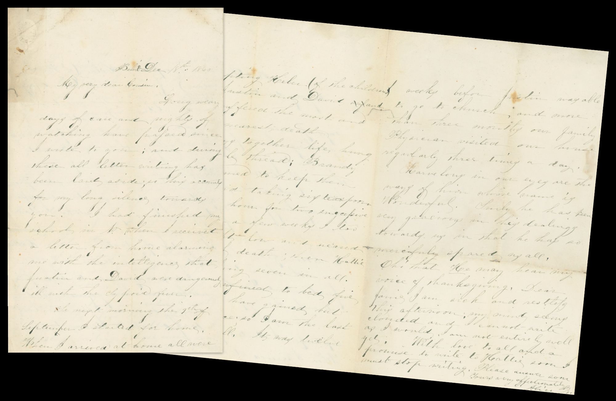 Other letters from Harriet and Jane discuss school, family, and especially health; a number of deadly diseases were rampant throughout the century, and many letters read as litanies of dead and dying friends and family. The CDVs from this era, mainly taken in studios in Blairsville, seem to be mostly family friends or employees at the Female Seminary; many of the subjects are identified verso.