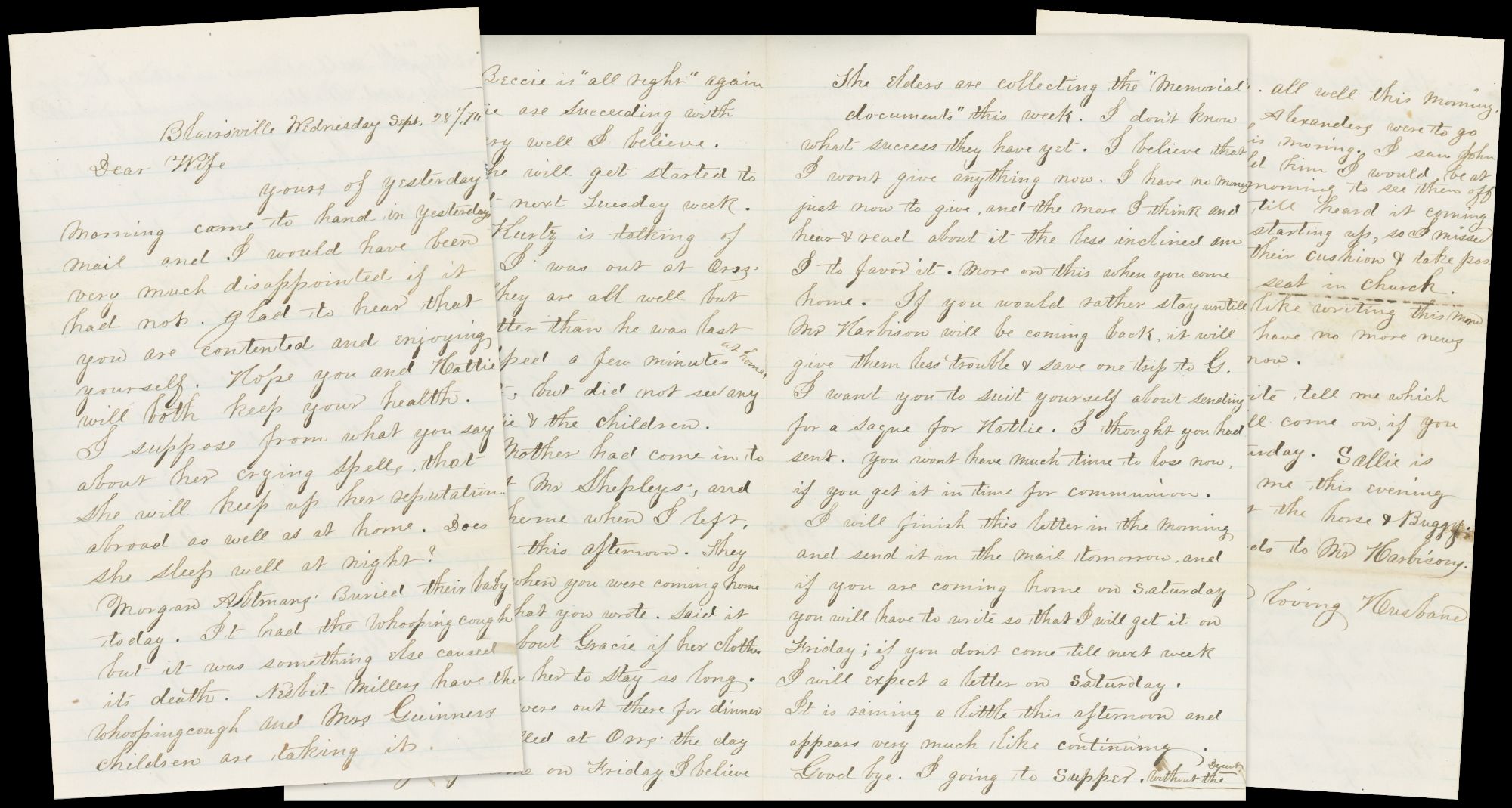 “I was in sewing for the Soldiers yesterday. I made a Havelock. I guess there were over thirty ladies there sewing. The Bardstown ladies are making clothing for Capt. S[?]’s company. They leave on next Monday. [...] I went in early last Monday morning to see our company off. The flag was presented by Mr Beaumin to Capt. Nesbit. Then Mrs Thompson & Luther Martin presented Testaments & ‘Prayer Books’ (some of Mrs. McAfee’s work) they then marched up to the depot followed by men women & children. Such a sight I never witnessed. Some of the soldiers (large men) cried like children – bade goodbye to every body – men that I never saw before came up & bade me goodbye & then turned their heads away to hide the tears. [...] But to go back to our Sewing Society you ask ‘will they really do anything’? I tell you they really have done something. Made seventy five shirts (& intend making so many more) of blue & red flannel, & forty five or fifty Havelocks, about thirty five towels, eighty pin cushions (or needle books). Then when the company went away the ladies supplied them with either a blanket or a comfort apiece [...] The ladies also intend making bandages or something to fasten tight round their stomachs to keep them from taking dysentery so readily.” (June 4, 1861)