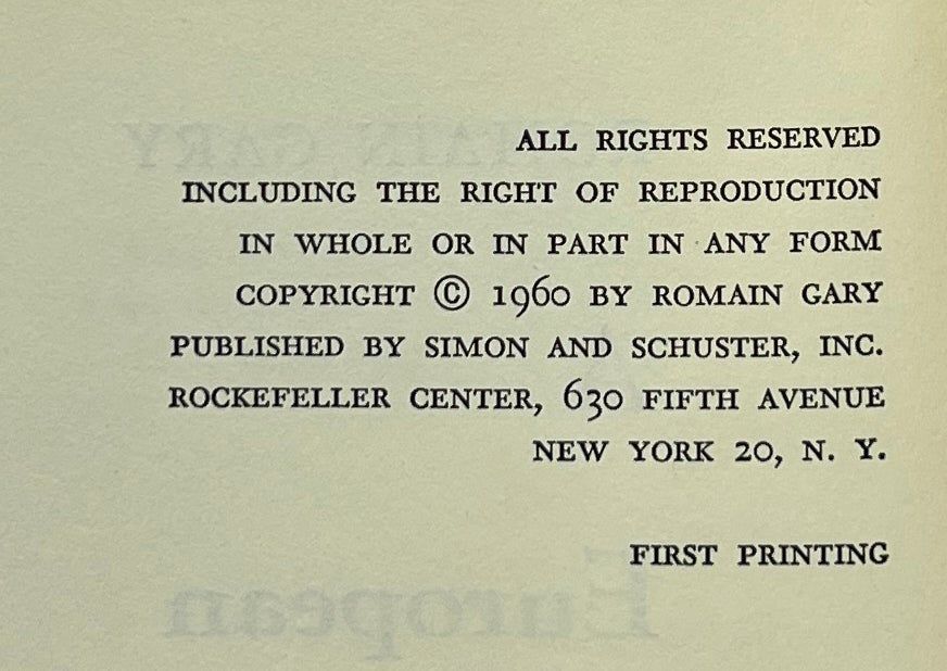 New York: Simon and Schuster, 1960. First Edition. Hardcover. Near Fine/Very Good. Near Fine in a Very Good jacket, unclipped ($3.75), a sticker remnant on the spine, chipped at the head of the spine. Quarter grey cloth with dark grey paper on the boards. Square and firmly bound with a black topstain, some soiling at the edges, clean internally. Gary's prize-winning novel of "a boy fighting with the partisans in the forests of Poland under conditions of extreme stress and peril and receiving what he calls, at first ironically, his 'European Education' of hate, killing and destruction.