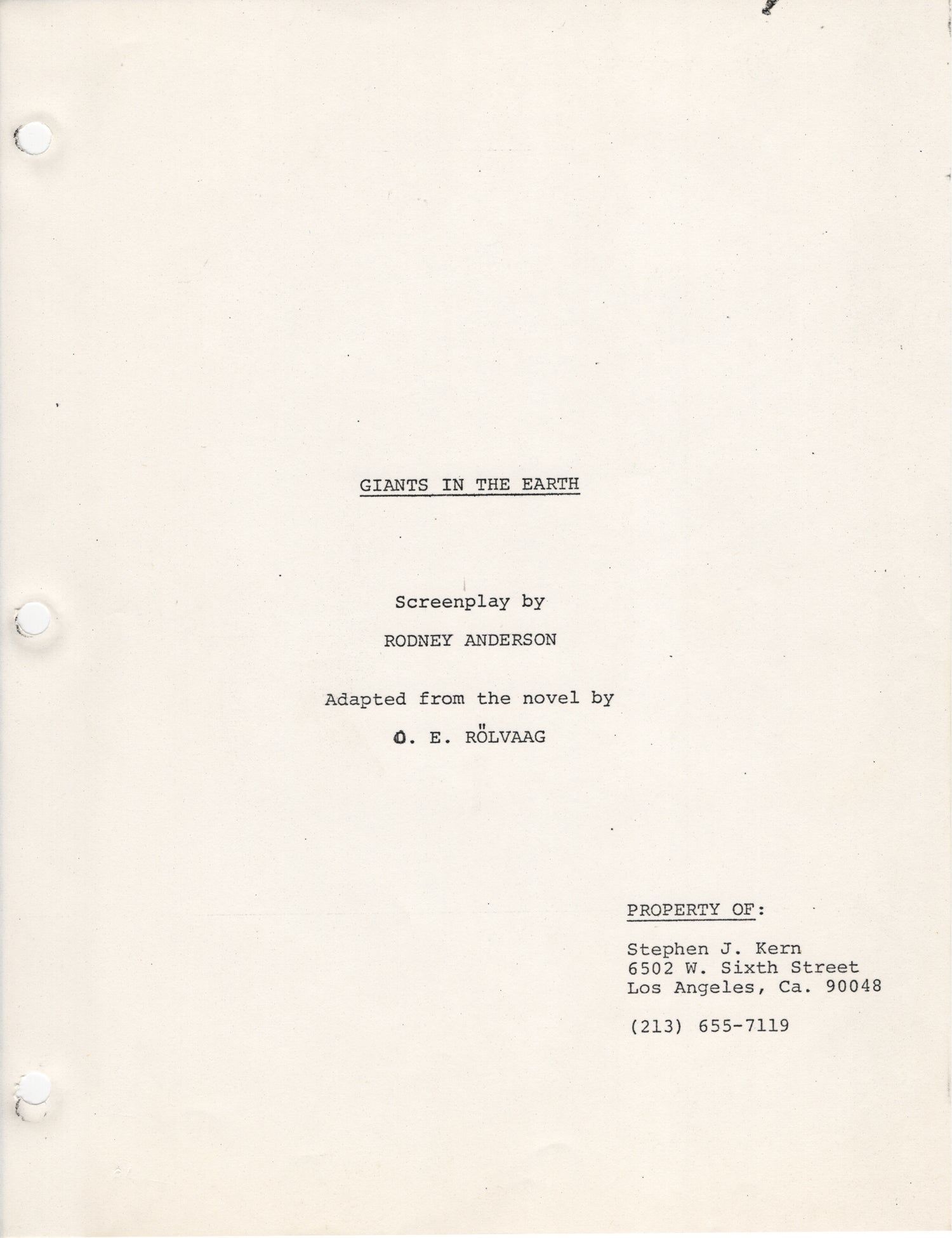 White untitled wrappers. Title page present, with credits for screenwriter Rodney Anderson and author O.E. Rolvaag. 146 leaves, with last page of text numbered 141. Xerographically duplicated, rectos only. Pages Near Fine, wrapper Near Fine, bound internally with three gold brads.