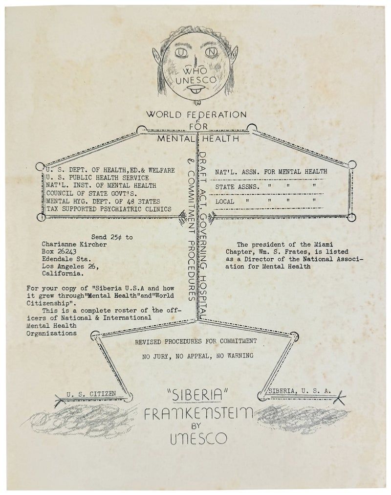 An unusual prospectus for what appears to be an unrecorded pamphlet titled "Siberia U.S.A.," decrying the WHO, UNESCO, and the World Federation for Mental Health and their revised procedures for commitment ("No Jury, No Appeal, No Warning"). The design of the illustration, more reminiscent of a vampire than Frankenstein, is composed almost entirely using typographic elements.