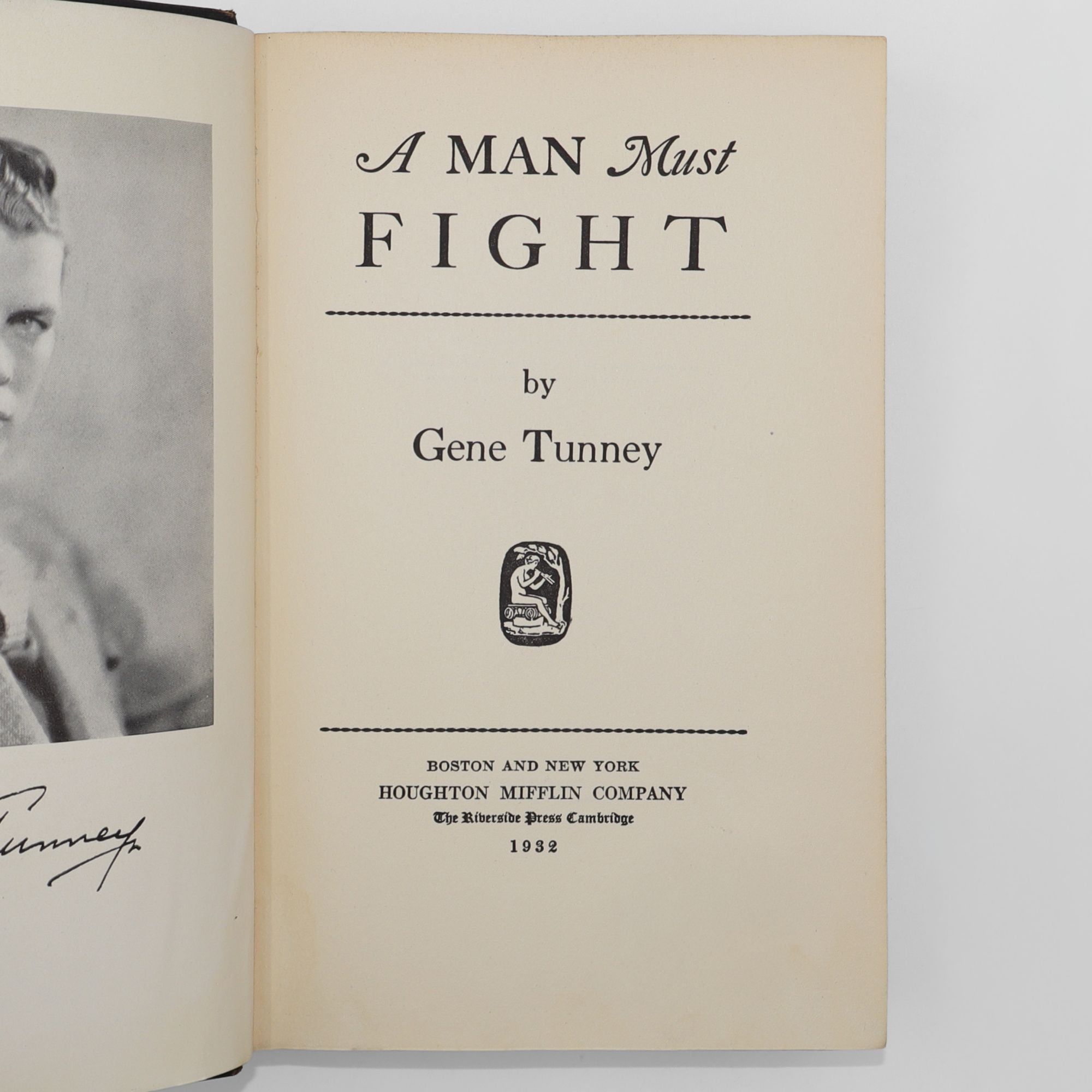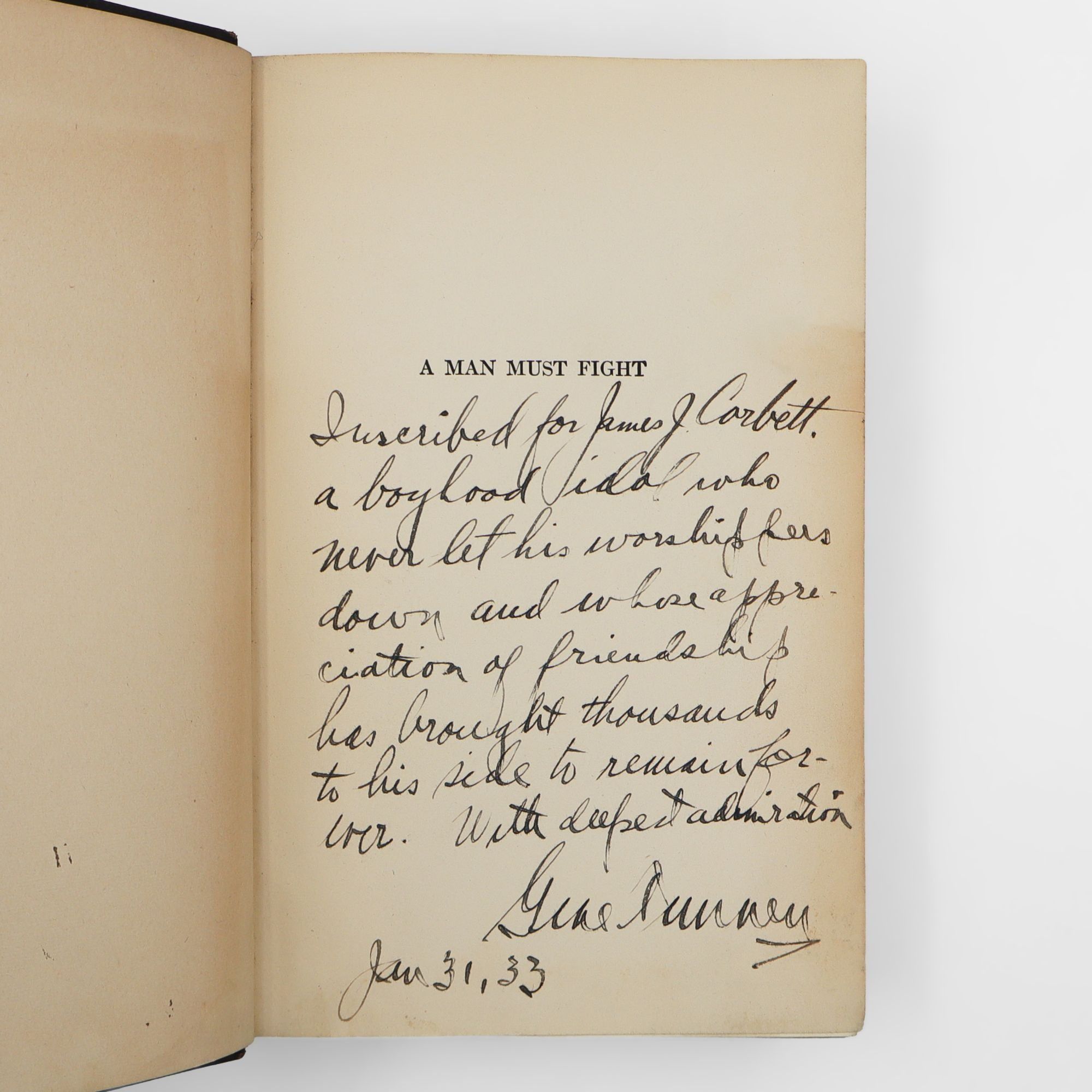 Boston: The Riverside Press, 1932. First edition. Portrait frontispiece. 288 pp. 1 vols. 8vo. Publisher's black cloth lettered in gilt, rubbed and slightly faded. Inscribed by author in pen to half-title page. Very good condition (without dust jacket). First edition. Portrait frontispiece. 288 pp. 1 vols. 8vo. Inscription reads "Inscribed to James J. Corbett, a boyhood idol who never let his worshippers down and whose appreciation of friendship has brought thousands to his side to remain forever. With deepest admiration Gene Tunney Jan 31, [19]33."
