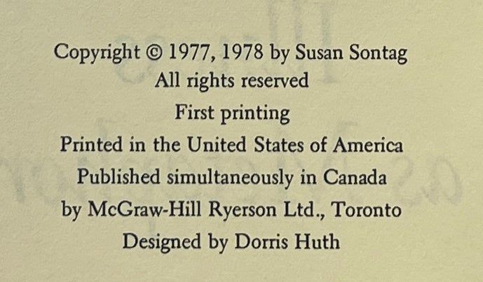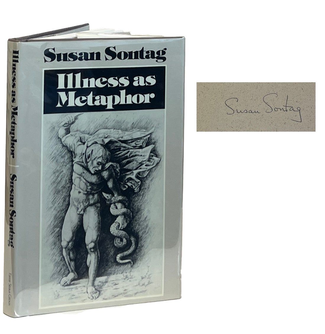 New York: Farrar, Straus and Giroux, 1978. First Edition. Hardcover. Fine/Fine. Signed by Sontag on the front endpaper. Fine in a Near Fine jacket, unclipped ($5.95), lightly toned and rubbed. Grey cloth with gilt lettering on the spine. Square and firmly bound, clean internally. Sontag's work that pushes back on portraying illness, specifically cancer, as a metaphor.