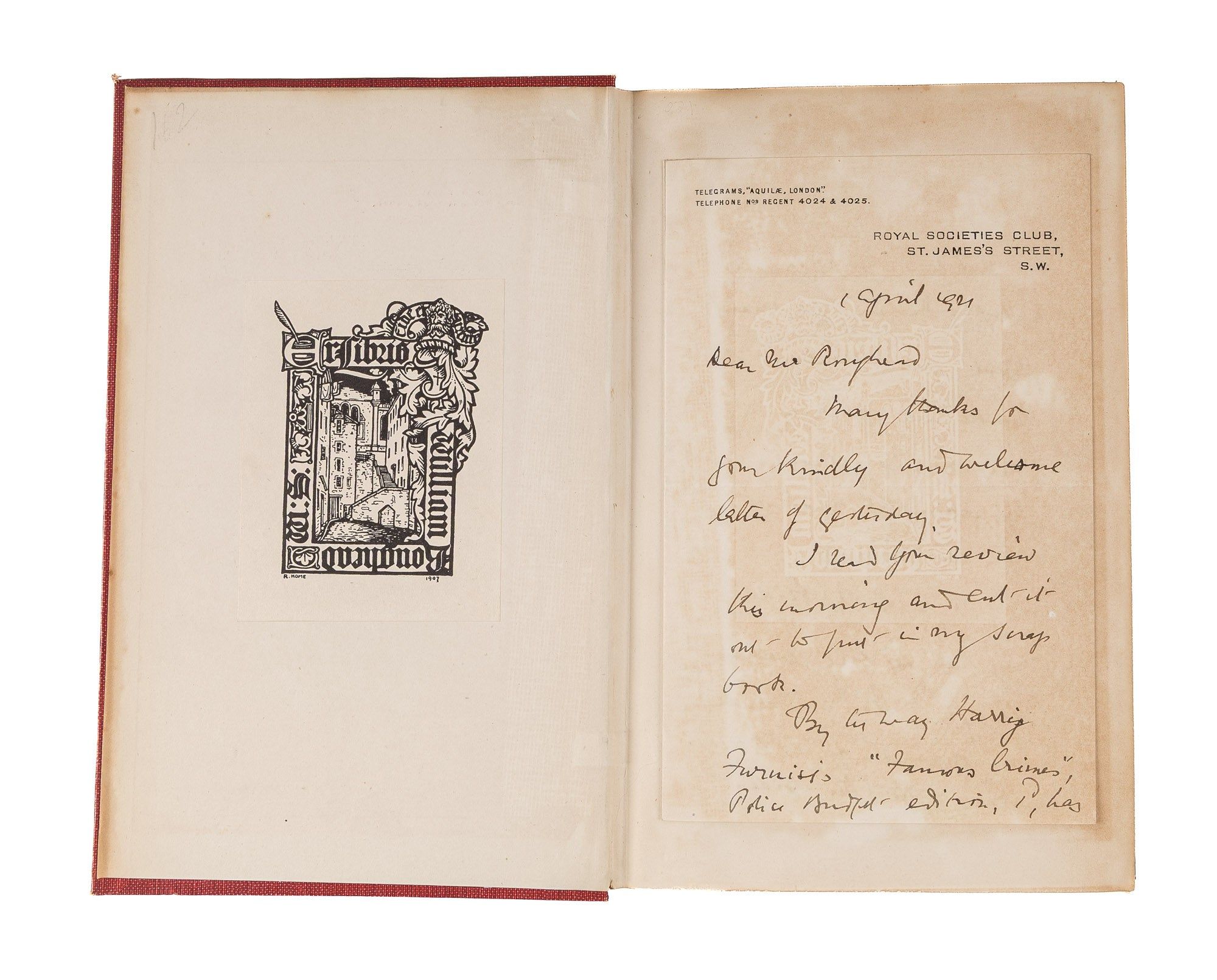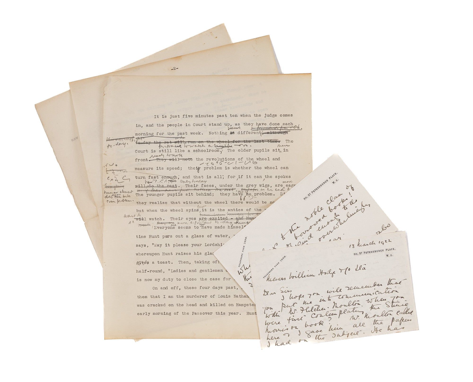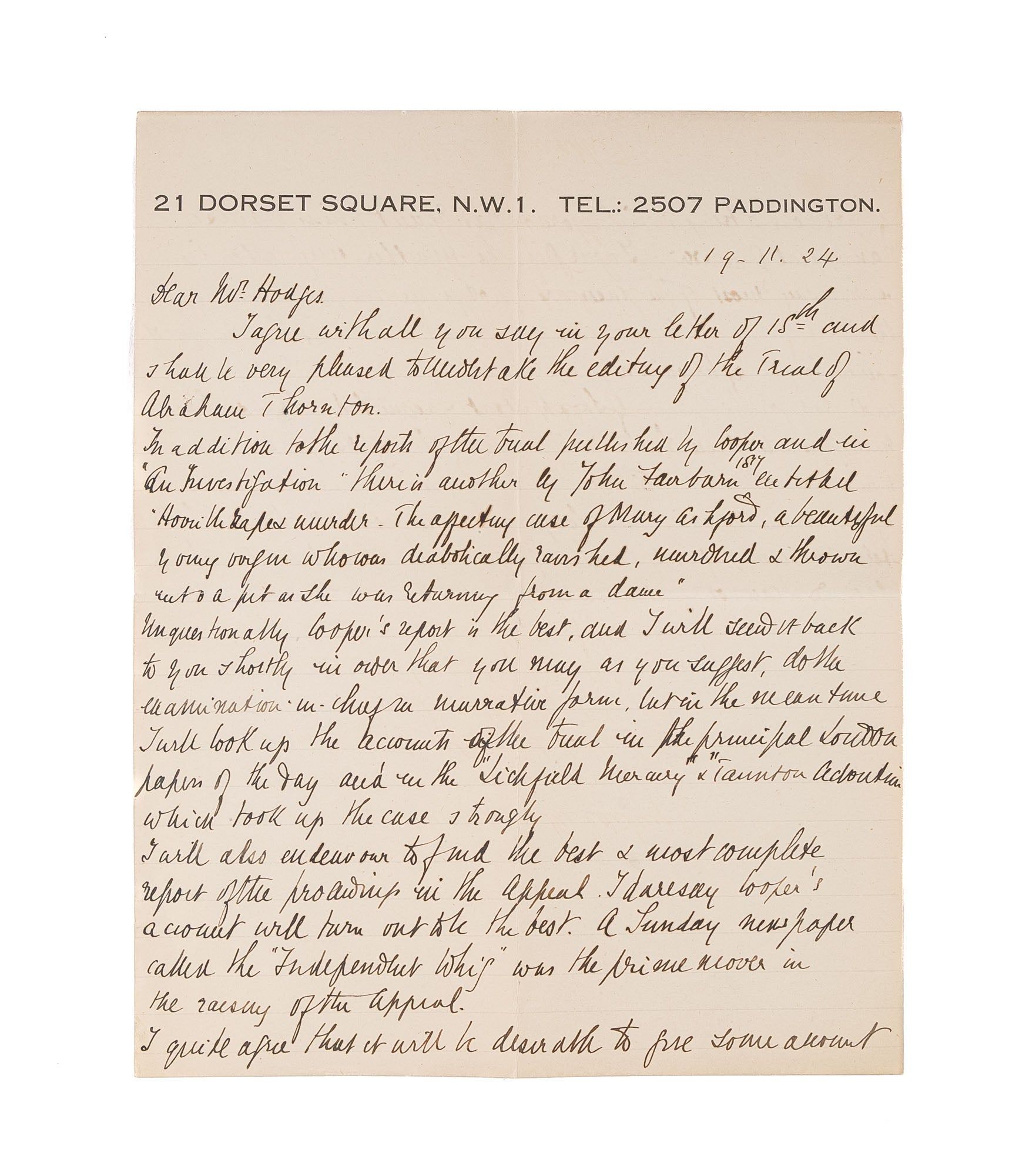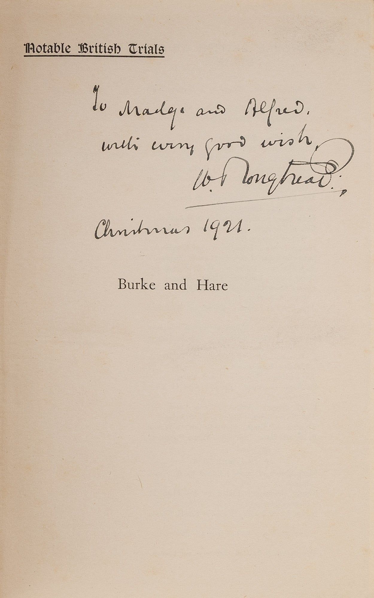 1905. London: William Hodge & Company, 1905-1959.. London: William Hodge & Company, 1905-1959. A Rare Complete Set, Several Volumes Have Interesting Associations, Inscriptions and Related Laid-in and Tipped-in Letters and Clippings [Trials]. Roughead, William [1870-1952], And Others, Editors. [Notable British Trials and Notable Scottish Trials]. London: William Hodge & Company, 1905-1959. Complete set, 83 volumes. 54 volumes in original cloth, 28 in dust jackets, 1 in calf. Moderate shelfwear to bindings and jackets, which are lightly soiled, hinges of a few volumes cracked or starting. Moderate toning to interiors, some volumes have light foxing in places, several volumes have bookplates, inscriptions, and tipped-in or laid-in letters and clippings to preliminaries (described below). A rare complete set with several unique volumes, all volumes in very good condition. $8,500. **THIS DESCRIPTION IS TRUNCATED DUE TO CHARACTER LIMITS. PLEASE CONTACT US FOR A COMPLETE VERSION.** * First editions. The volumes in this series offer thorough accounts of 83 famous cases, 72 British and 11 Scottish, tried between 1586 and 1953. Though written for general readers, they were produced to a high scholarly standard and have been cited in courts, legal scholarship and Parliament. Each volume contains a detailed introduction followed by an edited verbatim report of the proceedings and, where they exist, judgments on appeal. Some volumes have illustrations and appendices of original material. Several volumes in our set have notable features. Ten have bookplates and ownership markings of William Roughead, the primary editor of the series. Bookplates and similar markings are found in four volumes owned by another prominent series editor, F. Tennyson Jesse [1888-1958], the notable female criminologist and journalist. Nine, including four that belonged to Jesse, have the embossed stamp of Jonathan Goodman [1931-2008] an important British crime historian. One has the embossed stamp of Lane Kauffmann [1921-1988], an American writer known for his crime novels. Seven volumes, including the one bound in calf, are presentation copies from Roughead; nine volumes have presentation inscriptions of other editors. Among the laid-in and tipped-in items are letters to the publisher from volume editors, a three-page manuscript from the novelist Maude Annesley Brownlow [1871-1930], which is addressed to the series publish.