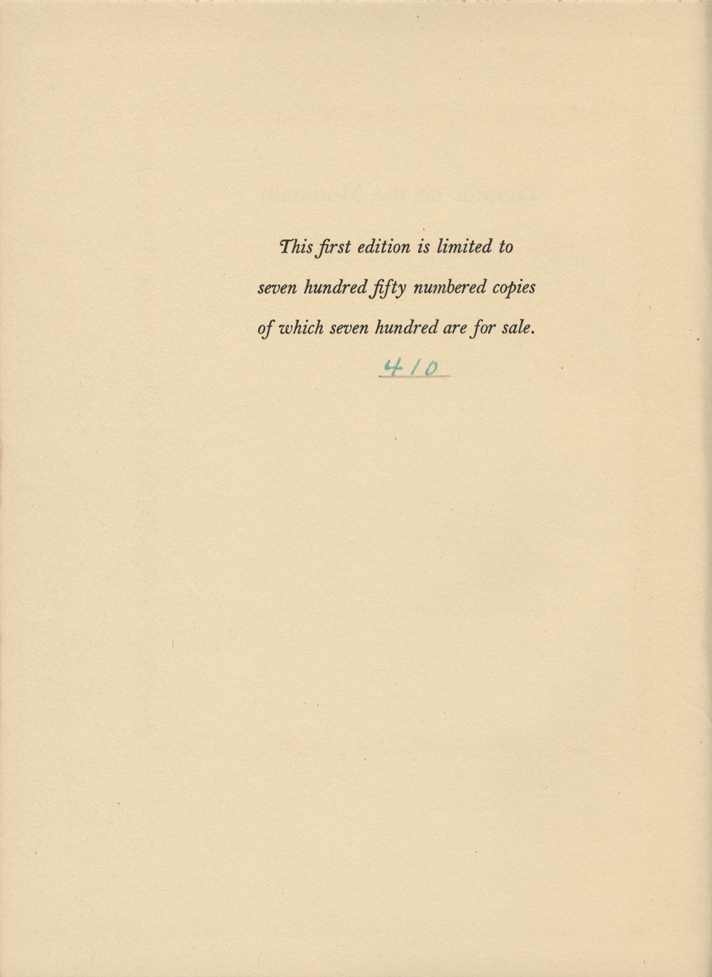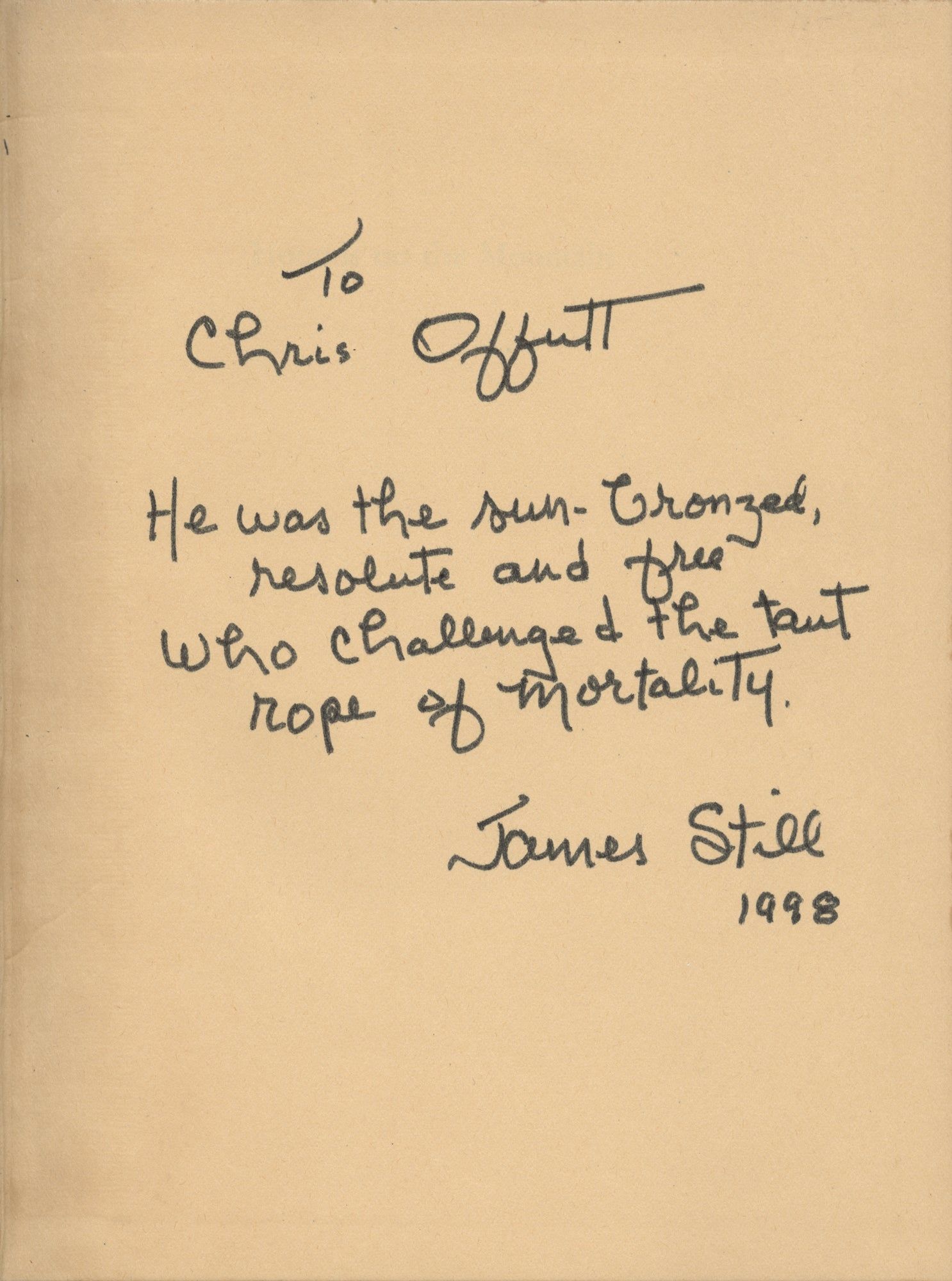 New York: Viking Press, 1937. First Edition. First Edition. One of 750 hand numbered copies (this being No. 410). Association Copy, INSCRIBED on the front endpaper to author Chris Offutt: "To / Chris Offutt / He was the sun-bronzed, resolute and free / who challenged the taut rope of mortality / James Still / 1998."