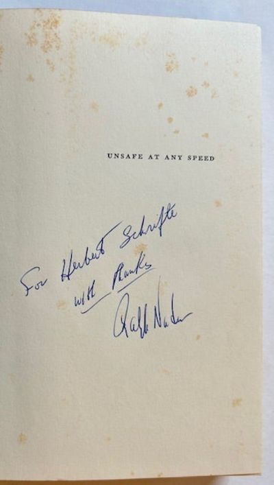 New York: Grossman Publishers, 1965. Cloth. Very Good/Very Good. INSCRIBED BY RALPH NADER on the half-title. A solid copy to boot of the 1965 correct 1st printing, the stated 1st printing. Tight and VG (foxing along the fore and bottom-edges and at the preliminaries) in a bright, price-intact ($5.95), VG dustjacket, with light creasing and several small closed tears along the panel edges. A degree of soiling as well to the rear panel. Subtitled "The Designed-In Dangers of the American Automobile", Nader's mid-60s expose only continues to grow in stature.