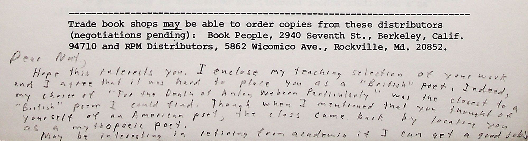 Silver Spring, MD: Barry Alpert, 1972-1975. First Editions. Eight quarto issues (28cm); mimeographed and offset-printed sheets, alternately saddle-stiched, stapled, and prefectbound into decorative card wrappers. This set is from the library of noted poet, translator, and anthropologist Nathaniel Tarn (1928-2024), with his penciled name appearing on the contents leaf of No.1, and a few issues bearing his light penciled marks in the margins. Issue No.3 has been lengthily inscribed to Tarn by editor Barry Alpert, who has also inscribed Nos.5 and 7; issue No.6 has been inscribed by Alpert to Hugh Kenner on the inner front cover. No.6 shows some modest toning and dust-soil to spine and covers, though clean internally; Very Good+. Remaining issues show light wear to extremities, a few faint surface scratches to front cover of No.1; Near Fine overall.