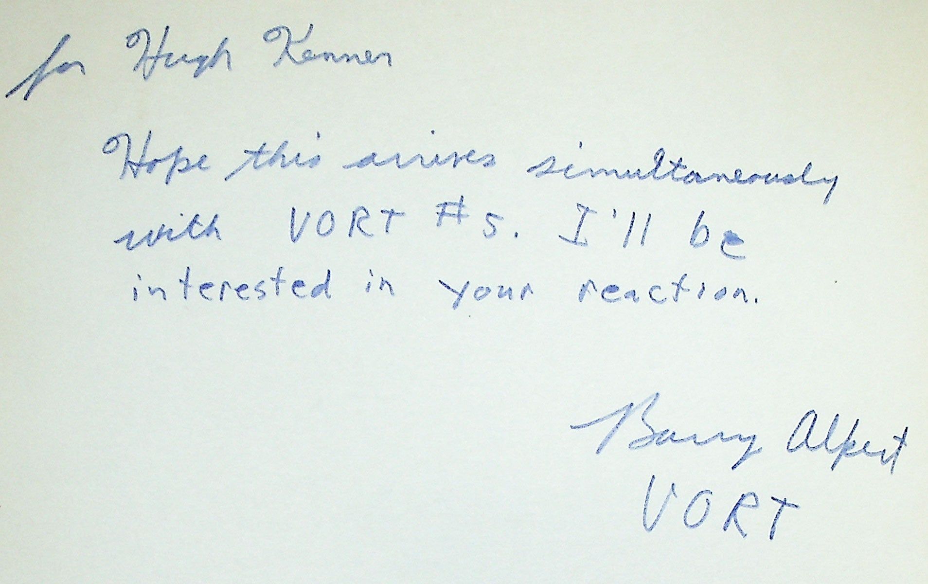 A near-complete run (lacking only the final issue) of Barry Alpert's short-lived little magazine published out of Silver Spring, Maryland. "For all but one of its nine issues, Vort followed the same pattern in its plain, large-format issues, creating a little critical universe for each of two authors...Perhaps more of an encyclopedia in parts than a magazine or journal, the issues included a photograph of each author, a small collection of each author's work, three or four critical studies, homages, commentaries, and long and detailed interviews with each author by editor Alpert...Vort is an unfortunately unfinished encyclopedia of the New American Poetry, but is still very useful for the information it contains and still important "for those to whom criticism is a fine art" (Clay & Phillips, p.245). Contributors include Ed Dorn, Tom Raworth, Anselm Hollo, Ted Berrigan, David Bromige, Ken Irby, Fielding Dawson, Jonathan Williams, Robert Kelly, David Antin, Jerome Rothenberg, Jackson Mac Low, and Armand Schwerner.