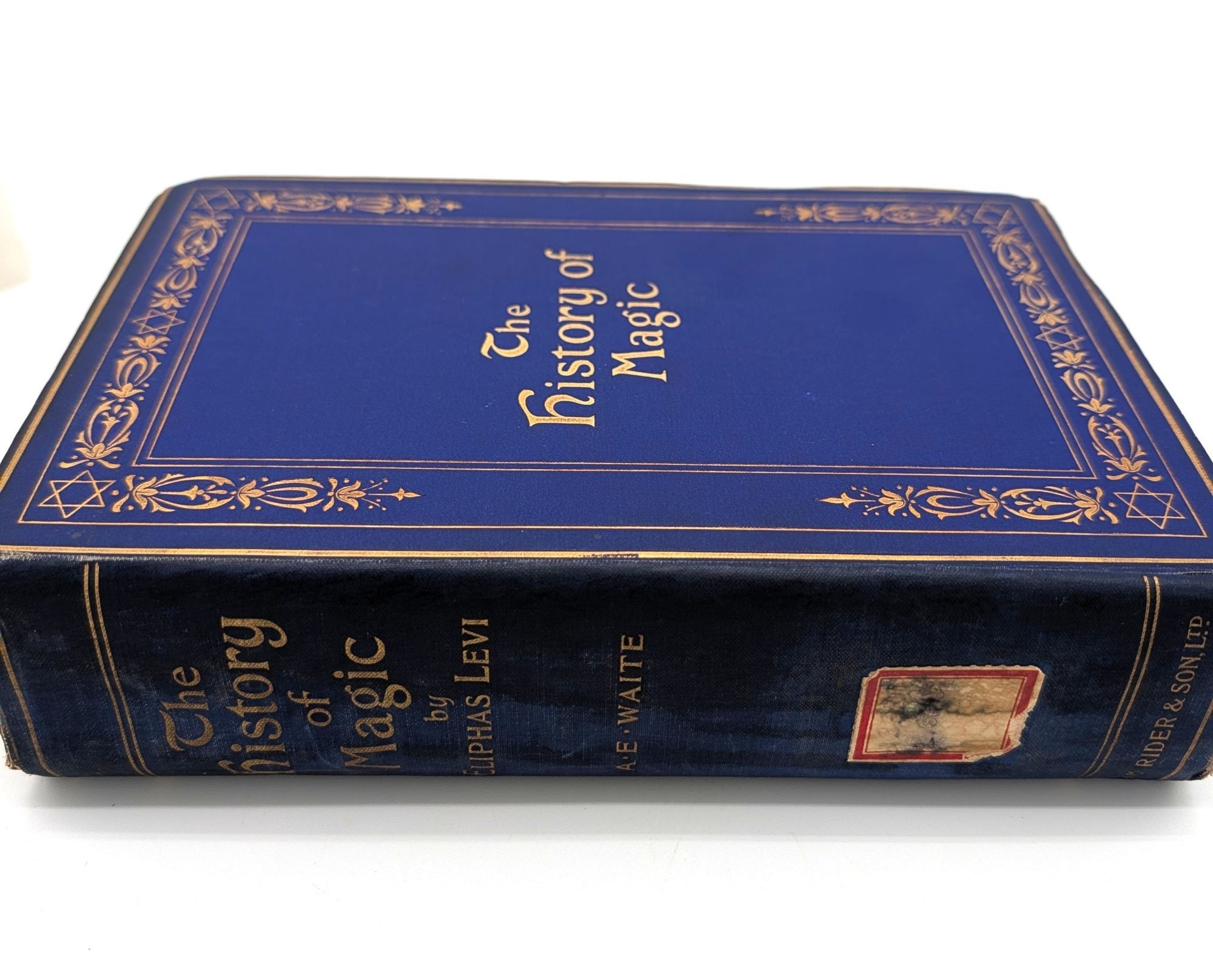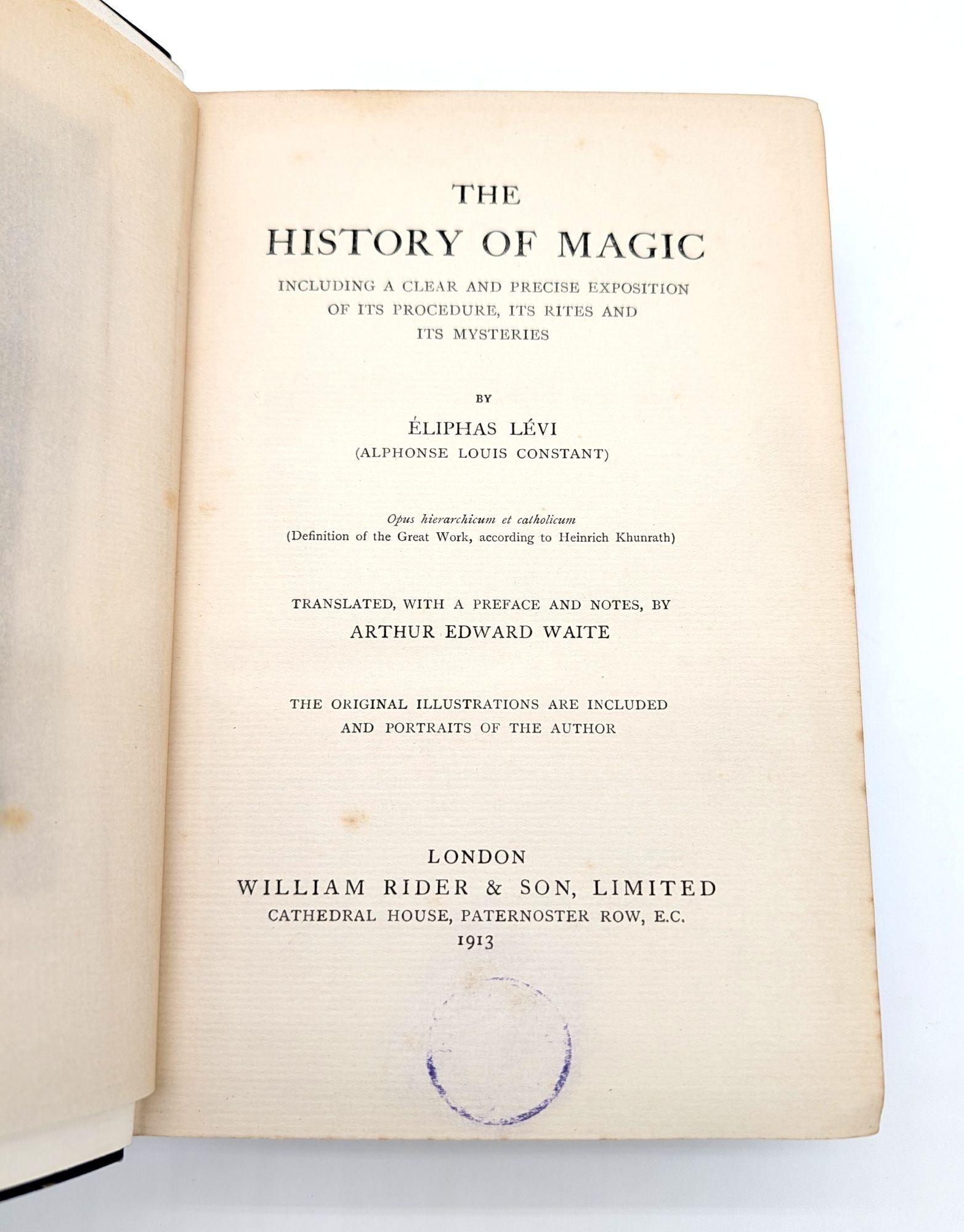 London: William Rider & Son, Limited, 1913. First edition in English. Hardcover. Good. 535pp. Thick octavo [23 cm] Blue cloth with gilt stamped titles on the backstrip and front board, and an ornately decorative border on the front board. Top edge gilt. Frontispiece portrait from a photograph of Éliphas Lévi. Ex-libris James D. Wardle with his usual markings and labels, and ink stamps on the spine and front pastedown. Wardle amassed an impressive library and was often called the "Socrates of State Street" [Salt Lake City, Utah]. Free endpapers darkened. Spine stained, but gilt still bright. Front endpaper cracked along the hinge, and hinge a bit soft. Text block cracked at p. 209, however the book is still very sturdy. Discreet ink stamp on title page. All plates present. Lévi's pivotal discourse on the history of Magick and the occult, translated, with a preface and notes, by Arthur Edward Waite. Arthur Edward Waite was a British poet and scholarly mystic who wrote extensively on occult and esoteric subjects and was co-creator of the widely popular Rider-Waite Tarot deck.