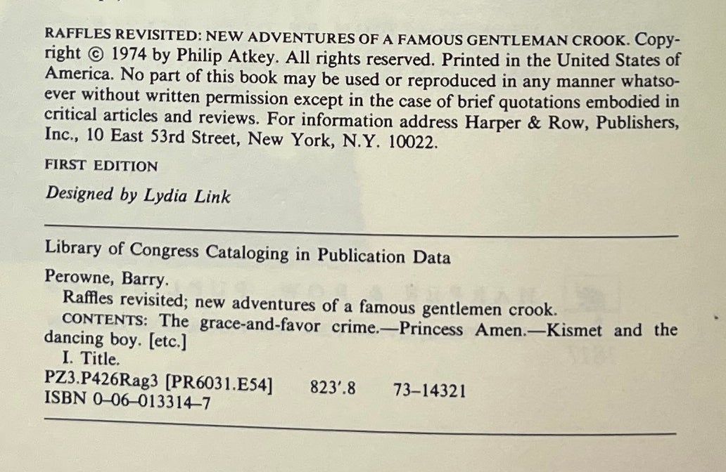 New York: Harper and Row, Publishers, 1974. First Edition. Hardcover. Very Good/Near Fine. Introduction by Otto Penzler. Drawings by Richard Rosenblum. Very Good in a Near Fine jacket, unclipped ($8.95), a few shallow chips at the head of the spine, toned at the flaps. Quarter black cloth with white cloth on the boards, some soiling. Square, bound with some reading wear, former owner's name on the front endpaper, clean otherwise. Perowne's resurrection of E.W. Hornung's turn-of-the-century gentleman thief.