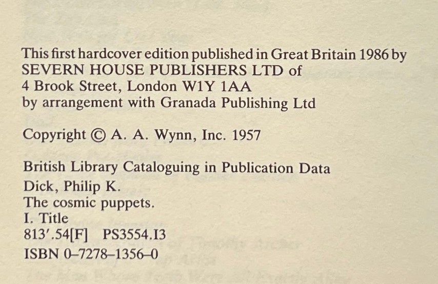 London: Severn House, 1986. First Edition Thus. Hardcover. Fine/Fine. Fine in a Fine jacket, unclipped (£8.50). Black cloth with gilt lettering on the spine. Square and firmly bound, clean internally. The first UK hardcover copy of this early Dick novel.