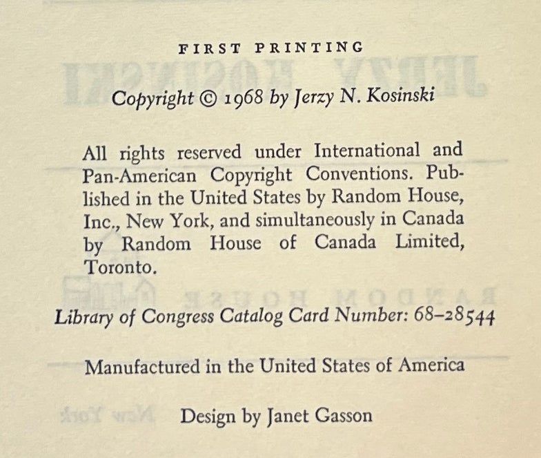 New York: Random House, 1968. First Edition. Hardcover. Near Fine/Fine. Near Fine in a Fine jacket, unclipped ($4.95). Quarter brown cloth with beige paper on the board. Square and firmly bound with an orange top stain, a circular spot of soiling, clean internally. Kosinski's National Book Award-winning novel comprised of a collection of vignettes about "a self freed for pure violence and absolute sexuality.