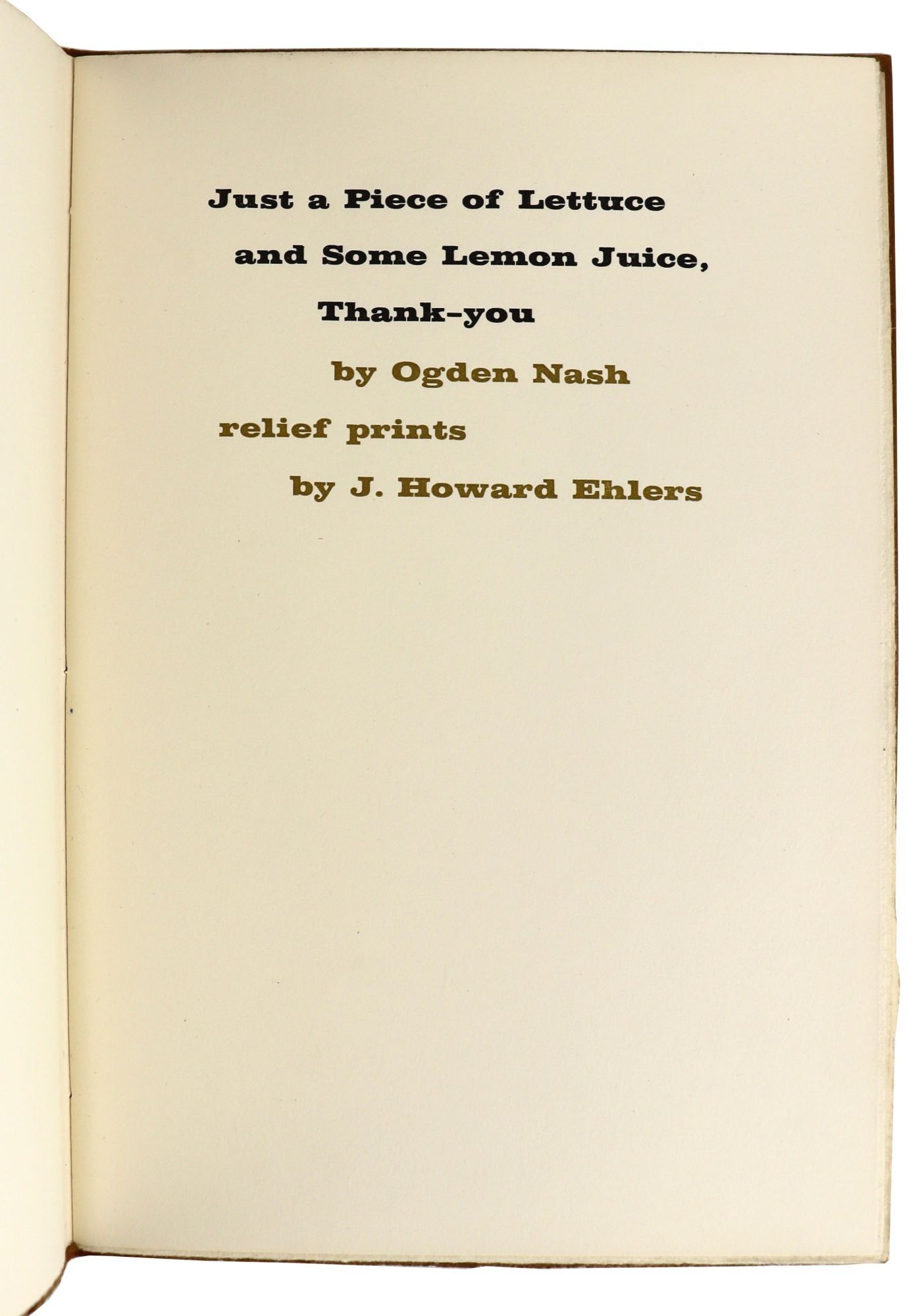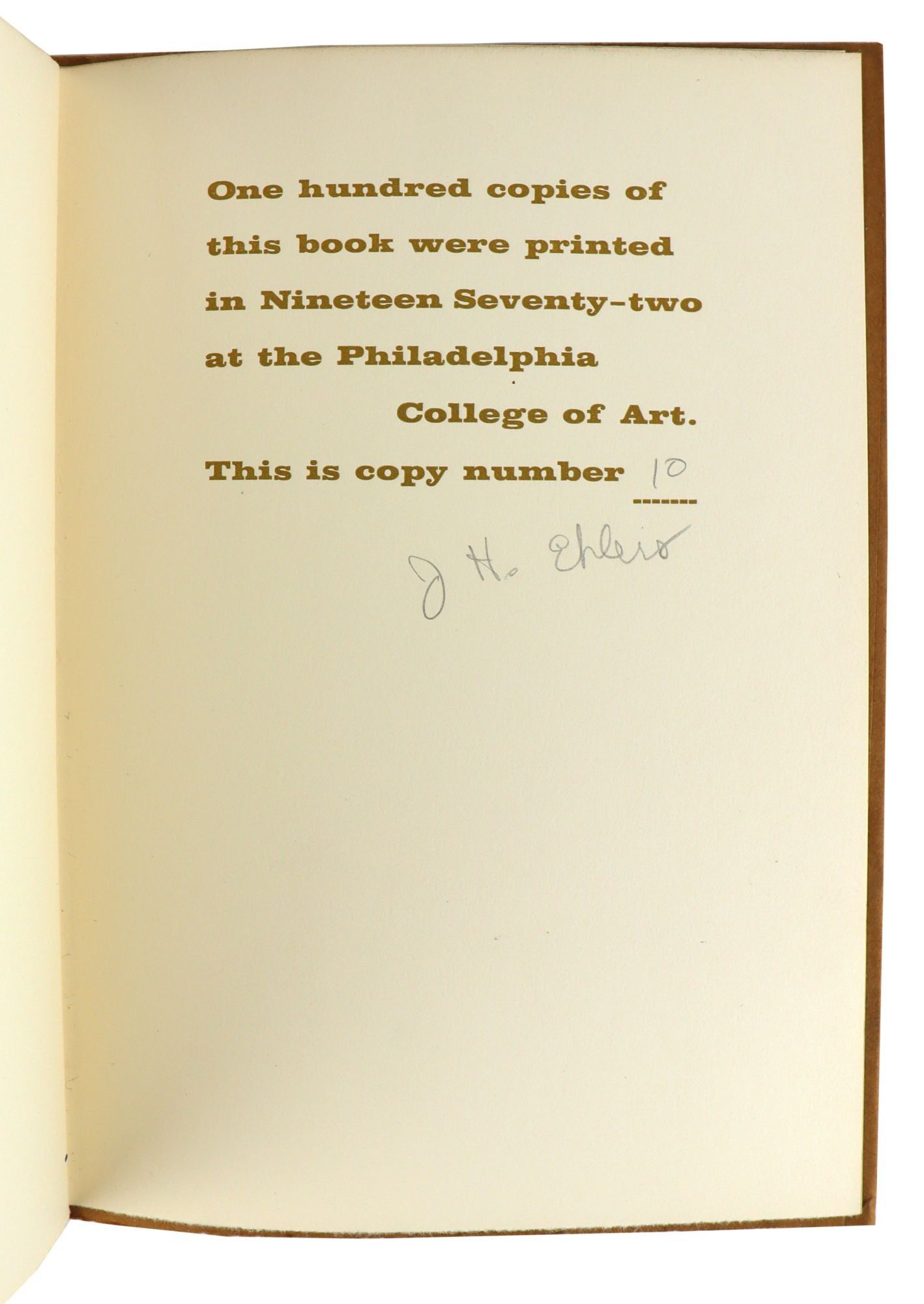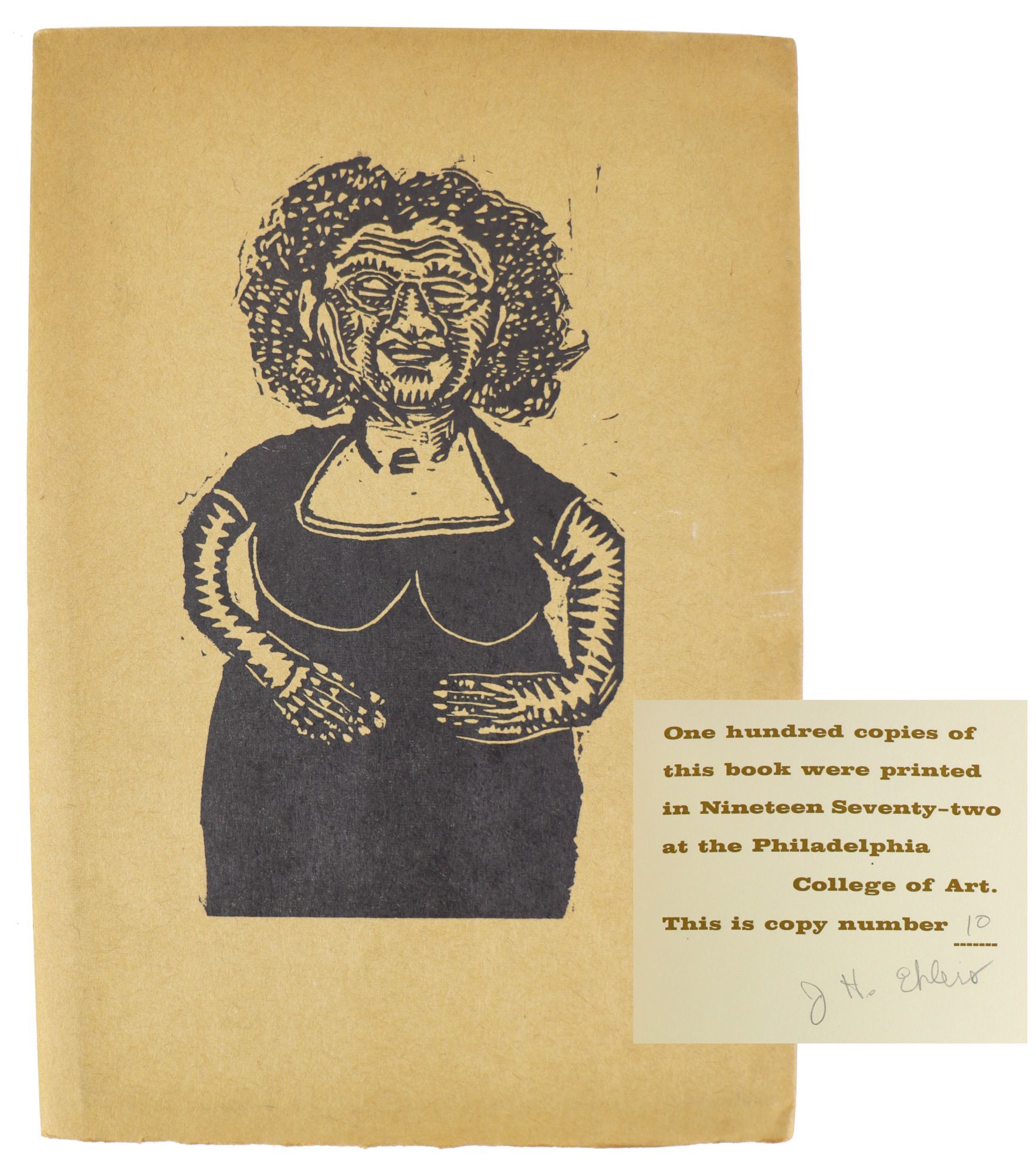 Philadelphia, PA: Philadelphia College of Art, 1972. Very Good. Philadelphia, PA: Philadelphia College of Art, 1972. Limited edition of 100 copes, of which this is copy number 10. Signed in pencil by illustrator J. H. Ehlers. Octavo (23cm); unpaginated. Very good condition. Unusual side-sewn binding with illustrated paper over boards. Unopened pages. Black and white prints throughout by Ehlers and text printed in green, yellow and orange ink. Small smudge on inside of front cover, likely made during the printing/binding process. Pages are otherwise clean and unmarked. Scarce. Only one copy found in OCLC. Published one year after Ogden's death in 1971.