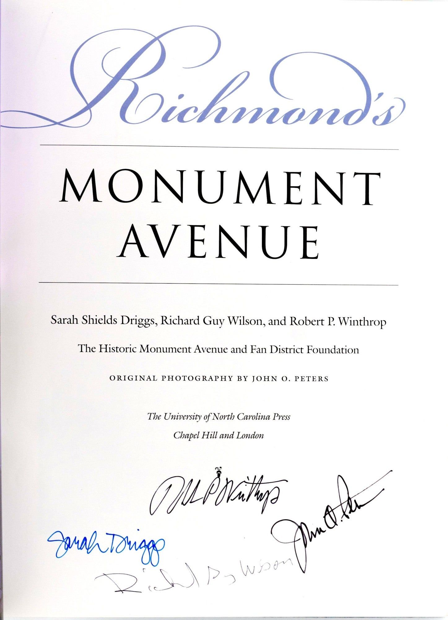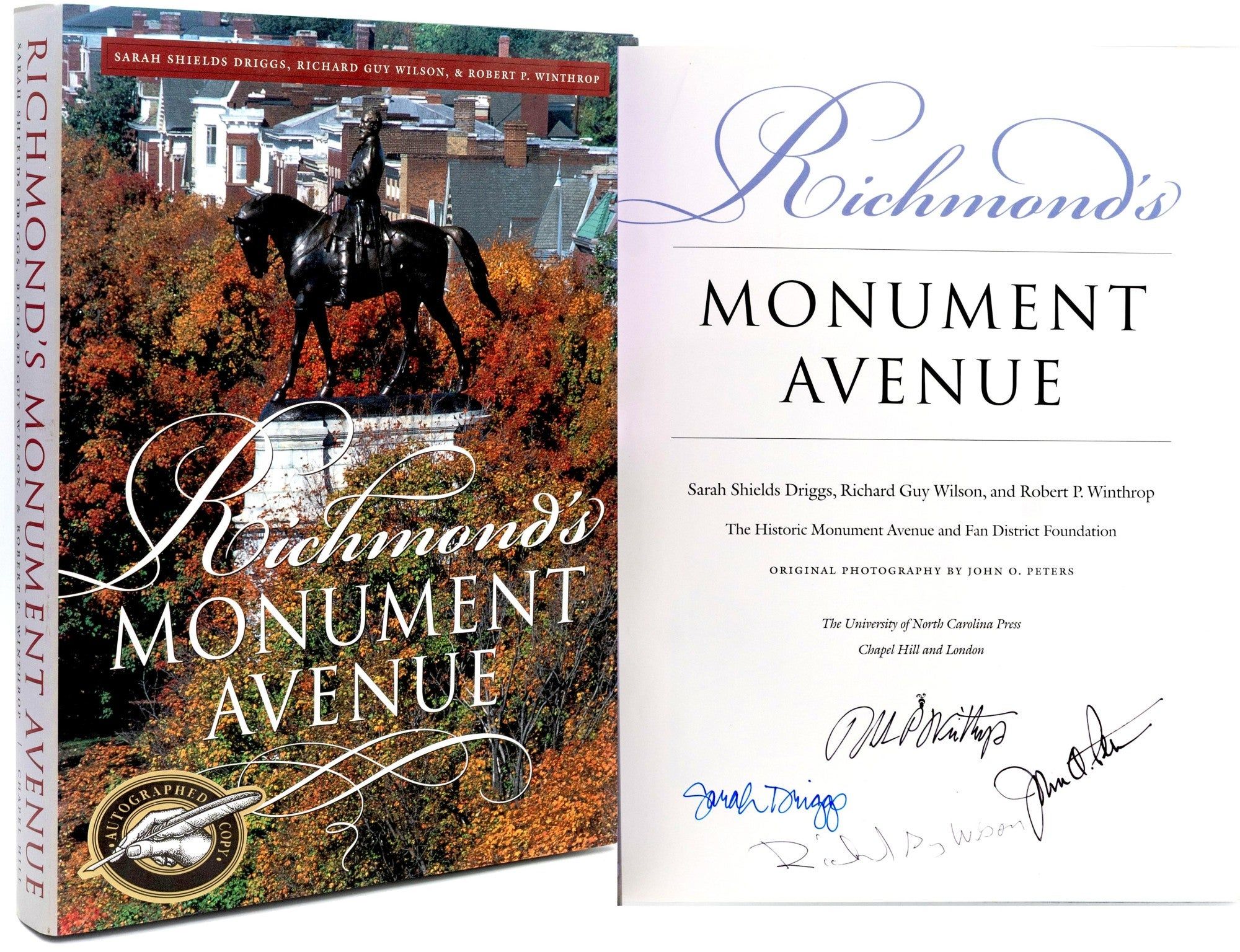 Chapel Hill: The University of North Carolina Press, 2001. First Edition. Hard Cover. Fine binding/Near Fine dust jacket. Signed. Quarto; in the publisher’s blue cloth binding, with dustjacket; this copy signed on the title page by Sarah Shields Driggs; Richcard Guy Wilson; Robert P Winthrop; and John O. Peters the photographer.~~There is a previous owner name dated Christmas, 2001 on the front endpaper.~~A most attractive signed First Edition copy of the book which has become the standard work on Monument Avenue. Fine binding / Near Fine dust jacket.