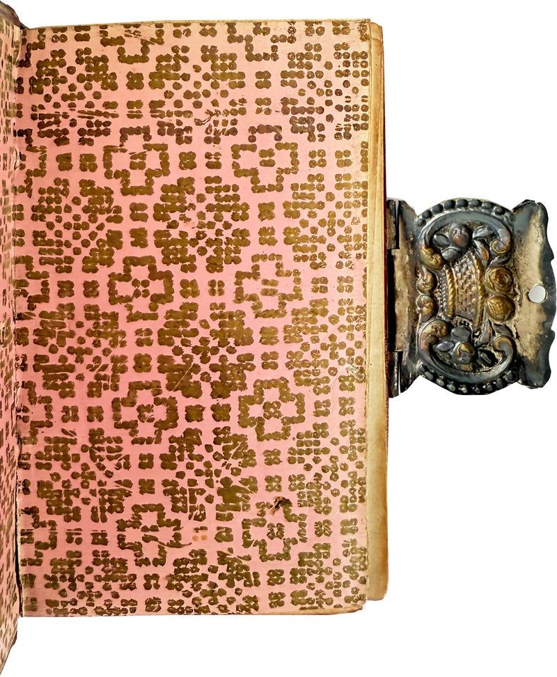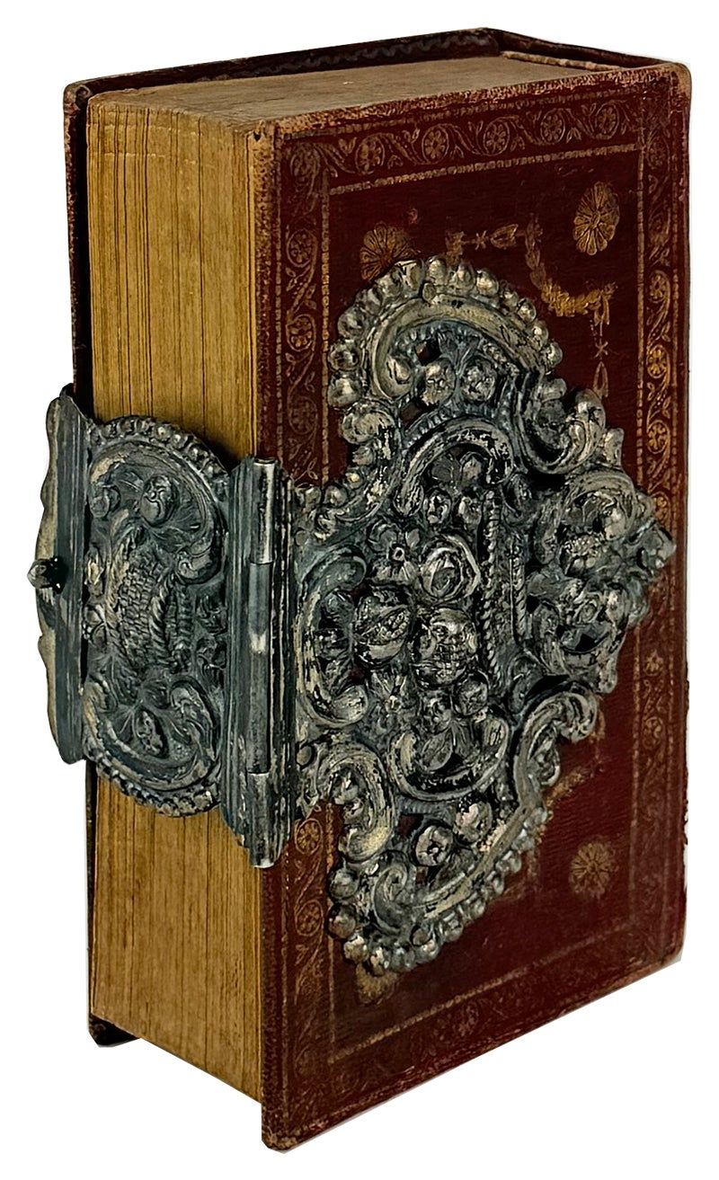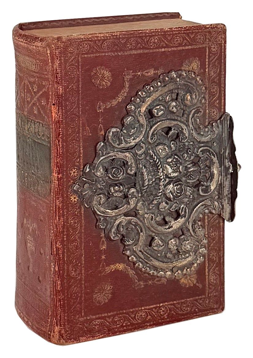 Oft-reprinted compilation of devotional literature--the first ten plates quite faint from having been repeatedly run through the press, though the impression of the fourteen plates representing the stations of the cross are much darker. This copy a happy blend of classical and Bohemian design, the enormous clasp in the shape of a woven basket filled with fruits and flowers nearly obscuring the French-style gilt tooling on the crimson goat binding. The endpapers, a geometric design on pink paper, are also quite striking.