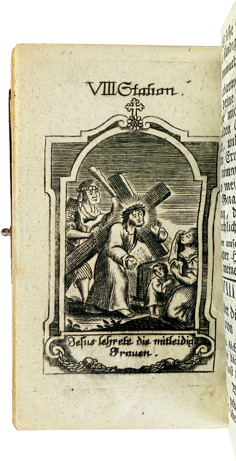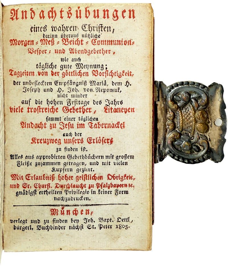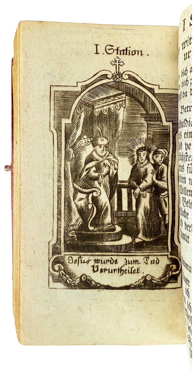Munchen [Munich]: Joh. Bapt. Oettl, 1805. Very Good. München: Joh. Bapt. Oettl, 1805. 12mo (15cm); full contemporary straight-grained crimson goat elaborately gilt-tooled, enhanced with rather oversized steel clasp, green gilt spine onlay, all edges gilt with stippled designs along fore-edges, pink and gilt decorative endpapers; 383,[25]pp.; steel-engraved frontispiece and twenty-three plates including fourteen of the stations of the cross bound towards the end of the volume (text and plates collated complete), text printed entirely in blackletter. Leather a bit dried and rubbed along margins, clasp tarnished, front hinge starting, else a Very Good, attractive example.