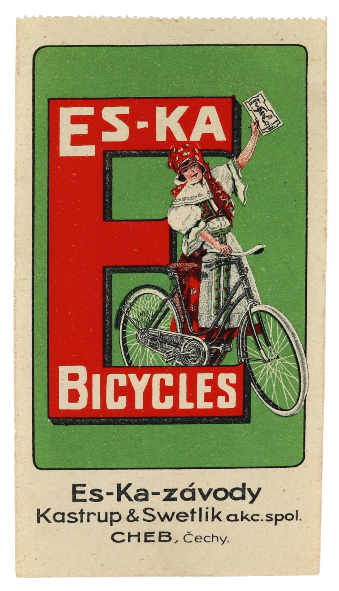 First called Elite, Es-Ka Bicycles was founded in Cheb, Czechoslovakia in 1911 by Ambros Swetlik and Heinrich Kastrup. Located in the far west of the country near the German border, Cheb was the center of a German-speaking region called Egerland. Though Es-Ka established Cheb a hub for bicycle manufacturing in the early twentieth century, the company halted production in 1941 when the city was seized by the German army. Cheb’s population remained overwhelmingly German until the end of World War II, when Czech resistance groups led a nationwide effort to expel ethnic Germans. The female subject of this advertising label wears traditional Czech folk clothing and poses with a low-slung woman’s bike frame.