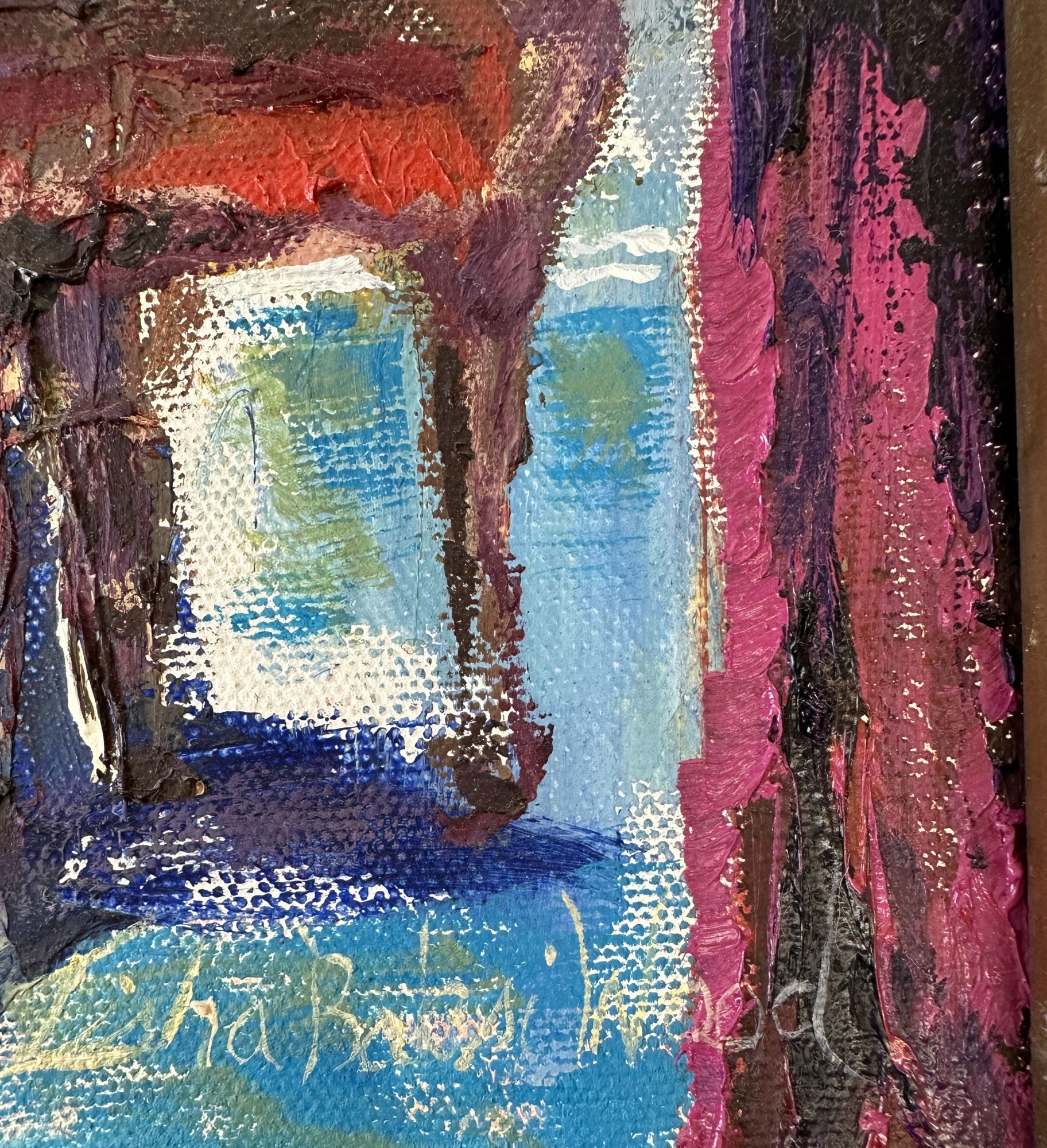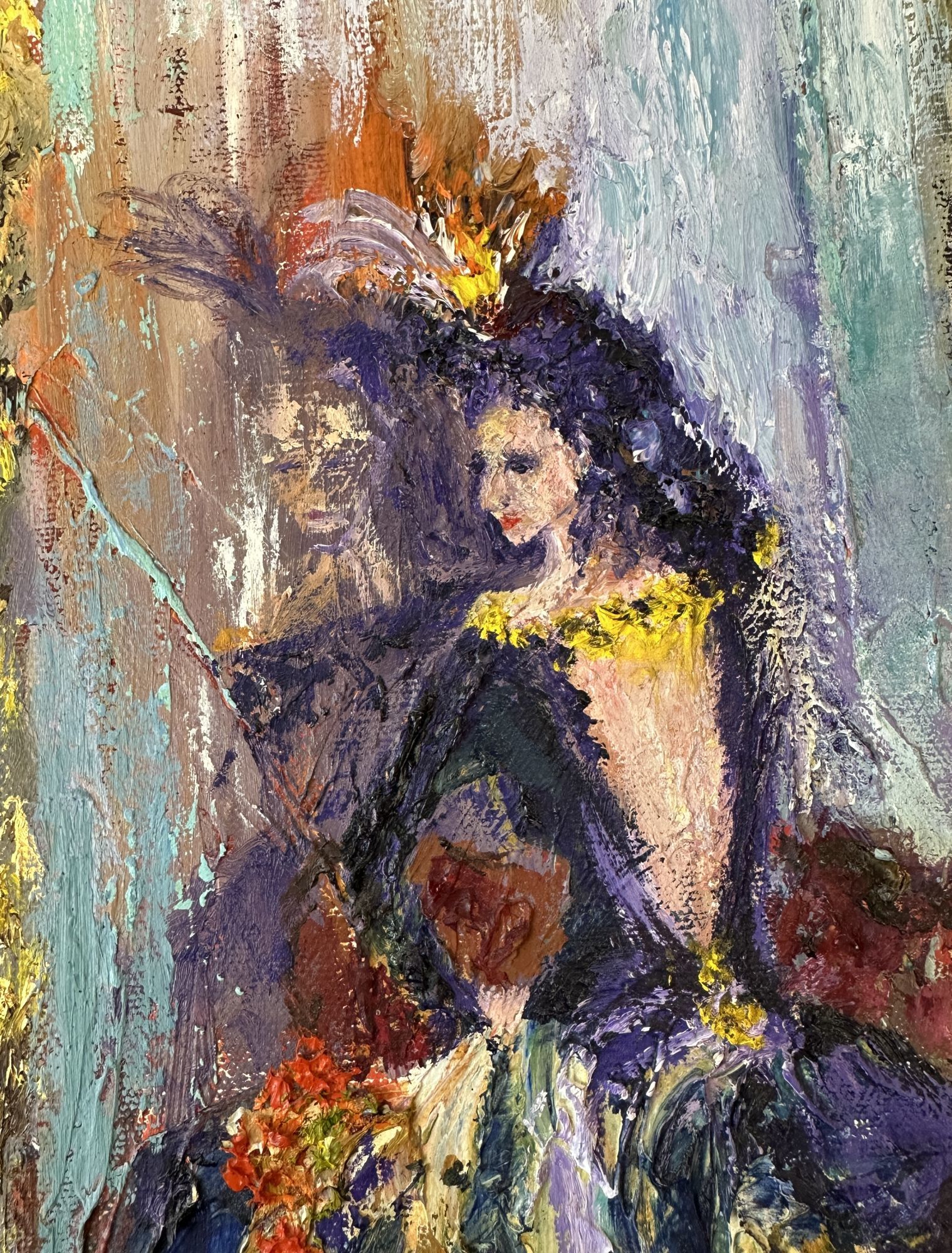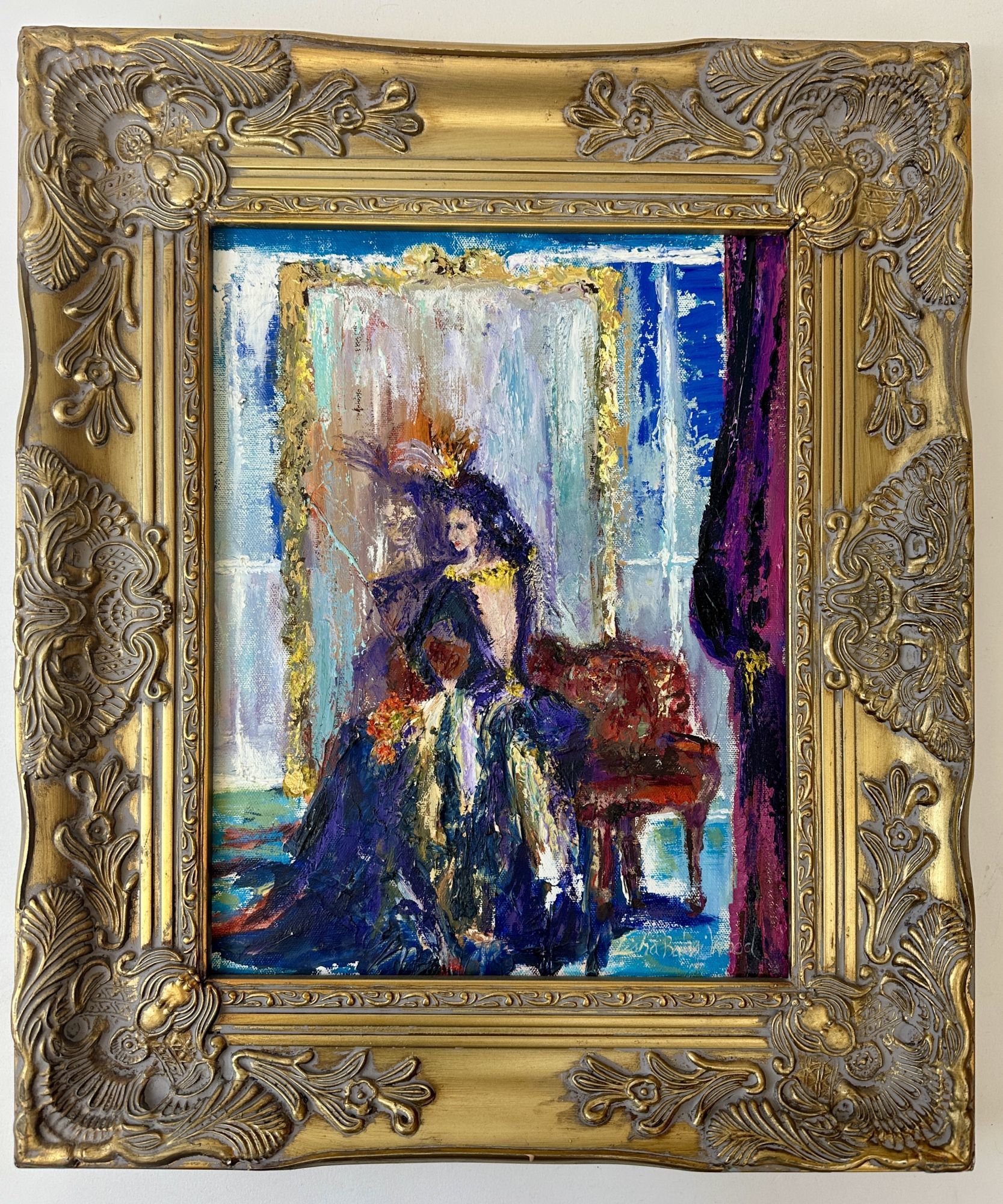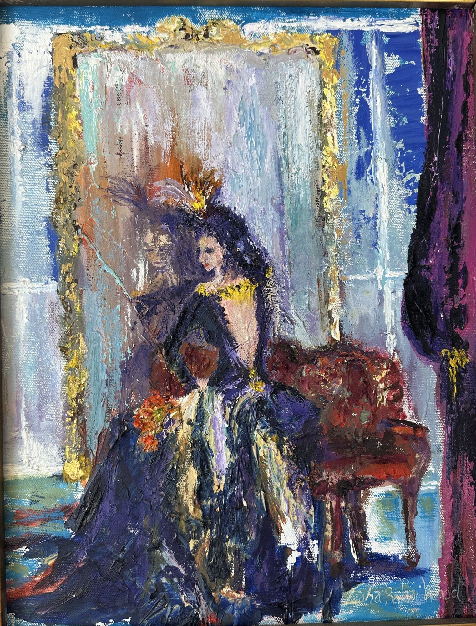 An original painting depicting an elegantly dressed woman seated beside a red chair, rendered in thick, gestural impasto. Signed "Tisha Bales Wood" to the lower right. Acrylic on canvas. Presented in an ornate gilt frame. Dimensions - Frame: approximately 16 × 19 in.; Canvas: approximately 11 in. × 14 in. In Very Good condition. Gilt frame with light rubbing and minor losses along the edges. Shelved at Rockville Room B (SJF). 1406486. Special Collections.