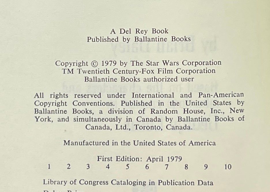 New York: Ballantine Books, 1979. First Edition. Hardcover. Near Fine/Near Fine. Near Fine in a Fine jacket, unclipped ($8.95). Quarter blue cloth with red paper on the boards. Square and firmly bound, remaindered at the bottom edge, clean otherwise. The first volume in the Han Solo Adventure trilogy.