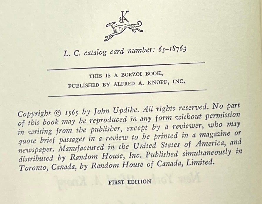 New York: Alfred A. Knopf, 1965. First Edition. Hardcover. Fine/Fine. Fine in a Fine jacket, unclipped ($3.95), a very small crease to the front flap. Quarter green cloth with light green paper on the boards. Square and firmly bound with an red top stain, clean internally. Updike's novel of a Manhattan executive returning to his childhood farmhouse occupied by his widowed mother.