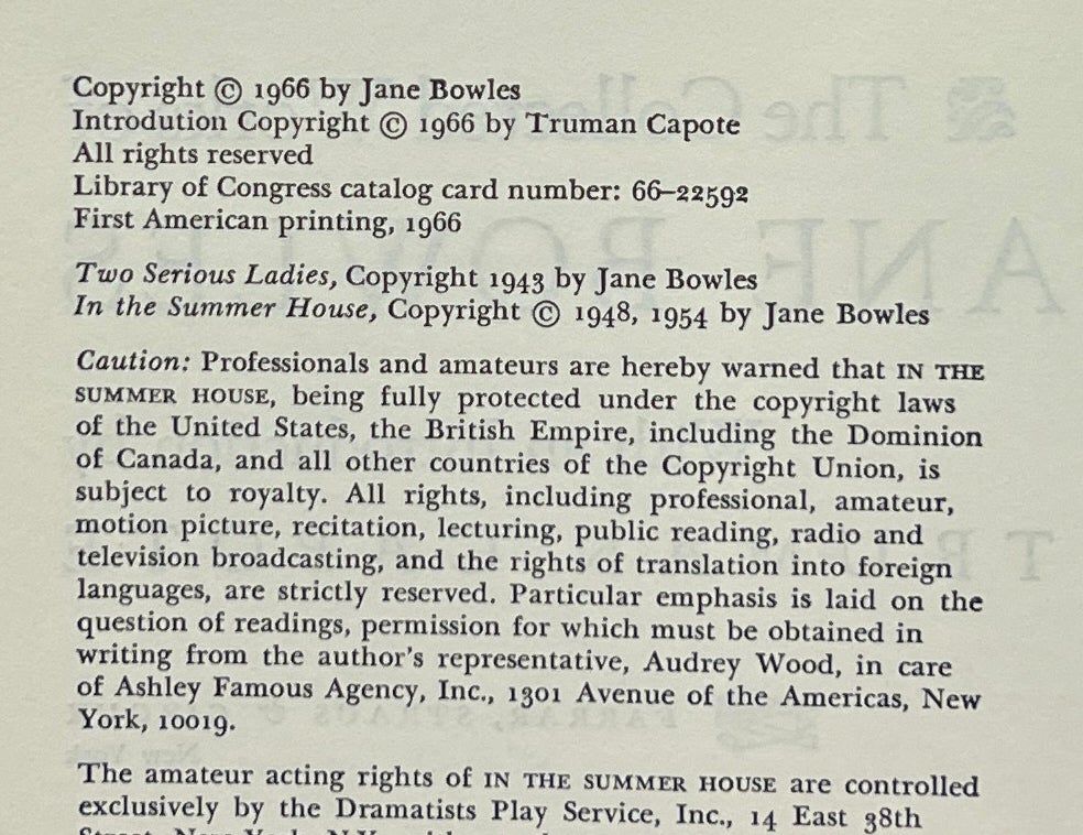 New York: Farrar, Straus and Giroux, 1966. First Edition. Hardcover. Fine/Fine. Introduction by Truman Capote. Fine in a Fine jacket, unclipped ($6.95), a few spots of soiling on the back. Grey cloth with red ink lettering on the spine and front board. Square and firmly bound with a pink topstain, clean internally. A collection of Bowles's fiction output, including her novel, play, and seven stories.