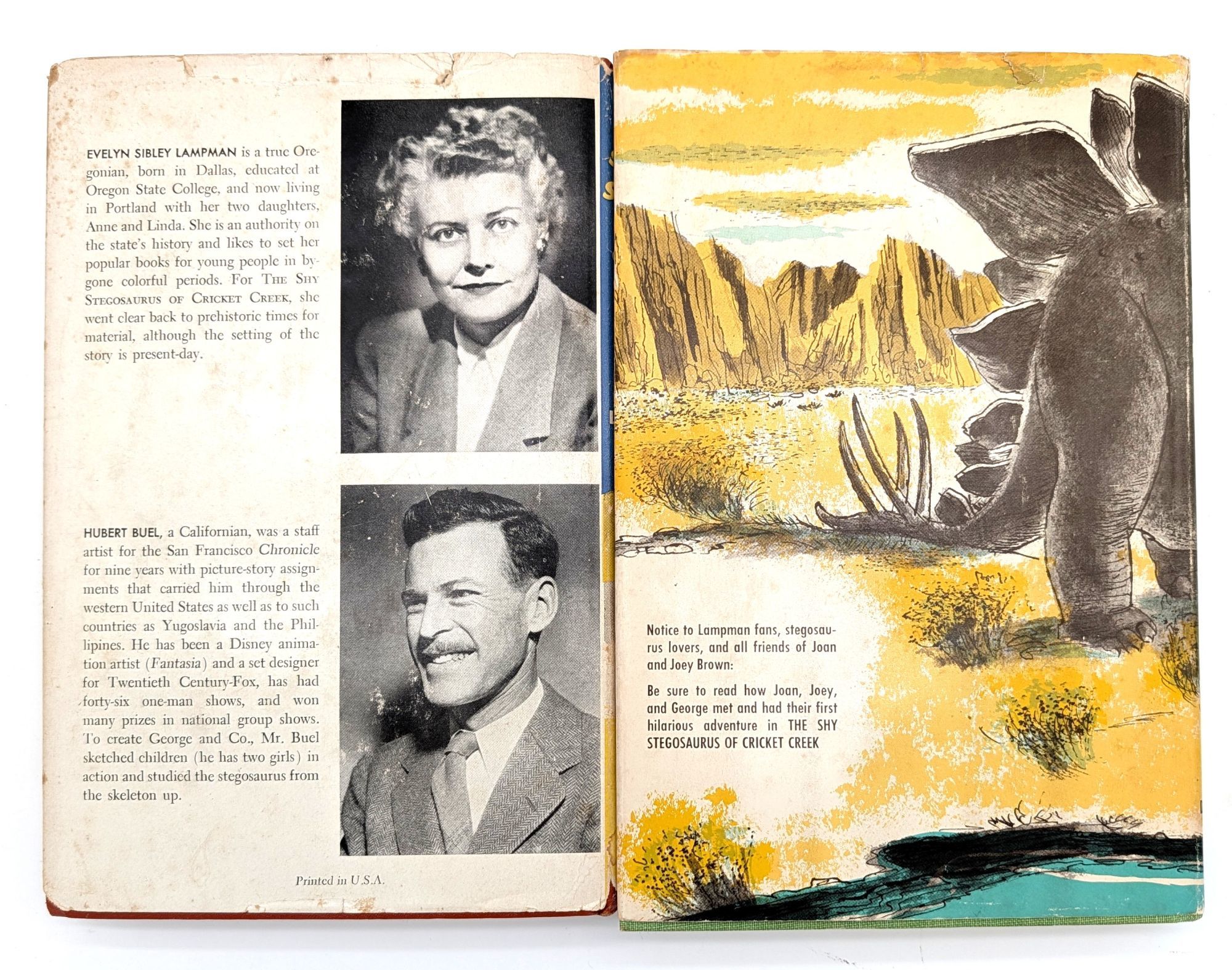 An early printing (from 1955) of volume 1, and stated first edition of volume 2, both inscribed by the author. Remarkably scarce Shy Stegosaurus series pair set against the backdrop of fossil hunting, and saving the Joan & Joey Brown's family ranch in Eastern Oregon. The second book is set against the backdrop of a young Klickitat Indian boy, twins Joan & Joey Brown again, and Stegosaurus George determined to attend the Huckleberry festival. Lampman (1907-1980) wrote and published 37 children's books over her long writing career, and often featured educational themes, difficult subjects, and focused on the darker aspects of Pacific Northwest history, exposing bigotry, misogyny, and the plights of Native Americans, Asian-Americans, and other minorities.