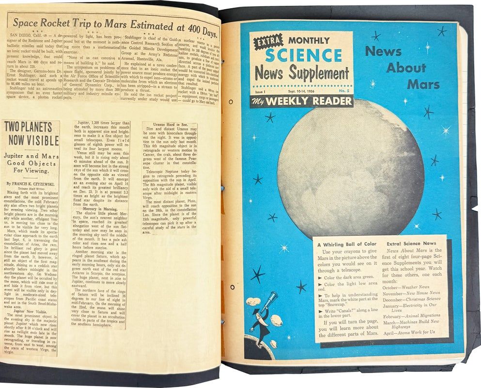 School report by California sixth-grader Donna Everitts on the solar system, including sections on the planets, the moon ("No living thing can live on the moon because it has no air or water on it"), the sun, and the stars, with special emphasis on Mars--one of the news clippings promises that "Space Rocket Trip to Mars Estimated at 400 Days" (off by a decade). Everitts received an "A" and a paperclipped in note of praise from the teacher. We find one record for Donna Everitts: a 1969 marriage license from Riverside, California, listing both the bride and groom as 23 years old.