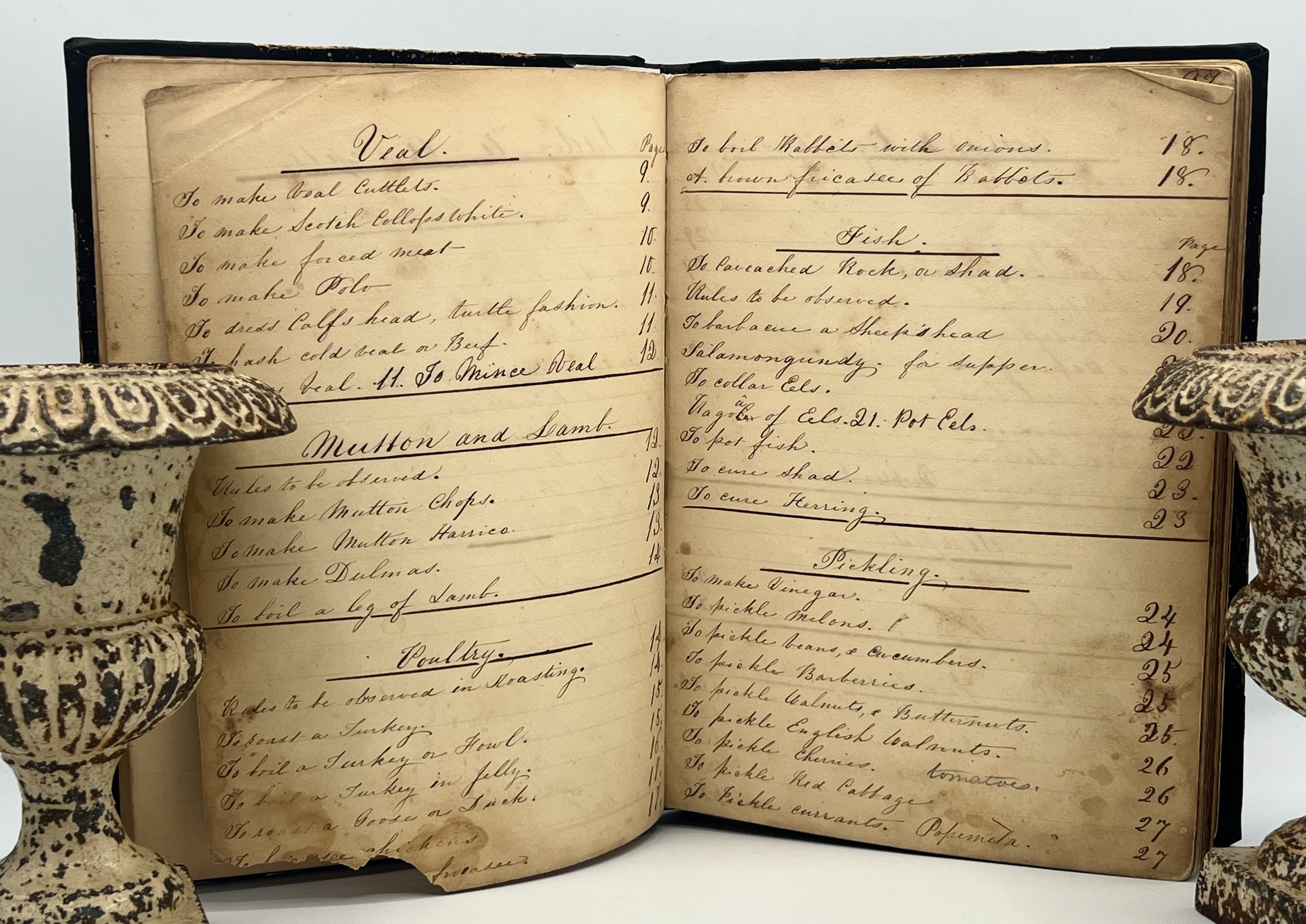 Philadelphia, c. 1850s - 70s. Hardcover. Black boards. Very good. This meticulously handwritten and systematically organized manuscript comprises 116 pages (20 x 15 cm), likely compiled by one or two household servants. The first 104 pages, authored in a single hand and fully indexed, present an extensive range of recipes. From page 104 onward, two distinct hands are evident, suggesting later contributors or additional cooks.