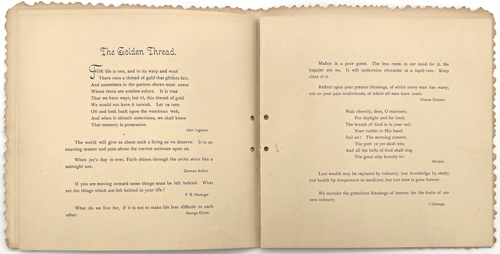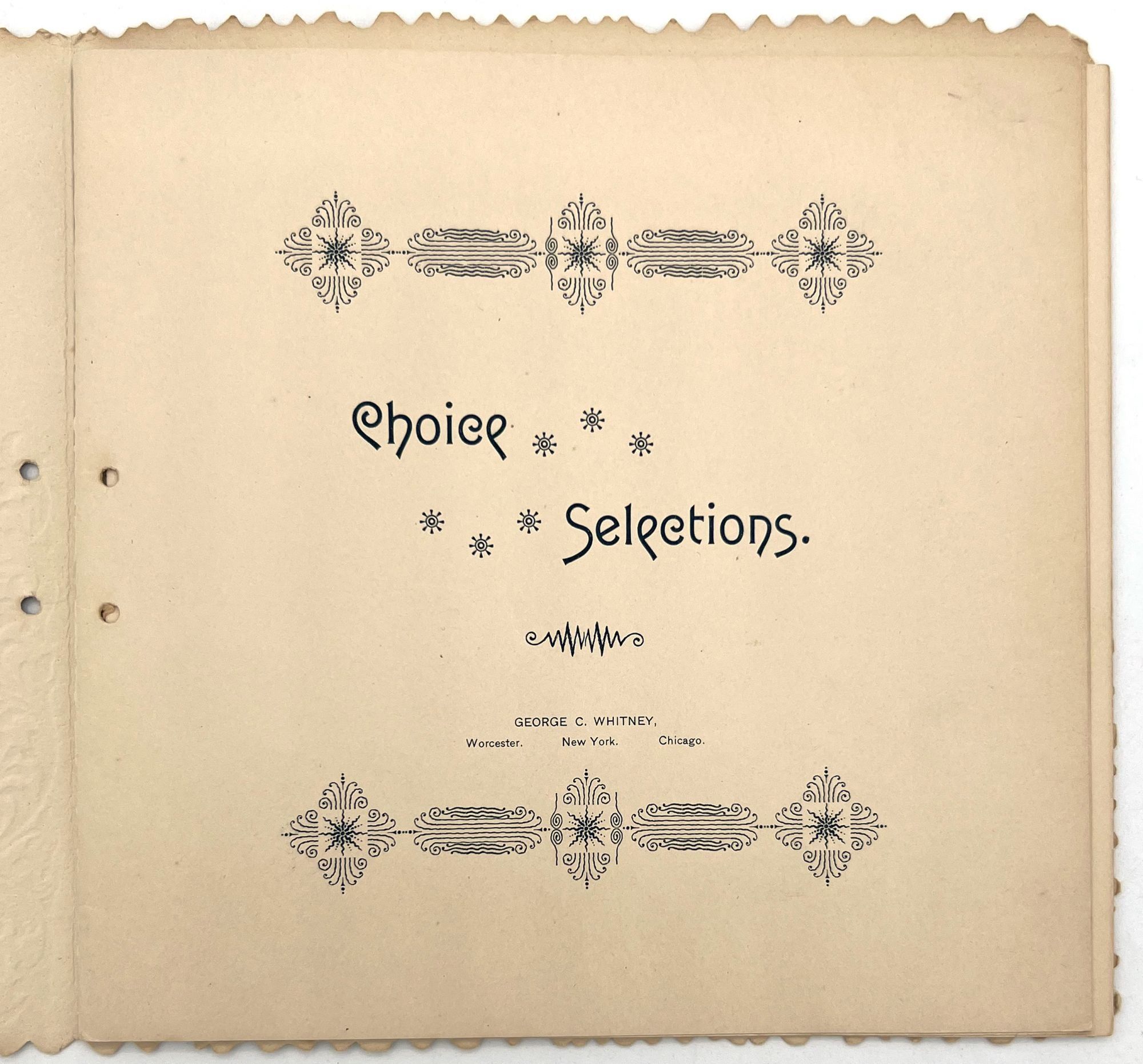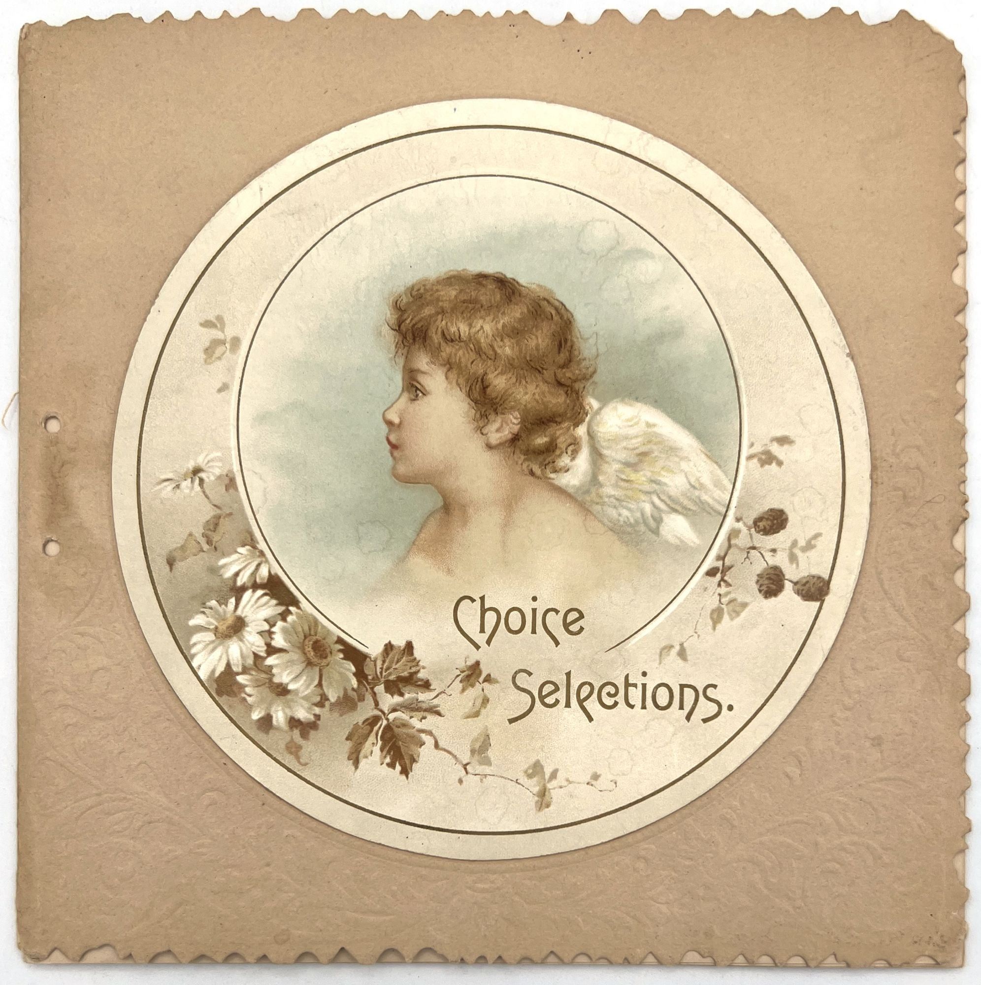 N.pl: George C. Whitney, 1890. Good. Lacking original cord that bound the volume on the left-hand edge. A little dust soiling, toning.. A charming book of selected poetry and prose, published as a "gift book" for the Christmas season by George C. Whitney, a famous manufacturer of valentines and greeting cards. There are eight pages of poetry and quotes from writers including George Elliott, Dickens, Bunyan, Hunt, Louisa May Alcott, and Sir Walter Scott. Single vol. (7.25" by 7.25"), pp. [12], in original embossed and die-cut covers with "Merry Christmas" embossed on the lower cover and a large medallion pasted to the upper cover with the title and an illustration of an angel.