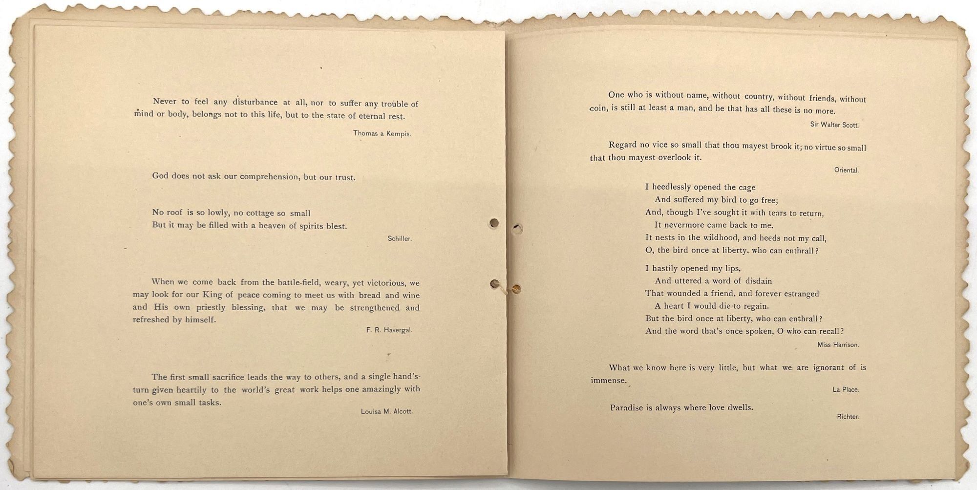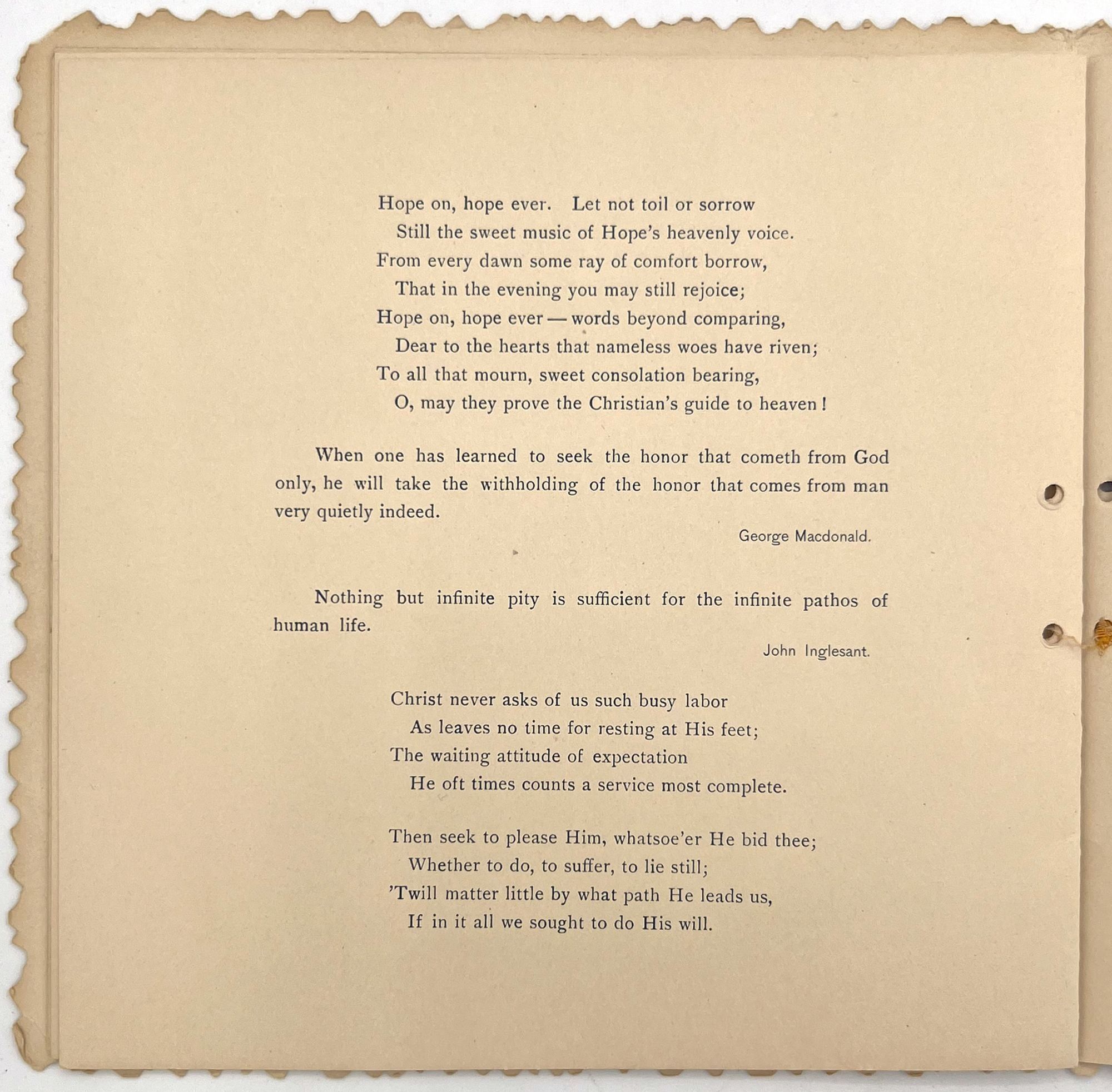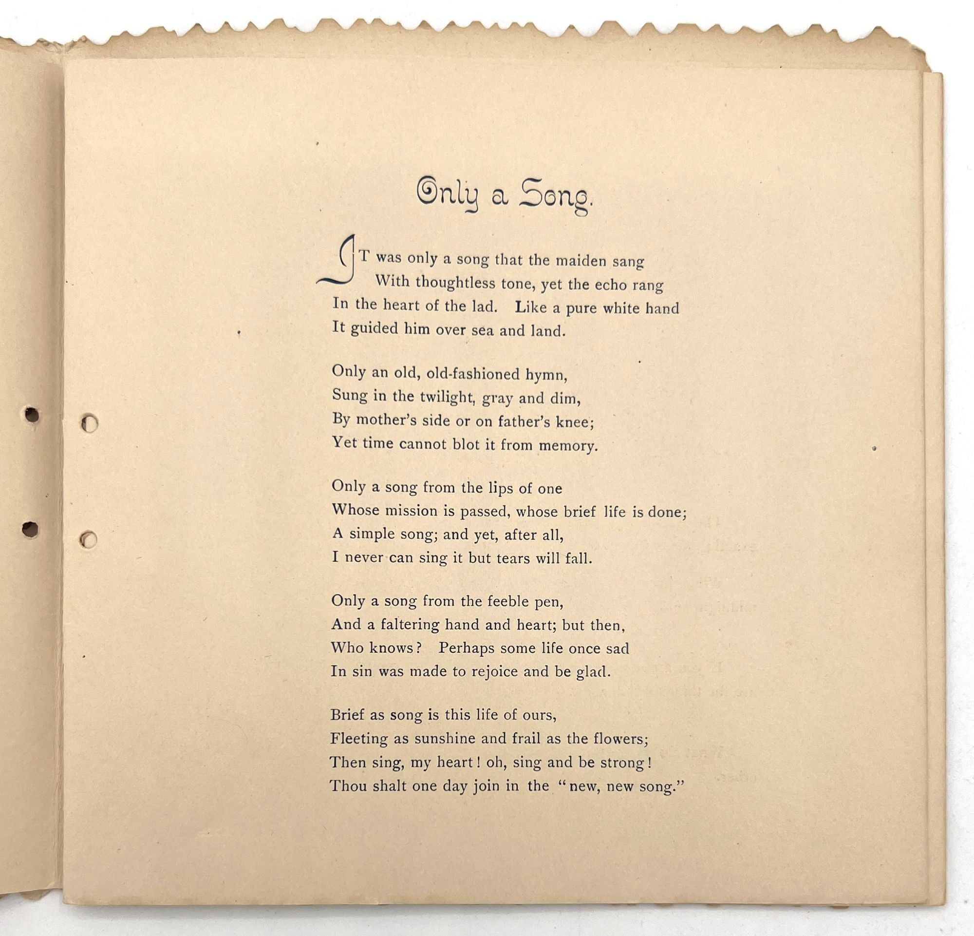 N.pl: George C. Whitney, 1890. Good. Lacking original cord that bound the volume on the left-hand edge. A little dust soiling, toning.. A charming book of selected poetry and prose, published as a "gift book" for the Christmas season by George C. Whitney, a famous manufacturer of valentines and greeting cards. There are eight pages of poetry and quotes from writers including George Elliott, Dickens, Bunyan, Hunt, Louisa May Alcott, and Sir Walter Scott. Single vol. (7.25" by 7.25"), pp. [12], in original embossed and die-cut covers with "Merry Christmas" embossed on the lower cover and a large medallion pasted to the upper cover with the title and an illustration of an angel.