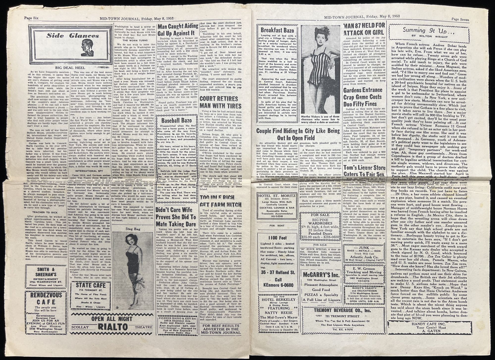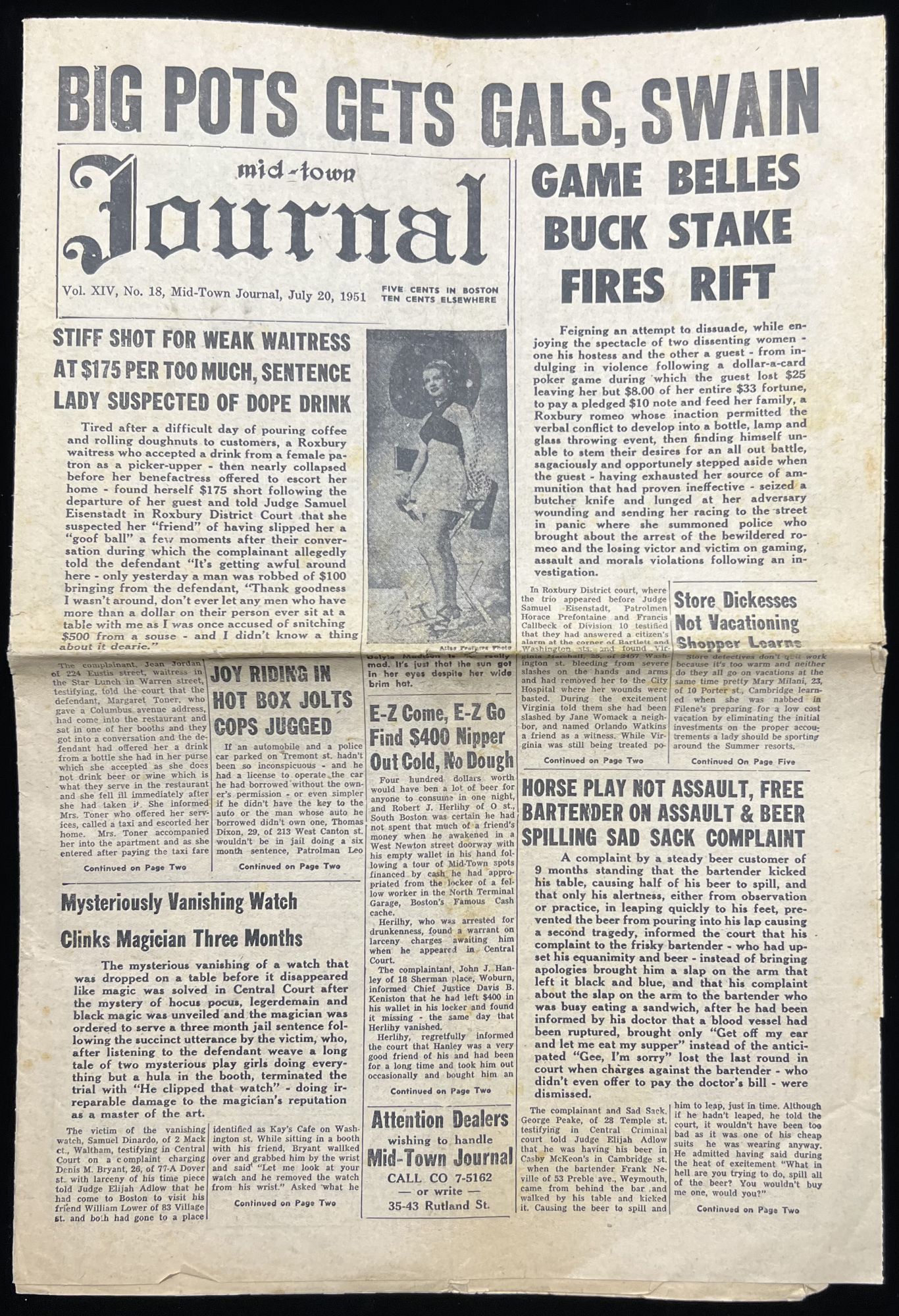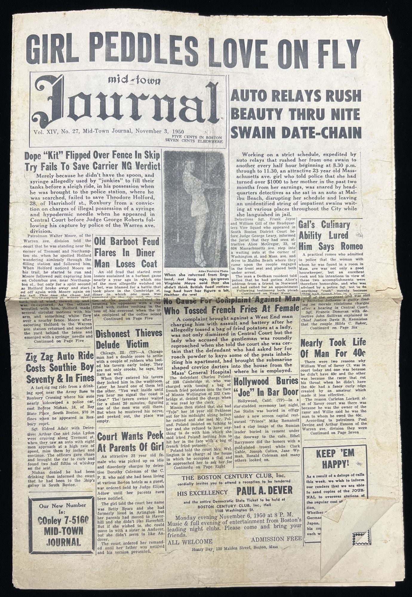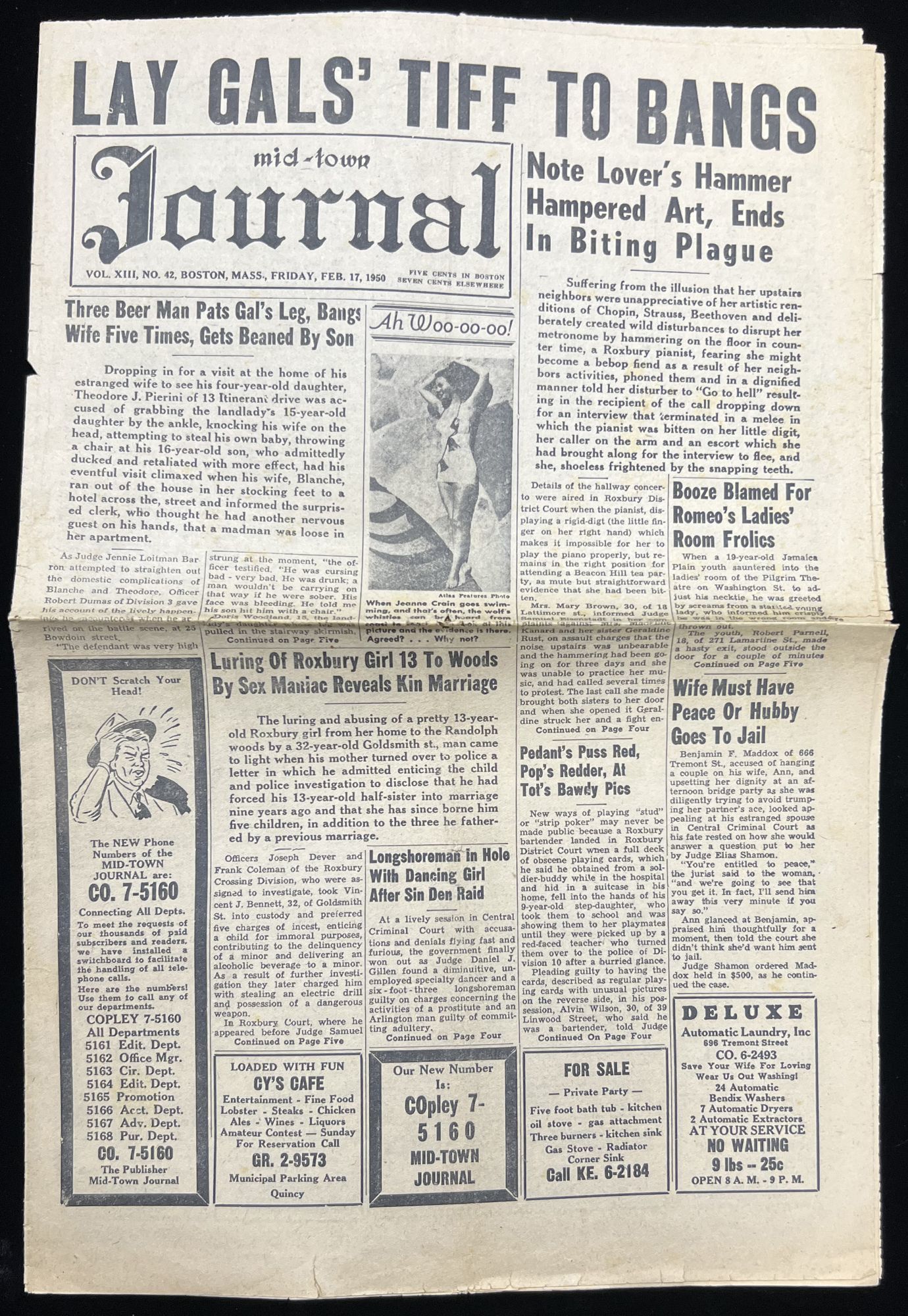 Boston, Massachusetts: Mid-Town Journal, 1953. Very good. Light toning, short tears and nicks.. Four (4) issues of the "Mid-Town Journal", a so-called "scandal sheet" offering readers sleazy, sensational gossip stories, with plenty of photos of attractive starlets and models with cheeky captions (e.g. a photo of Ava Gardner with the caption "How Could Frankie Leave Home?" referring to her romance with Frank Sinatra). This set includes the following issues: Vol. XIII, No. 42 (Feb. 17, 1950); Vol. XIV, No. 27 (Nov. 3, 1950); Vol. XIV, No. 18 (Jul. 20, 1951); and Vol. XVI, No. 5 (May 8, 1953). Each measures approx. 17" by 11.5"), and is approx. 8 pp. A selection of some of the more entertaining article titles: "Luring of Roxbury Girl 13 to Woods By Sex Maniac Reveals Kin Marriage"; "Wife Must Have Peace Or Hubby Goes to Jail"; "Booze Blamed For Romeo's Ladies' Room Frolics"; "No Cause For Complaint Against Man Who Tossed French Fries at Female"; "Runaway New York Cuties Flood City On Way To Maine and Fame"; "Subtle Caveman's Woo Tactics Flop, Desired Female Panicked, Calls Cop