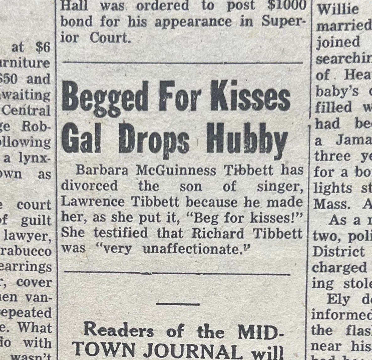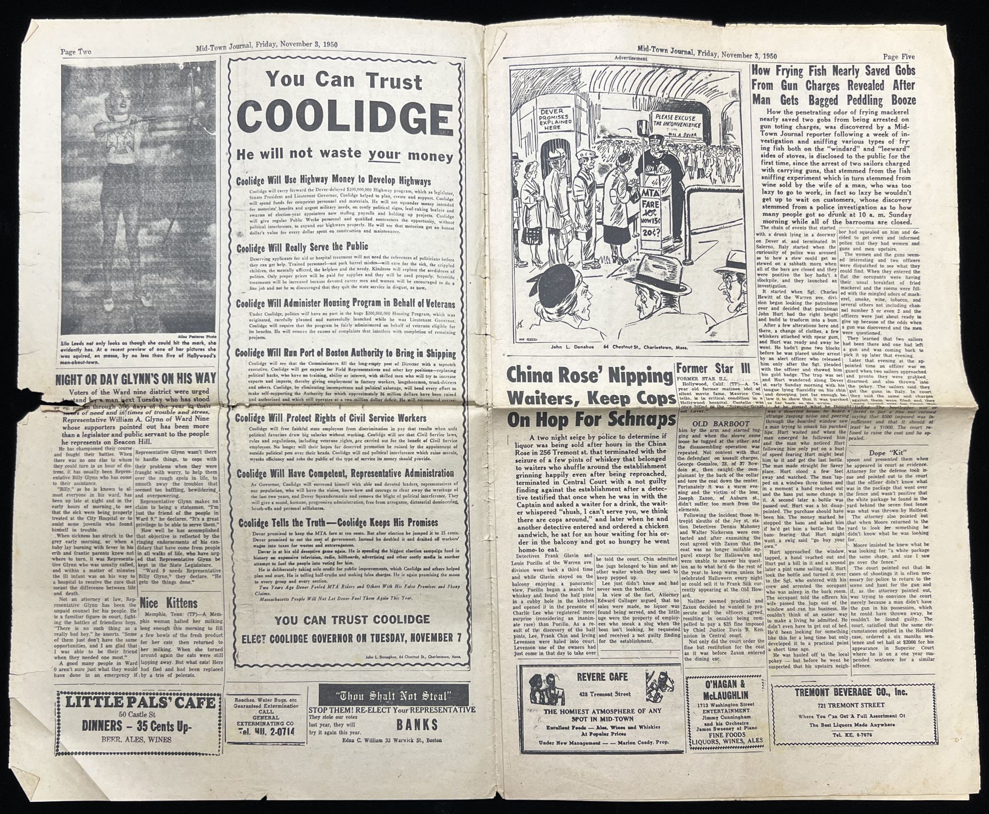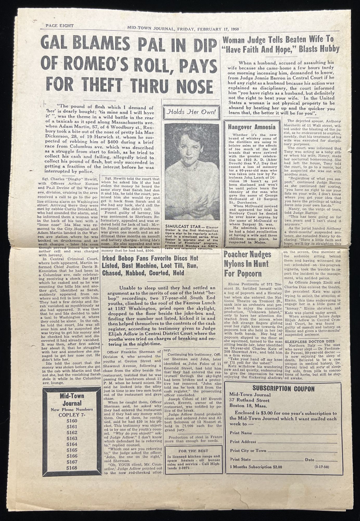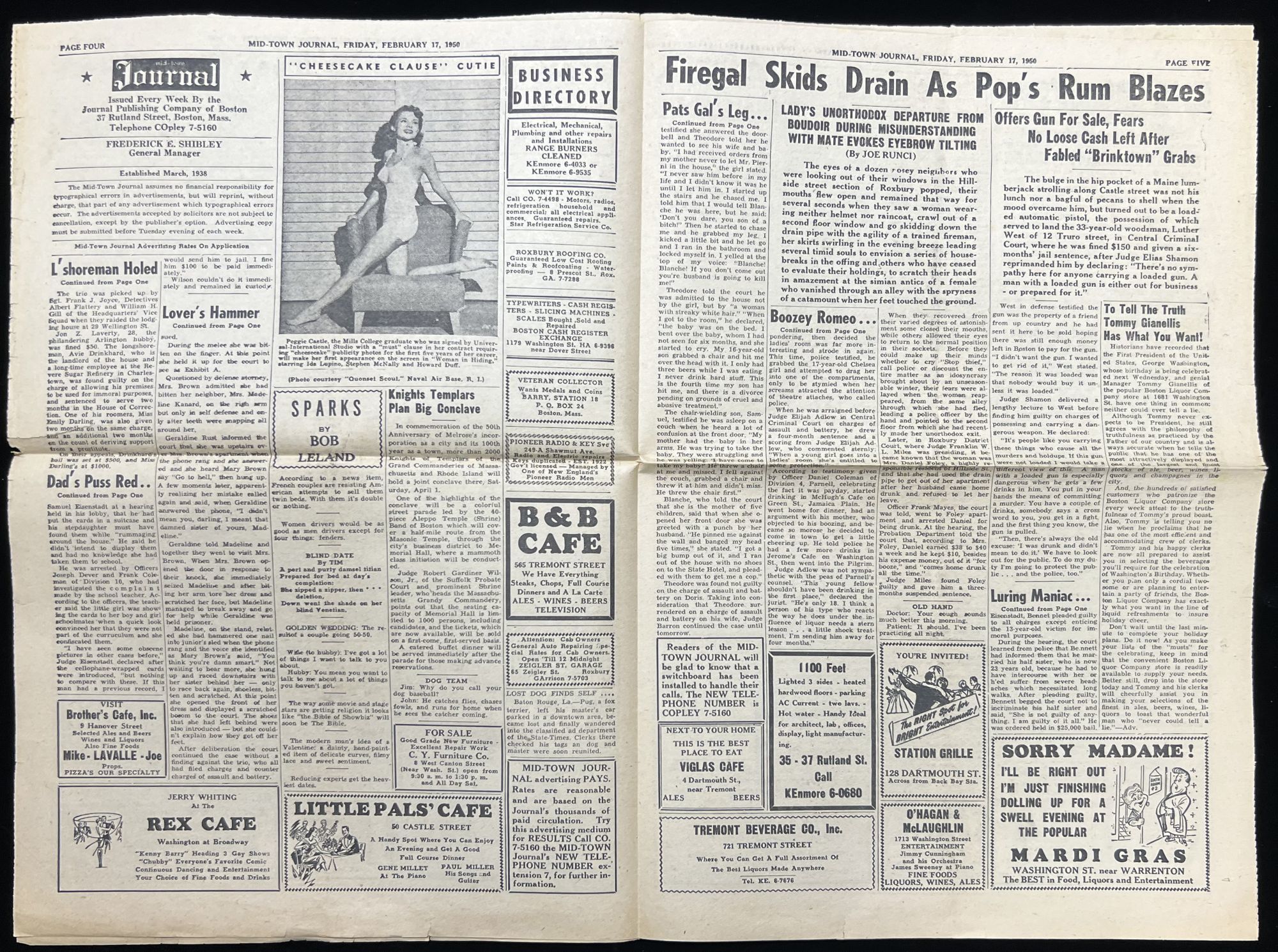 Boston, Massachusetts: Mid-Town Journal, 1953. Very good. Light toning, short tears and nicks.. Four (4) issues of the "Mid-Town Journal", a so-called "scandal sheet" offering readers sleazy, sensational gossip stories, with plenty of photos of attractive starlets and models with cheeky captions (e.g. a photo of Ava Gardner with the caption "How Could Frankie Leave Home?" referring to her romance with Frank Sinatra). This set includes the following issues: Vol. XIII, No. 42 (Feb. 17, 1950); Vol. XIV, No. 27 (Nov. 3, 1950); Vol. XIV, No. 18 (Jul. 20, 1951); and Vol. XVI, No. 5 (May 8, 1953). Each measures approx. 17" by 11.5"), and is approx. 8 pp. A selection of some of the more entertaining article titles: "Luring of Roxbury Girl 13 to Woods By Sex Maniac Reveals Kin Marriage"; "Wife Must Have Peace Or Hubby Goes to Jail"; "Booze Blamed For Romeo's Ladies' Room Frolics"; "No Cause For Complaint Against Man Who Tossed French Fries at Female"; "Runaway New York Cuties Flood City On Way To Maine and Fame"; "Subtle Caveman's Woo Tactics Flop, Desired Female Panicked, Calls Cop