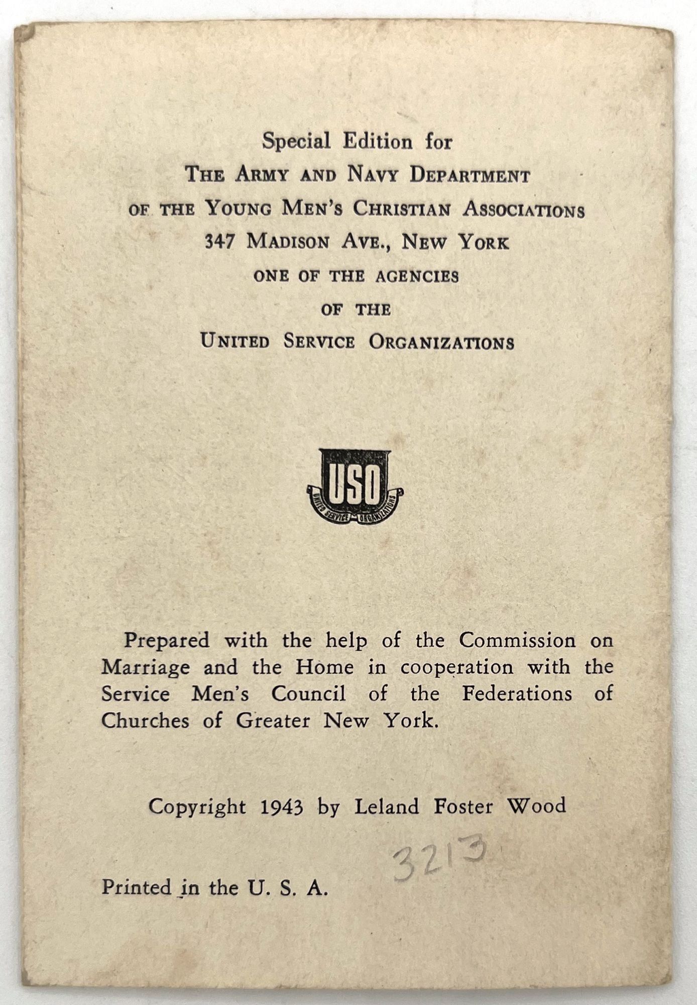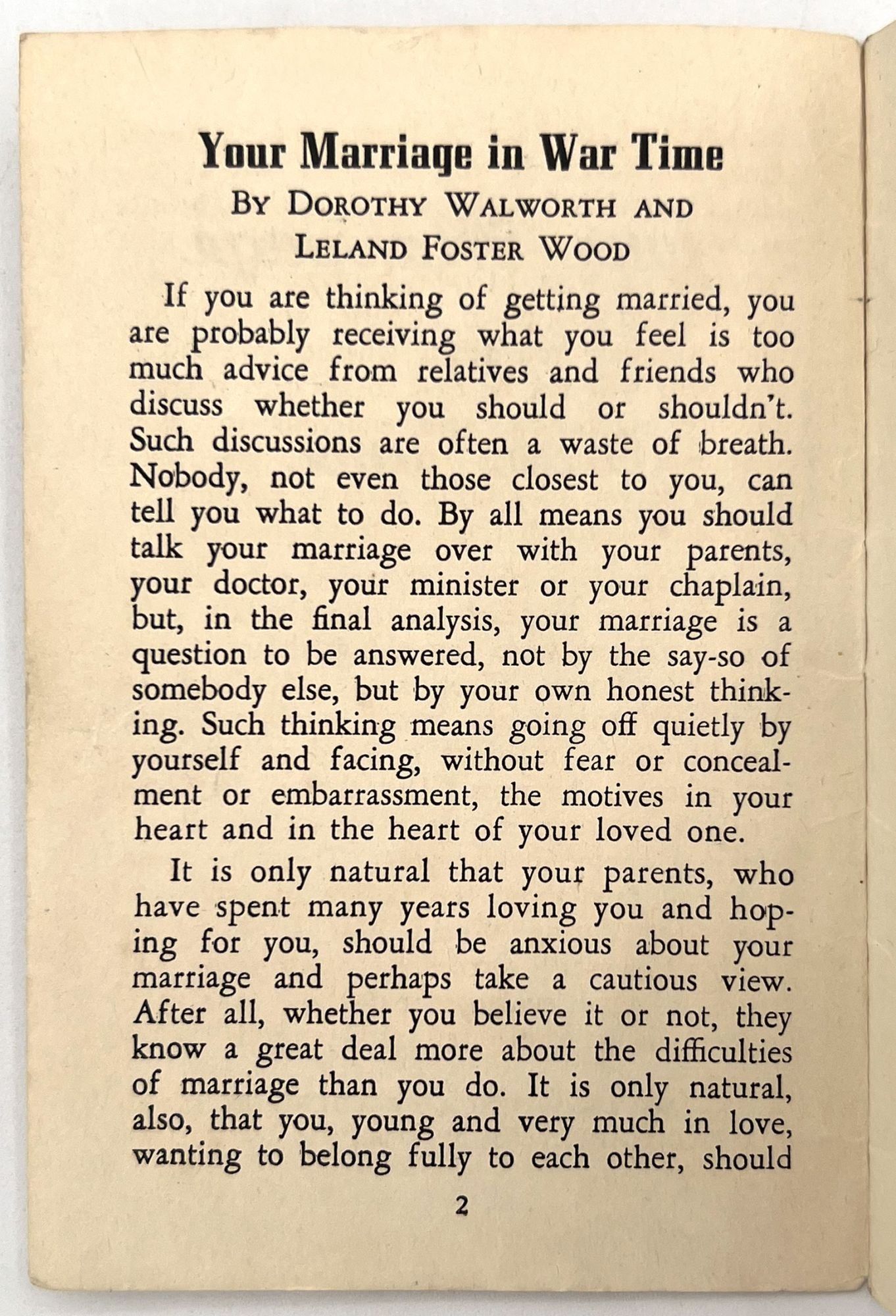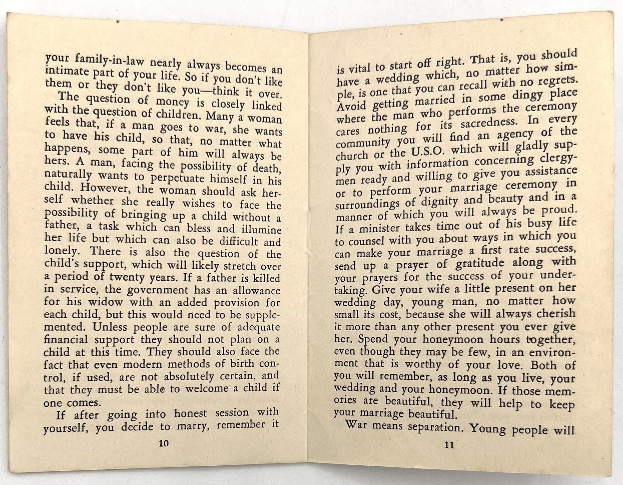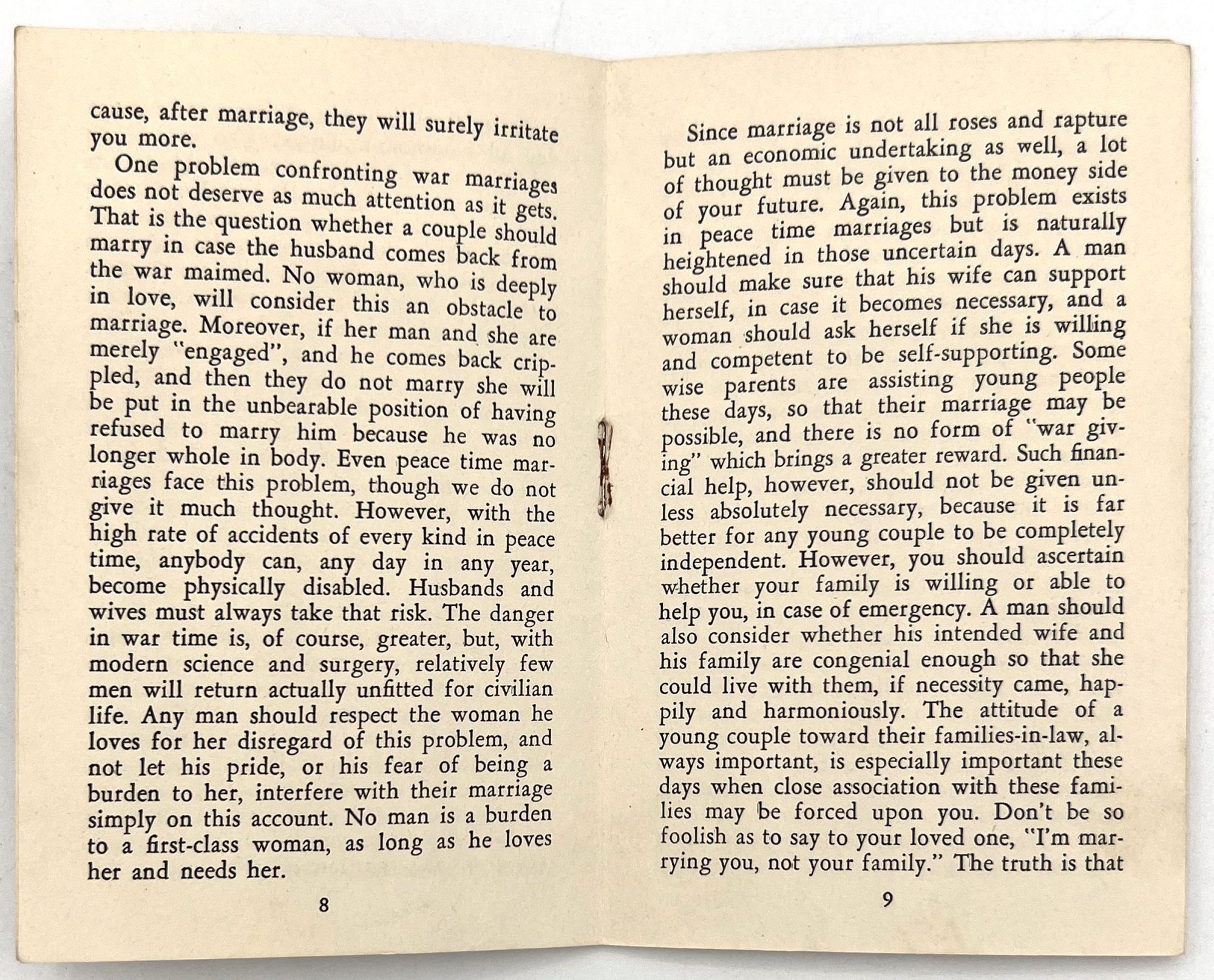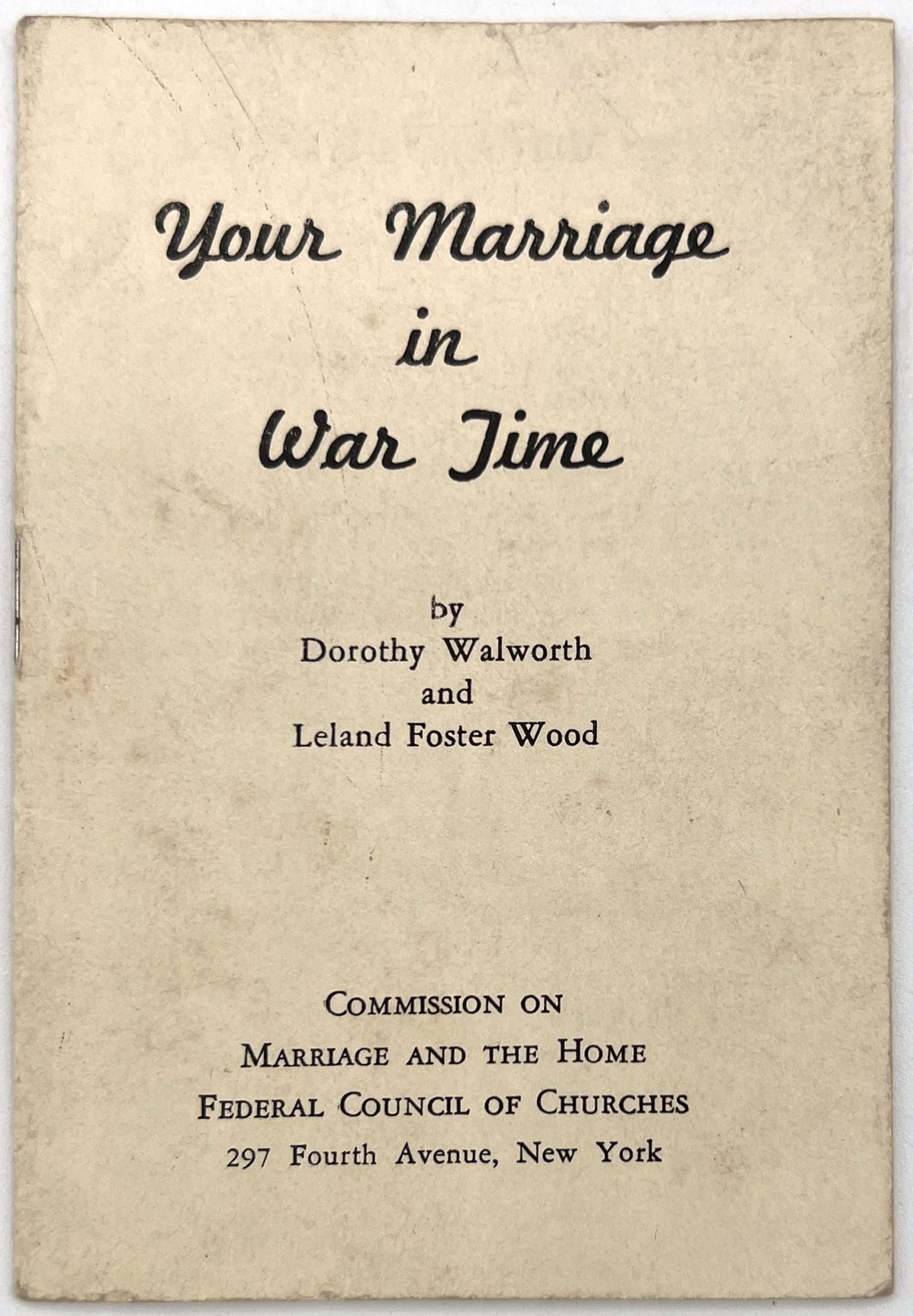 New York, New York: Commission on Marriage and the Home Federal Council of Churches, 1943. Very good. Light dust soiling.. A WWII-era advice booklet on marriage for young people, published for the Army and Navy Department to distribute among servicemen. The booklet encourages readers to think carefully before committing to marriage, citing a rise in emotional impulsiveness in wartime. It recognizes that there may never be a "safe" time to marry, but encourages young adults to carefully consider compatibility beyond physical attraction. Other issues to consider include: the possibility of men returning from war "crippled", or not returning at all; ensuring the wife can support herself economically without the breadwinner; the importance of letters and communication; and staying faithful. Interestingly, it also emphasizes the importance of the wife "to broaden her own horizons" while her serviceman husband is abroad, "so that she will be a woman worth coming back to" (p. 14). Provides a poignant look into love in wartime, with interesting insight into gender roles and generational gaps. Single vol. (5" by 3.25"), pp. 16, stapled in original printed self wrps.