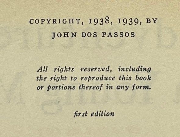 New York: Harcourt Brace and Company, 1939. First Edition. Hardcover. Near Fine/Very Good. Near Fine in a Very Good jacket, unclipped ($2.50), generally toned, a few chips at the edges. Blue cloth, bumped at the corners, with red ink lettering on the spine. Square and firmly bound with a red topstain, clean internally. The first novel in Dos Passos's District of Columbia trilogy, a novel of disillusionment in American during the 1920s and 1930s.
