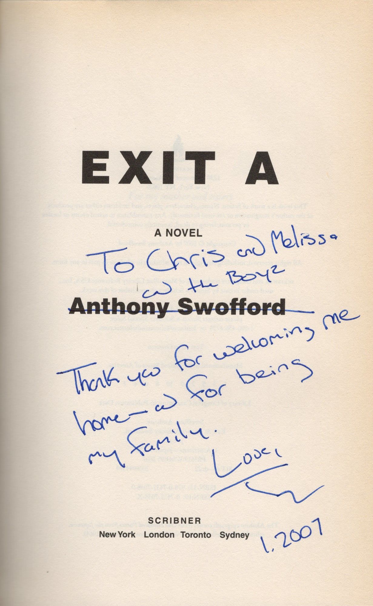 New York: Scribner, 2007. First Edition. First Edition. Association Copy, INSCRIBED on the title page to author Chris Offutt: "To Chris and Melissa and the Boyz / Thank you for welcoming me home—and for being my family / Love / Anthony / I. 2007."