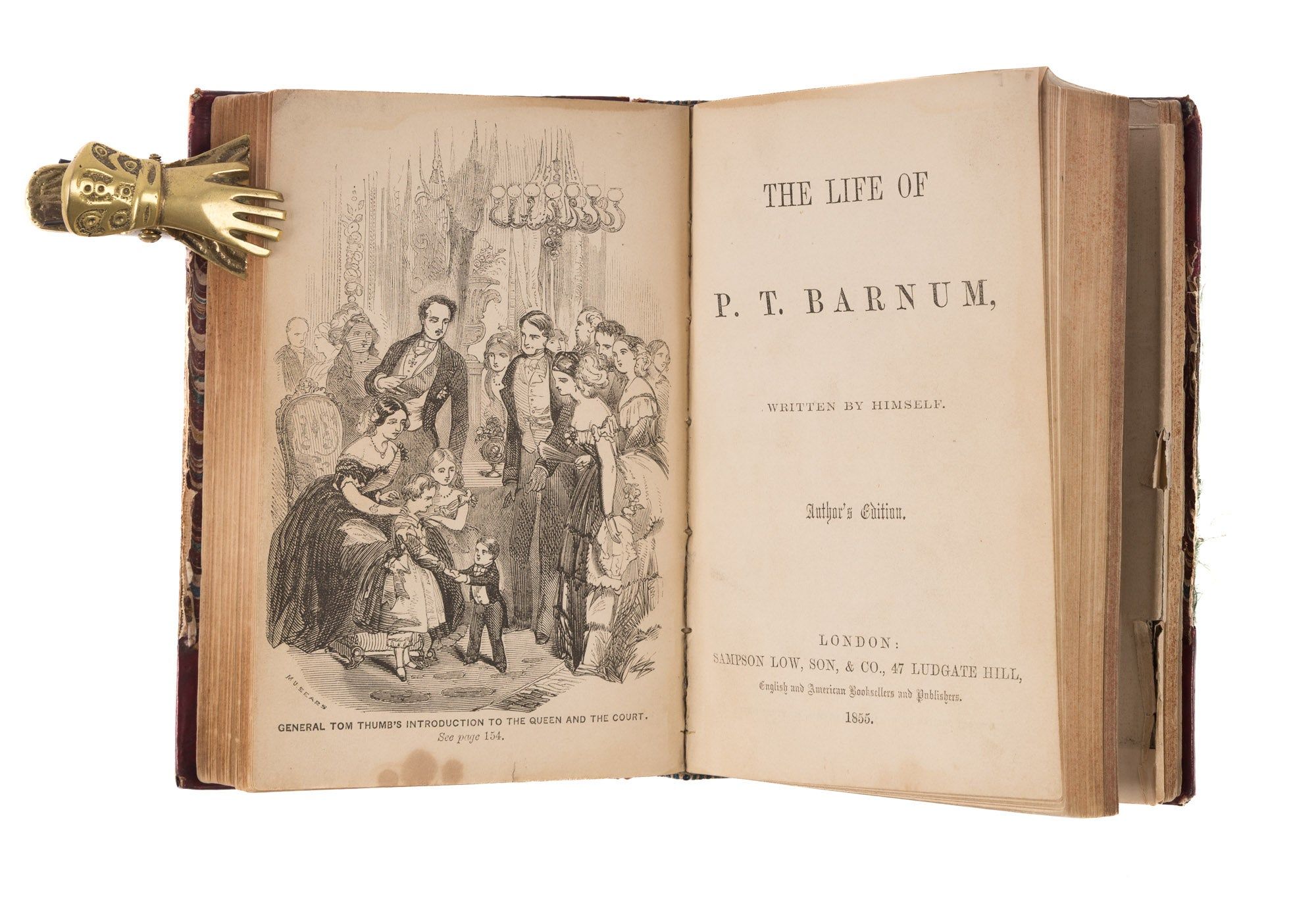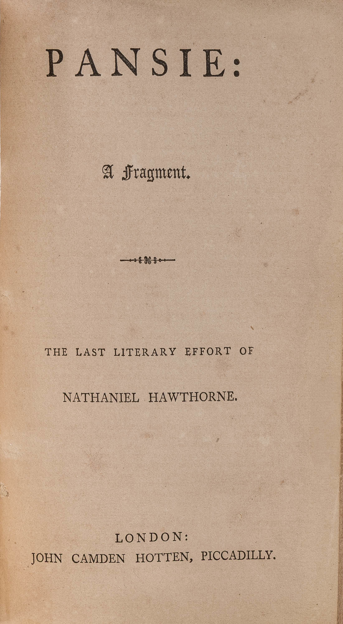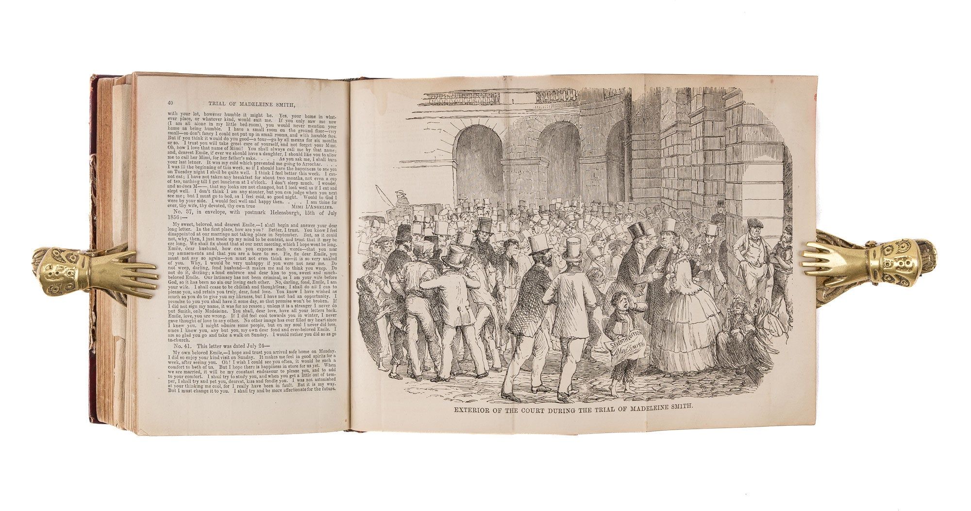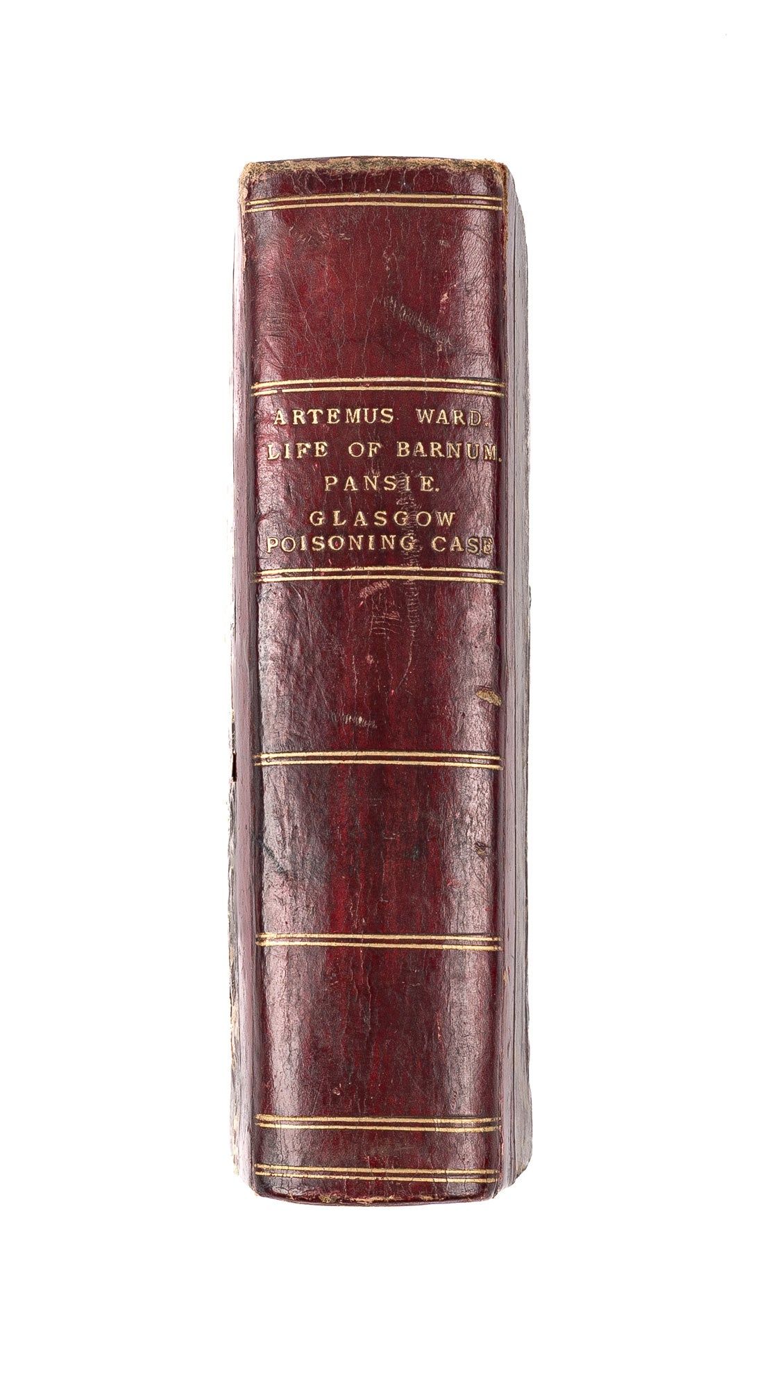 1857. 4 titles in 1 book.. 4 titles in 1 book. Account of a Famous Glasgow Murder Trial Bound with Three Other Diverting Books [Trial]. Smith, Madeleine [1835-1928], Defendant. Glasgow Poisoning Case. Unabridged Report of the Evidence in this Extraordinary Trial, With All the Passionate Love Letters Written by the Prisoner to the Deceased, And Numerous Illustrations, Including Portrait of Madeleine Smith. London: George Vickers, Angel Court, Strand, 1857. 77 pp. 7 woodcut plates, 3 folding. Only edition. [Bound After] Ward, Artemus (Pseud. of Charles Farrar Browne) [1834-1867]. Artemus Ward, His Book: Being the Confessions & Experiences of a Showman. London: S.O. Beeton, 248, Strand, W.C., 1865. viii, 168 pp. Half-title lacking. Later edition; first published in 1862. [And] Barnum, P.T. [1810-1891]. The Life of P.T. Barnum, Written by Himself. Author's Edition. London: Sampson Low, Son, & Co., 47 Ludgate Hill, 1855. viii, 372 pp. Woodcut frontispiece. Woodcut text illustrations. First London edition, published the same year as the first edition, New York, 1855. [And] Hawthorne, Nathaniel. Pansie: A Fragment. The Last Literary Effort of Nathaniel Hawthorne. London: John Camden Hotten, Piccadilly [1864]. 48 pp. Only edition. Octavo (6-1/4" x 4"; 15.9 x 10.2 cm). Contemporary three-quarter calf over marbled boards. Some bubbling and rubbing to boards, heavier rubbing to extremities with wear to fore-edges of boards, front joints just starting at ends, corners bumped and moderately worn, hinges cracked, some bubbling to pastedowns, bookplate residue to front pastedown. Moderate toning to interior, wear and clean tears to folding frontispiece of Glasgow Poisoning Case, one tear mended with cellotape. A very good volume overall. $450. * These unrelated small-format titles may have been assembled to provide diversion to a traveler. It includes a book of humorous sketches by Ward, Barnum's entertaining and inspiring autobiography, the first part of Hawthorne's novel The Dolliver Romance, and an account of a famous murder trial. In 1855, Smith, a Glasgow socialite, began a passionate affair with Pierre Emile L'Angelier. When her parents found a more suitable match, she attempted to break the relationship, but he threatened to use their love letters to expose her if she did not marry him. He died from arsenic poisoning.