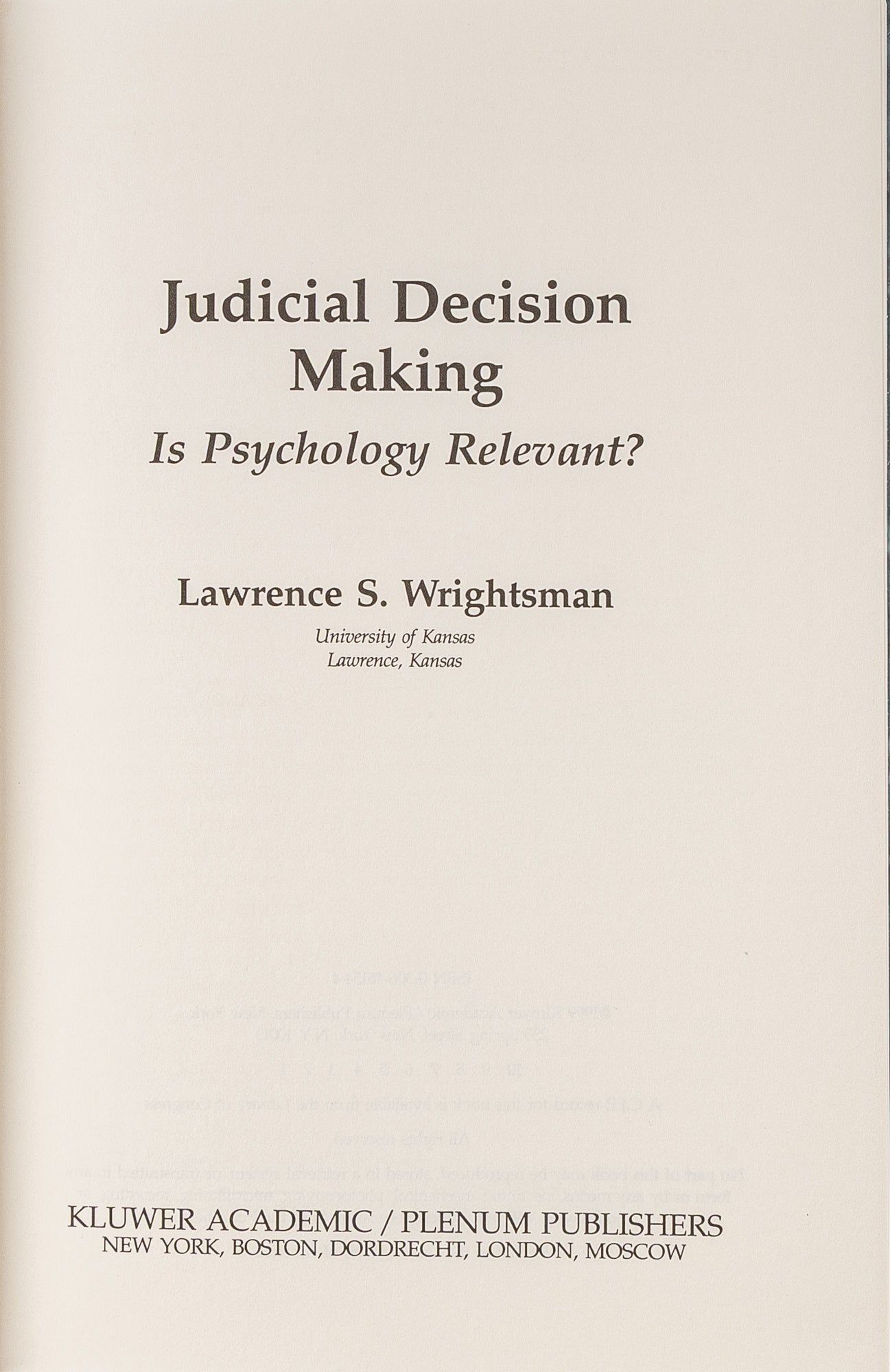 1999. Wrightsman, Lawrence S. Judicial Decision Making: Is Psychology Relevant? New York; Boston; Dordrecht: Kluwer Academic/Plenum Publishers, 1999. xvii, 258 pp. Hardcover. Corners and spine ends slightly bumped, previous owner's name covered with black sharpie to front pastedown, else fine. $25. * Perspectives in Law and Psychology: Vol. 11.