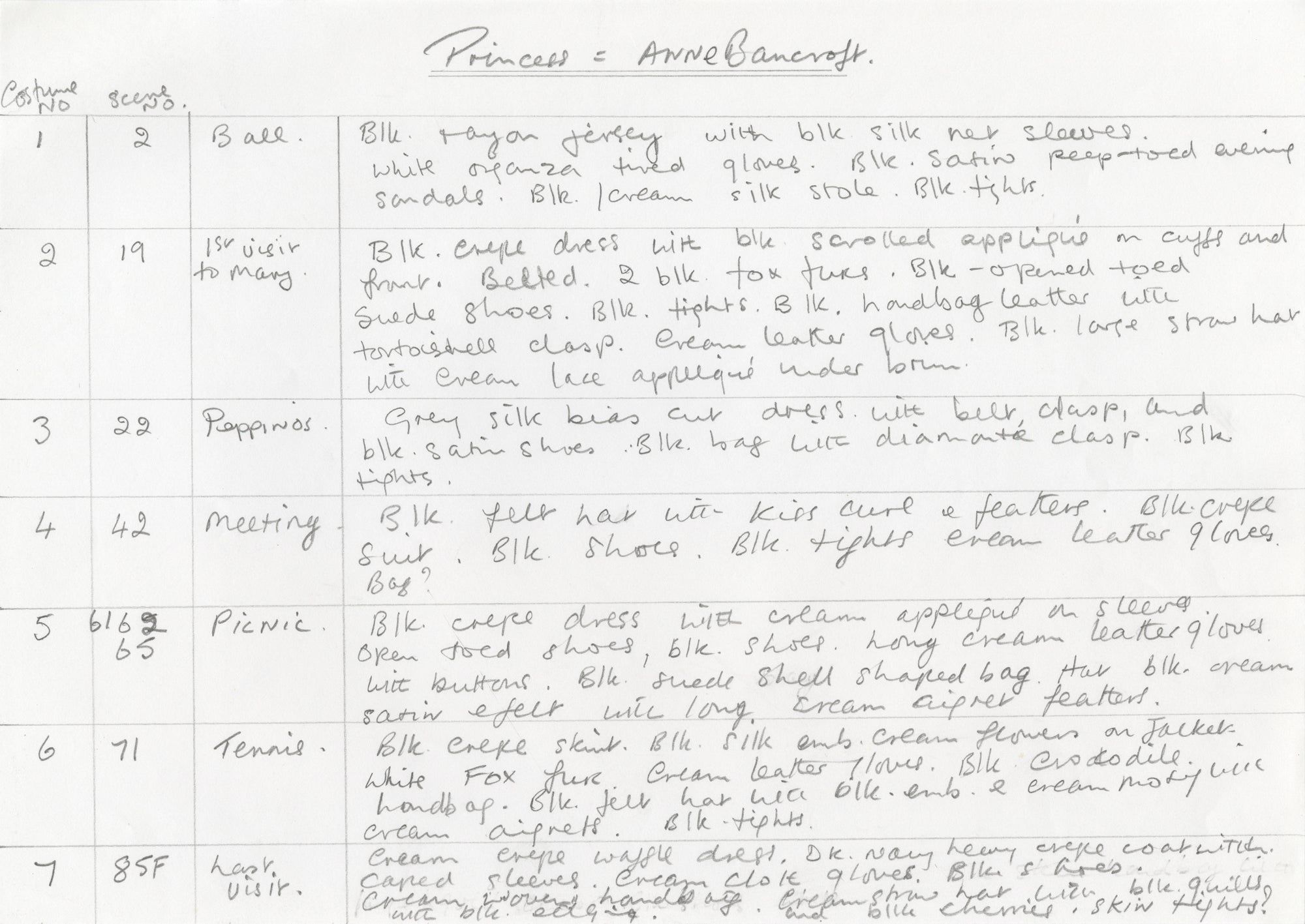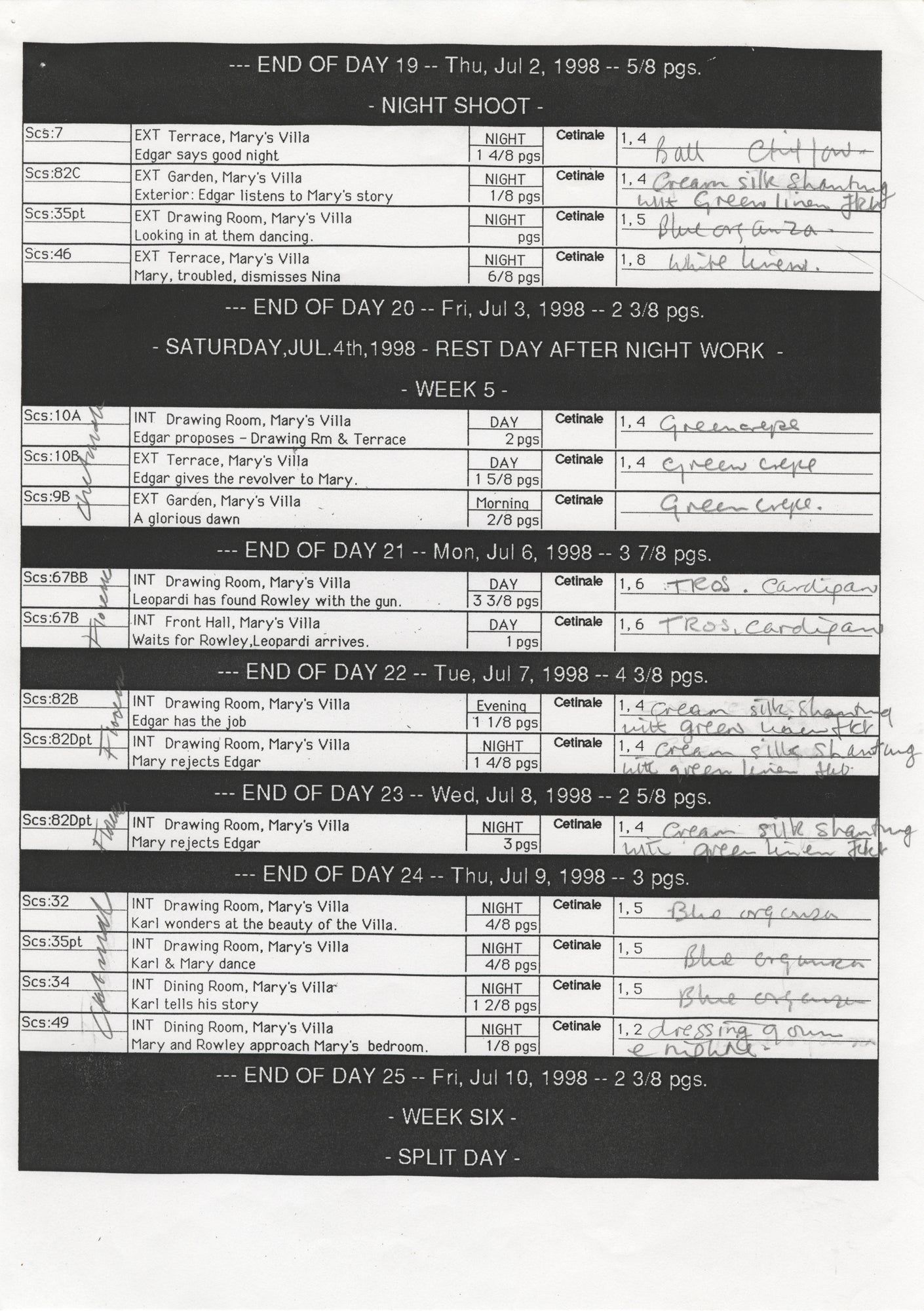 Archive includes a bound gathering of information regarding lodging, food, communication, transportation, and more during filming on location in Italy, along with a cast list. Also included are 15 manuscript leaves extensively detailing costuming for lead actors in the film, along with multiple shooting schedules, scene breakdowns, and call sheets.