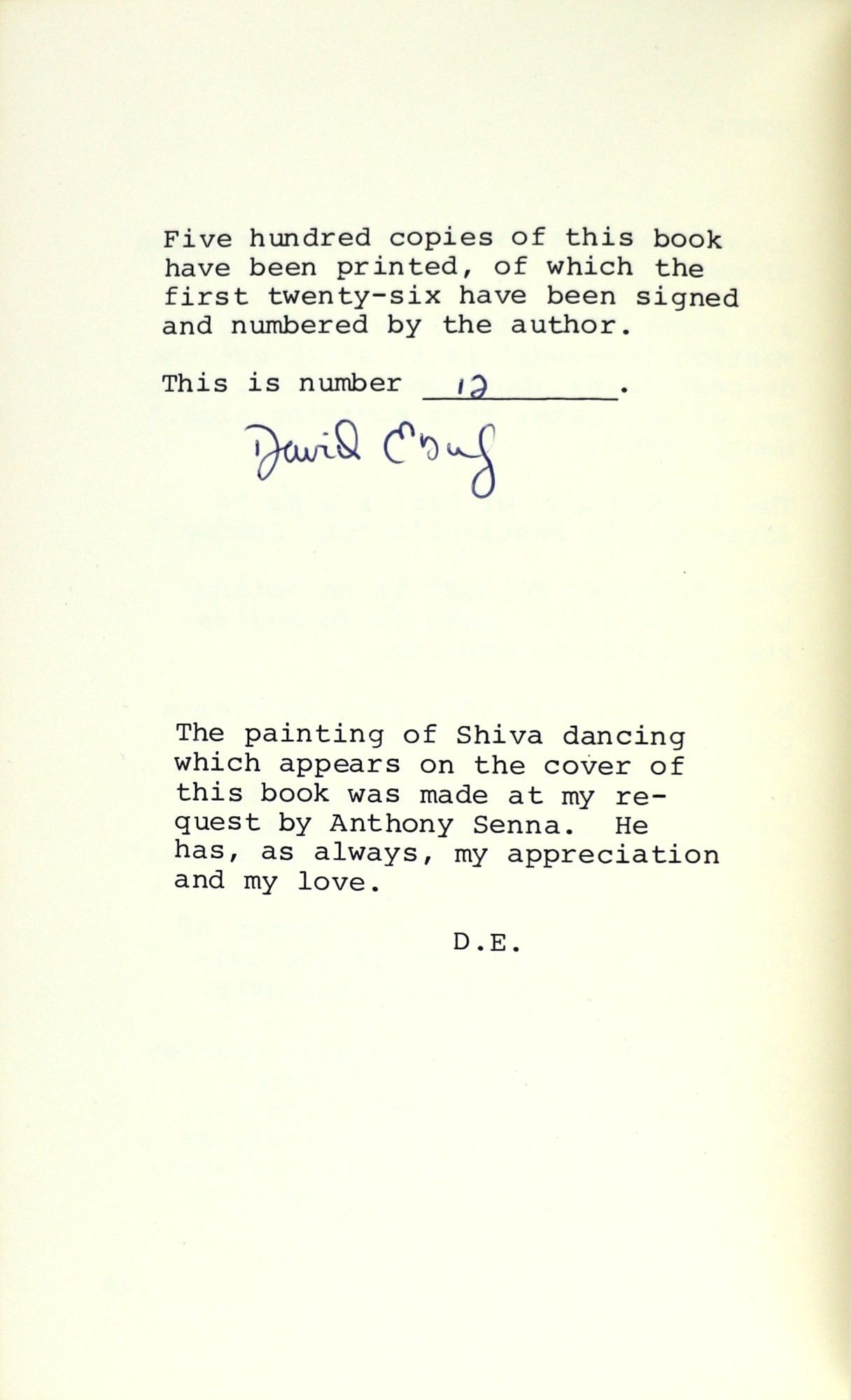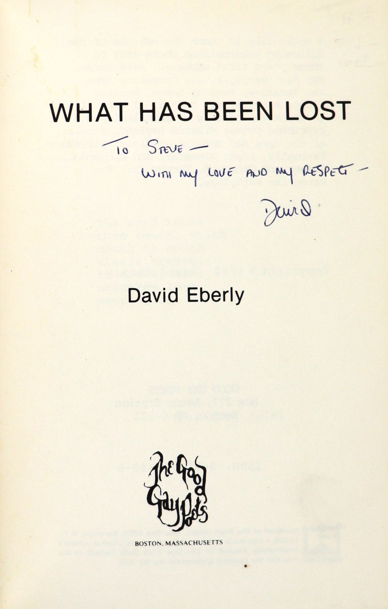 Signed by the author on colophon, and additionally on title page with inscription "To Steve - With my love and my respect - David.