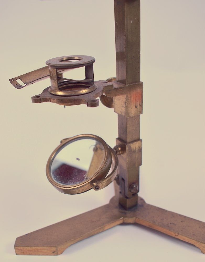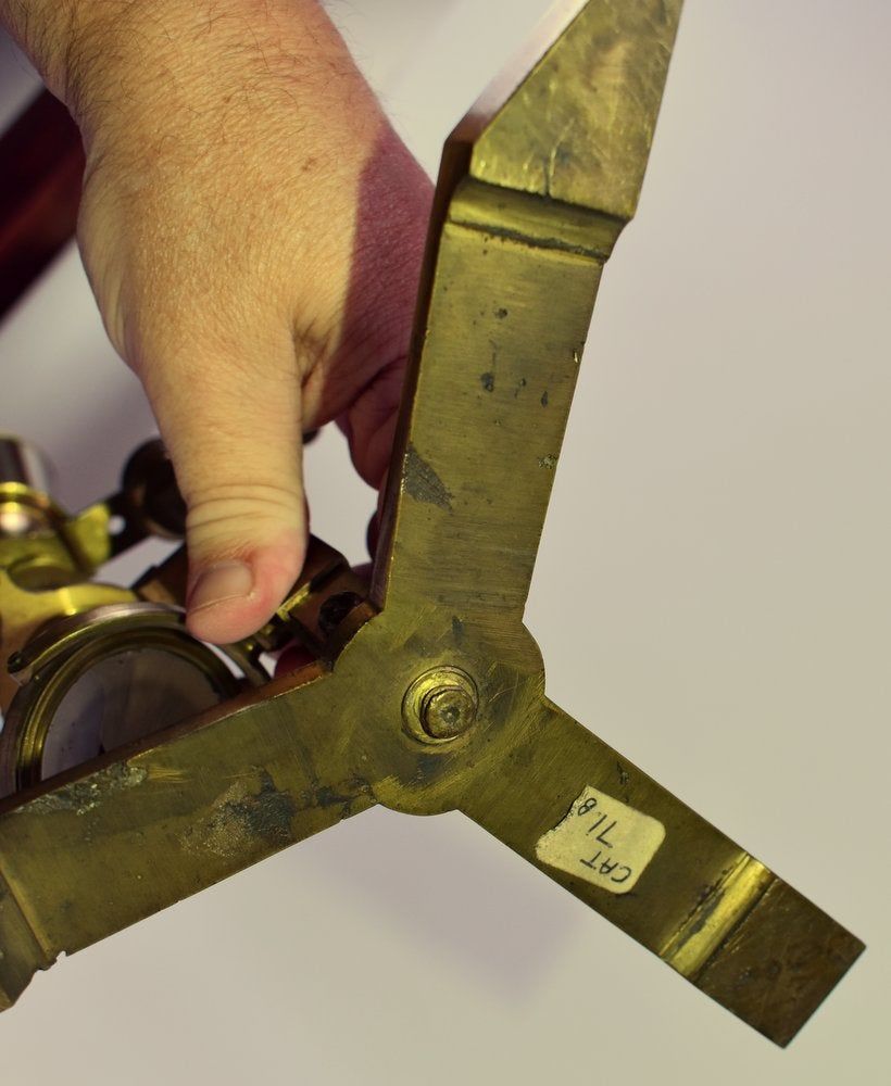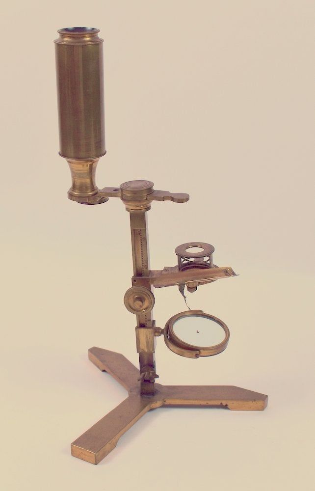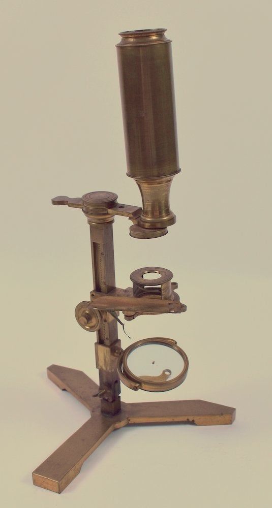 unknown: Unknown, 1775. Good. All brass and glass construction. 14 1/2 inches tall. Base legs are about 8 inches apart. Has a frog assembly (silk mostly perished). The gross focus works smoothly. One small screw missing on gross focus assembly. Patina uniform, with perhaps 20- 30% of original remaining. Paper tag on bottom: "Cat 71B". Multiple aperture lenses rotate smoothly. The top of the pillar arm assembly tightening screw works nicely allowing the top body arm to move in and out relative to the lower body of the microscope. The top body assembly also rotates 360 degrees on the lower pillar (presumably for teaching purposes). We have not tested the optics. An interesting instrument!