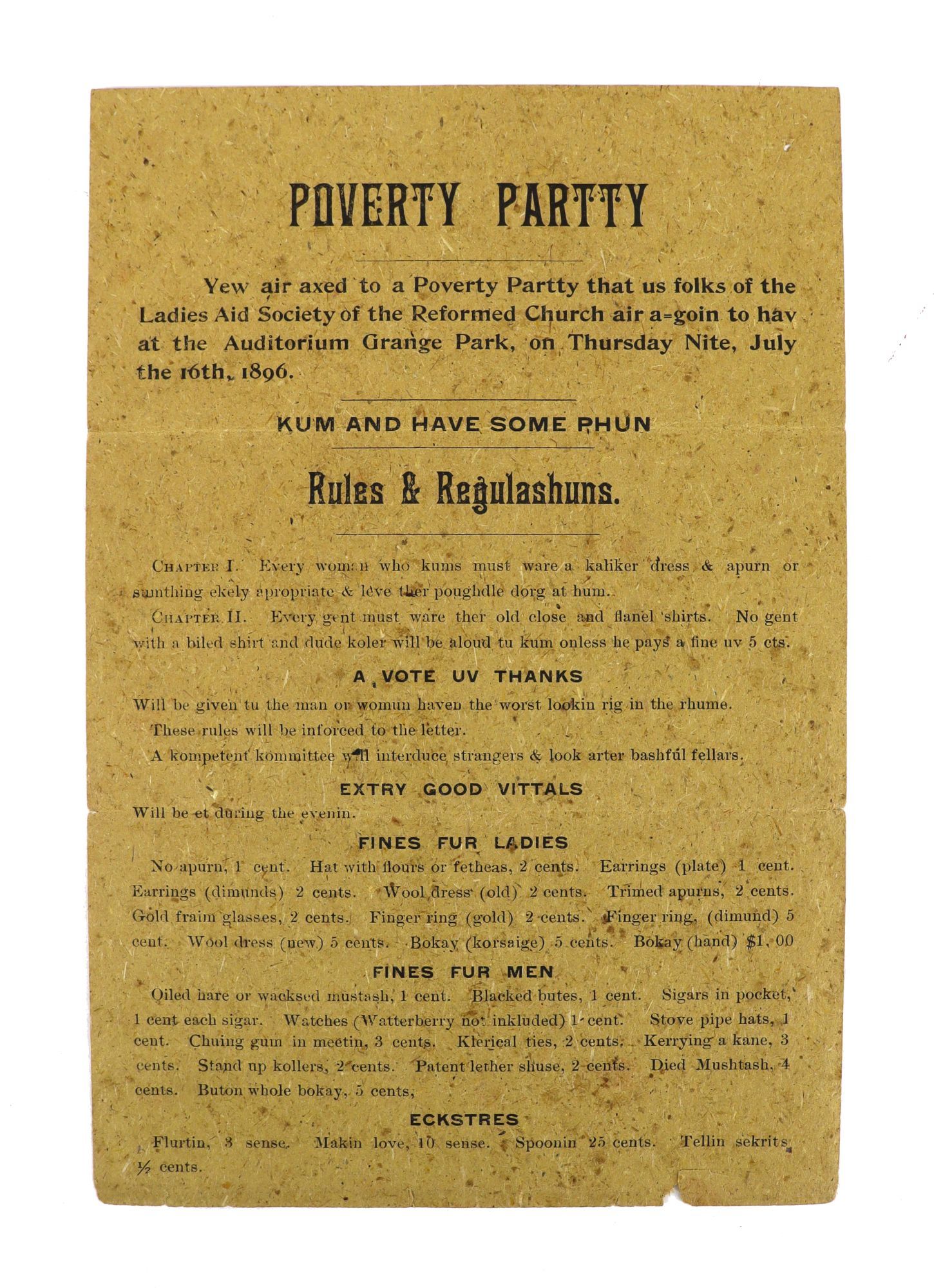An artifact of the Gilded Age trend of the Poverty Party in which the rich would dress up and try to raise money for the poor, but the condescending insensitivity of the time and the trend is on full display here. The invitation outlines the rules of attendance and the dress - women must "leve ther poughdle dorg at hum." Fines are listed for violating the dress code and at the end are "Eckstres," being "Flurtin, 3 sense" and "Spoonin 25 cents." While we have not located the party precisely, we believe it is likely the Grange Park near Allentown, PA. We locate no records in OCLC.