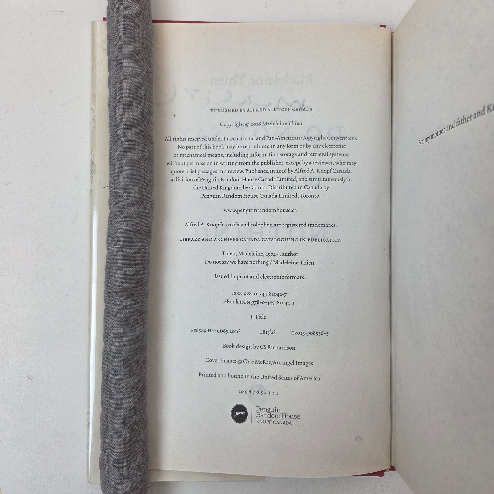Toronto: Alfred A. Knopf Canada, 2016. First Edition, First Printing. Hardcover. Octavo, 473 pages. In Very Good minus condition with a Very Good condition dust jacket. Spine red with white lettering. Dust jacket protected in mylar covering, price uncut; "CAN $35.00". Boards full bound in red cloth with small stain near tail of spine and mild shelfwear to edges of boards. Text block has mild age-toning to exterior and interior edges. Flat signed by author to title page. Shelved in Room B. 1406705. Special Collections.