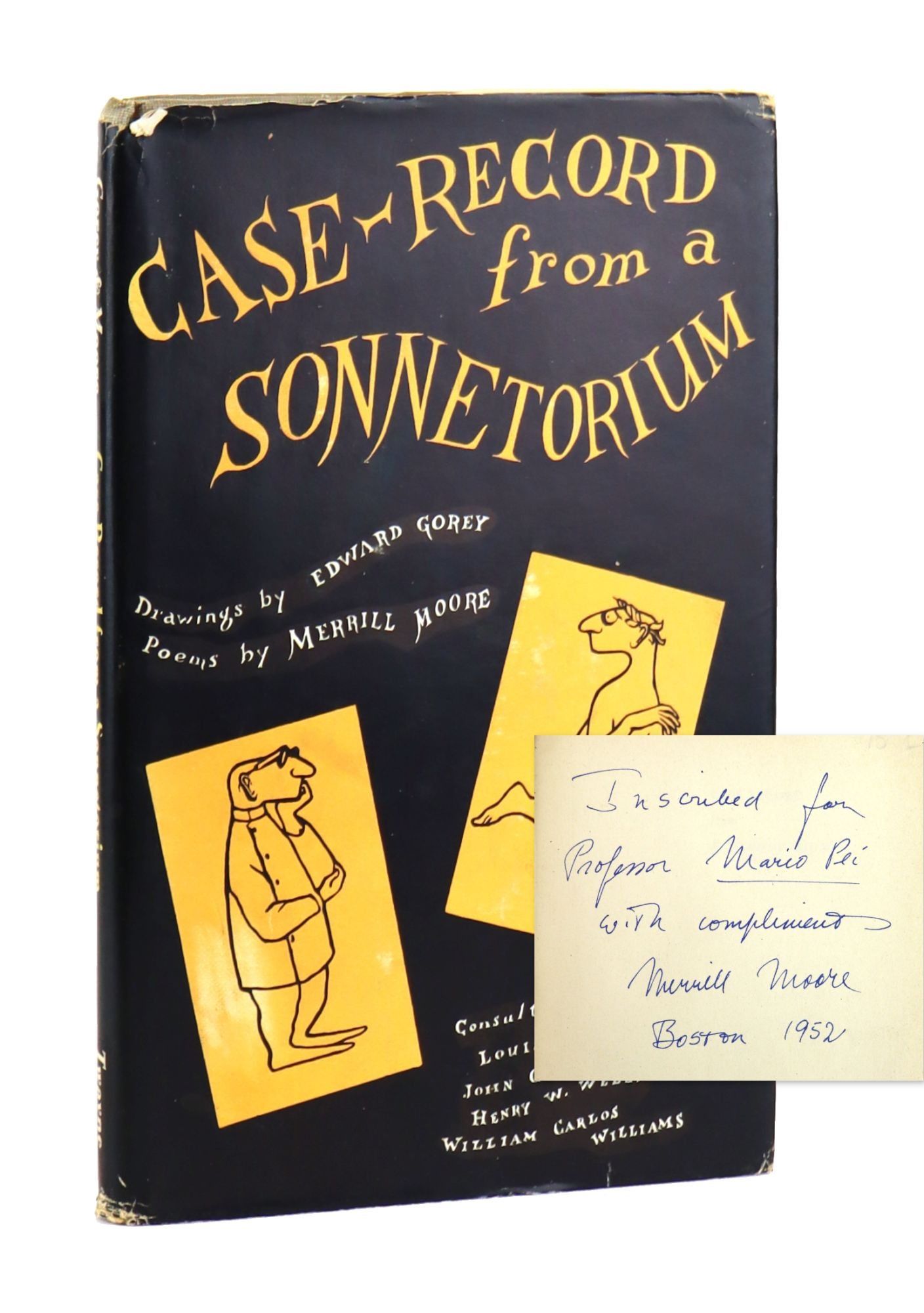 Signed with inscription on front free endpaper by poet Merrill Moore to Columbua University professor, Mario Pei: "Inscribed for Professor Mario Pei with compliments, Merrill Moore, Boston 1952." This was the third collaboration between illustrator Edward Gorey and poet Merrill Moore, the first one being 1950's "Clinical Notes," which was Gorey's first commercially published book. Goreyography, B3.