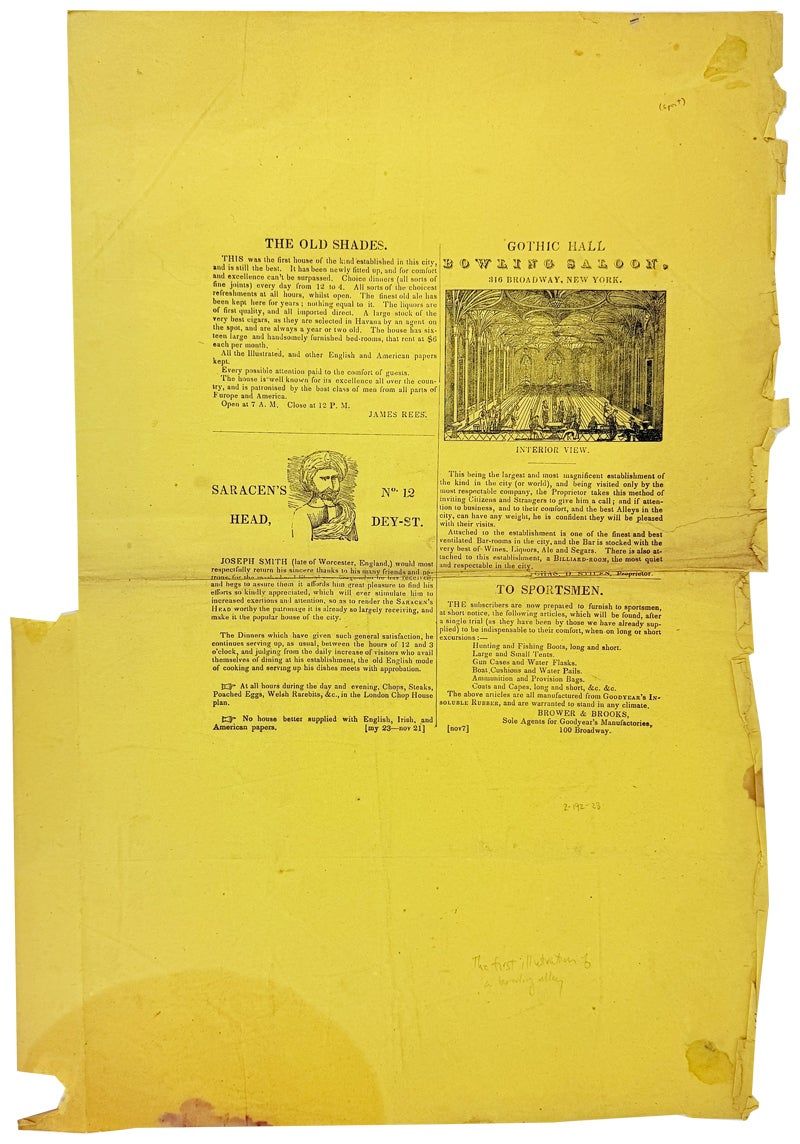 Untrimmed advertising circular to four local New York City establishments, including one of the earliest interior views of a bowling alley. Gothic Hall Bowling Saloon, whose proprietor Chas. D. Stiles took over the premises in 1845, promised "one of the finest and best ventilated Bar-rooms in the city." Indeed, the woodcut illustration of the saloon shows high vaunted ceilings lined with pillars, the crowd of patrons (all men), enjoying six lanes, drinks, and a spot to read the paper.
