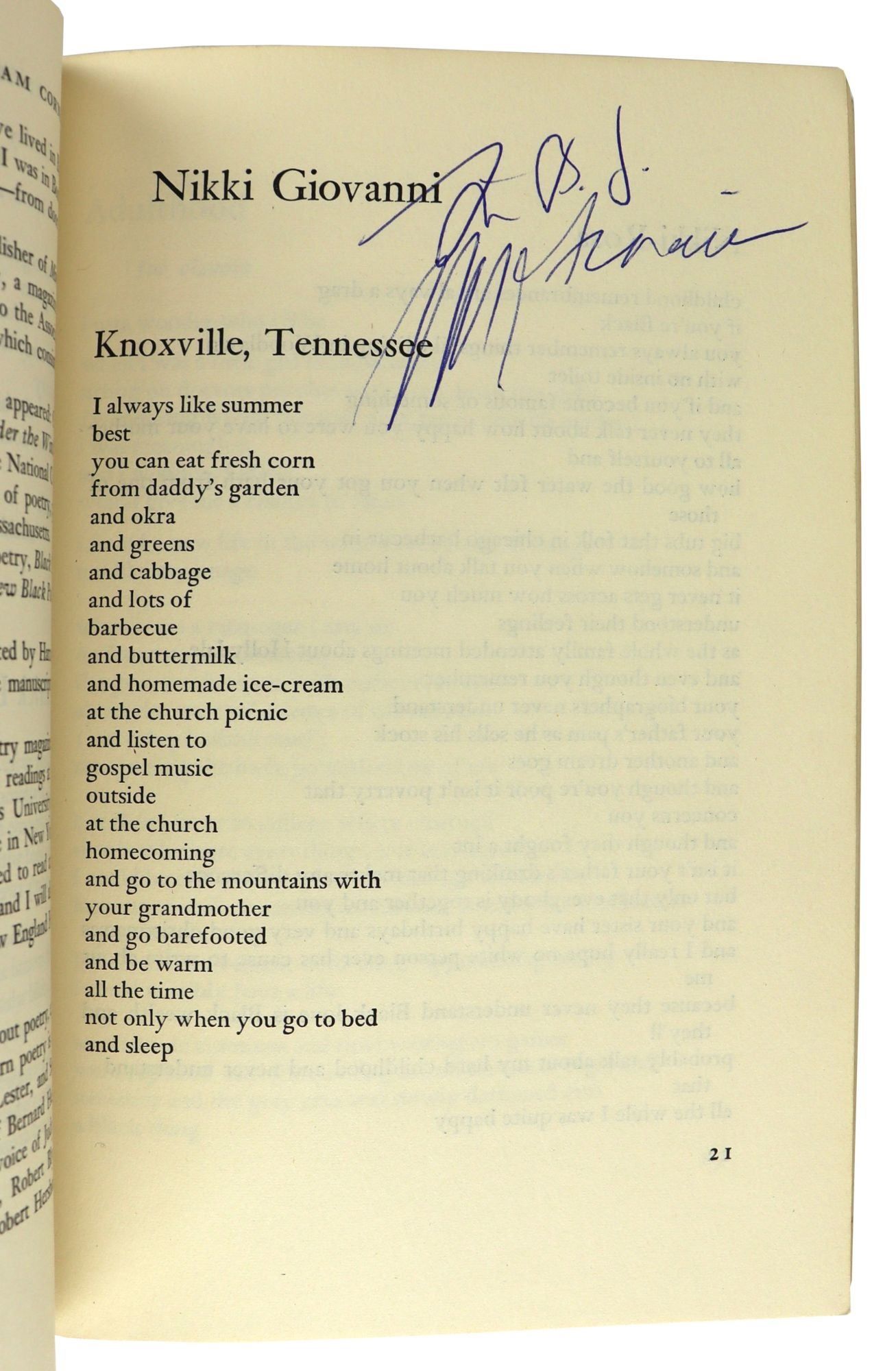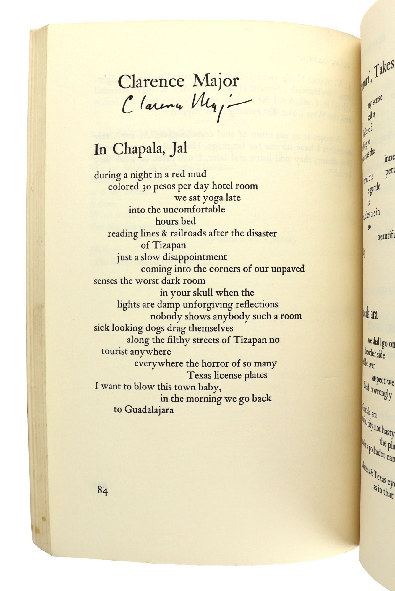 New York: Hill and Wang, 1970. Very Good-. New York: Hill and Wang, [1970]. First Edition, Wrapper Issue. Slim octavo (20.5cm); publisher's white pictorial card wrappers printed in red and green; x,181pp. Moderate wear and dust-soil to wrapper margins, else About Very Good. Signed by contributors Nikki Giovanni and Clarence Major on p. 21 and 84 respectively.
