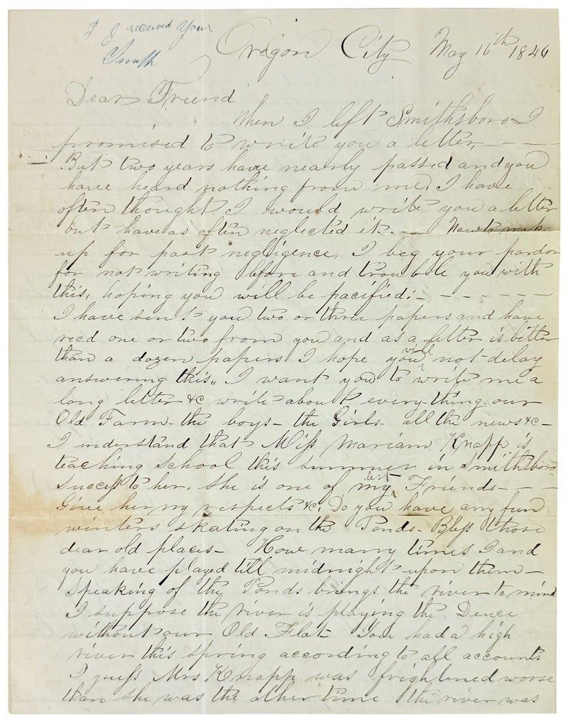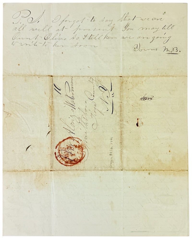 Oregon, IL, 1846. Very Good-. Oregon, IL: May 16th, 1846. Autograph letter signed by M.B. Light and dated Oregon City [Illinois], May 16, 1846, addressed to Alonzo Waterman of Smithboro, Tioga County, New York. Bifolium (26x20cm) filled to completion on three panels, the rear panel with postal information and rubber-stamp as well as a short postscript. Brief splitting to previous mail folds, moderate soil from handling, else a Very Good example.