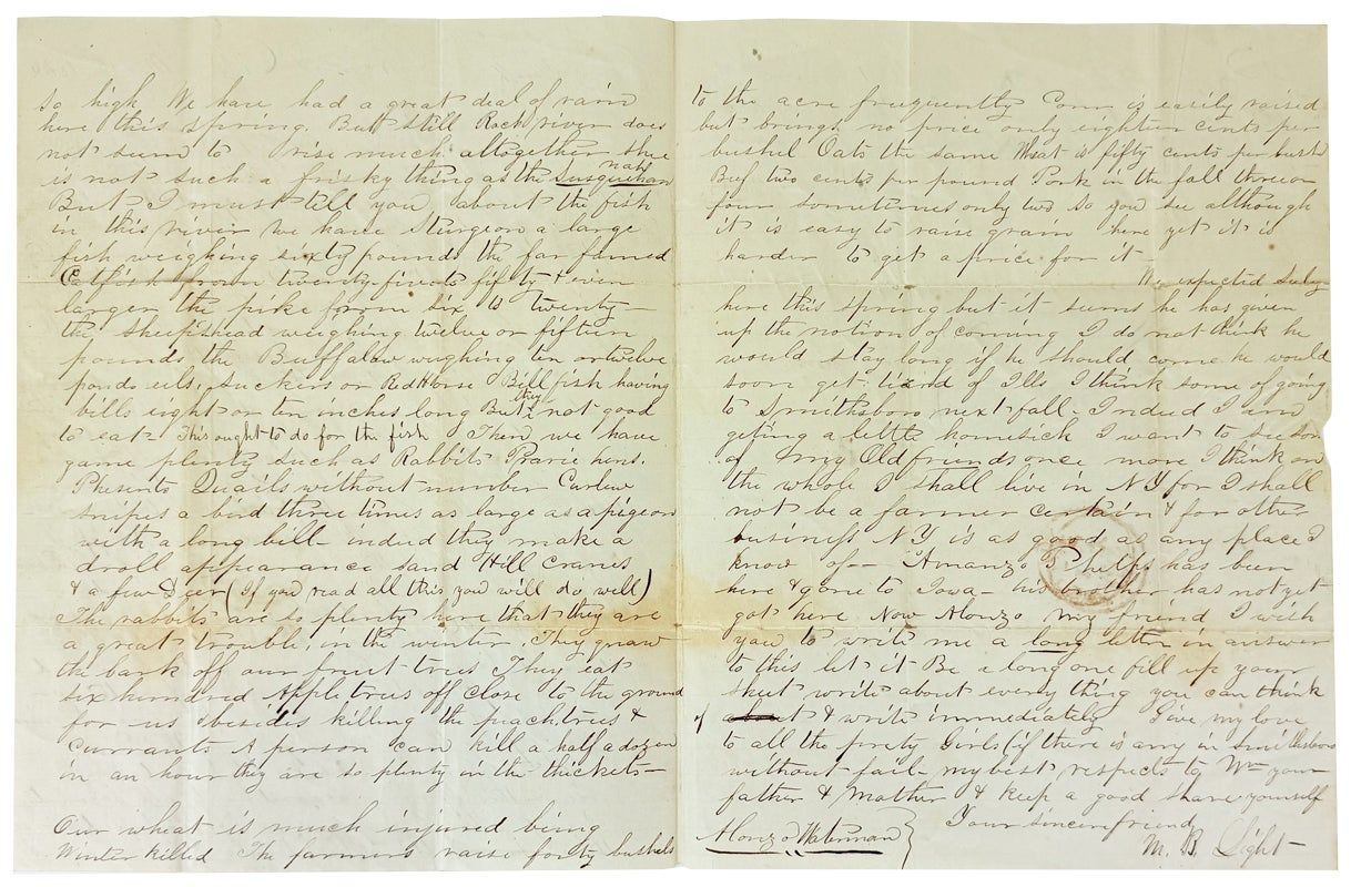 On farming Light writes, "Our wheat is much injured being winter killed The farmers raise forty bushels to the acre frequently corn is easily raised but brings no price only eighteen cents per bushel Oats the same Wheat is fifty cents per bushel Beef two cents per pound Pork in the fall three or four sometimes only two so you see although it is easy to raise grain here it is harder to get a price for it." Light concludes his letter describing his homesickness for Smithboro, hoping to return there soon for good.