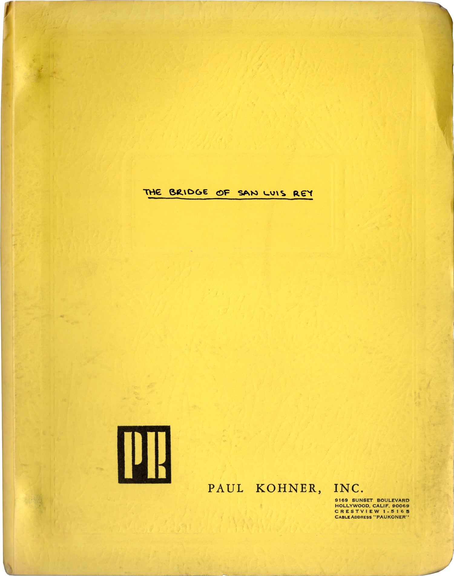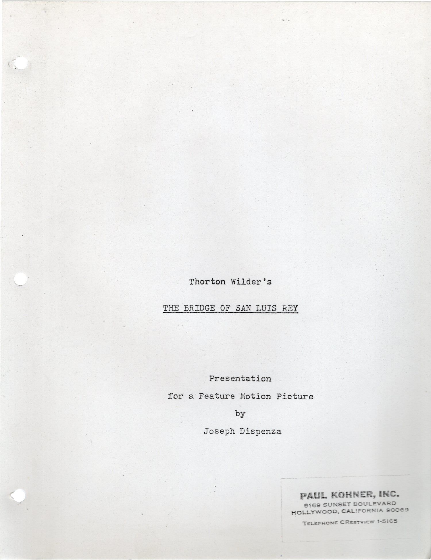 Yellow titled wrappers. Title page present, with credits for author Thorton Wilder, and screenwriter Joseph Dispenza. 42 leaves, with last leaf of text numbered 40. Xerographically duplicated, rectos only. Pages Near Fine, wrapper Near Fine, bound internally with two gold brads.