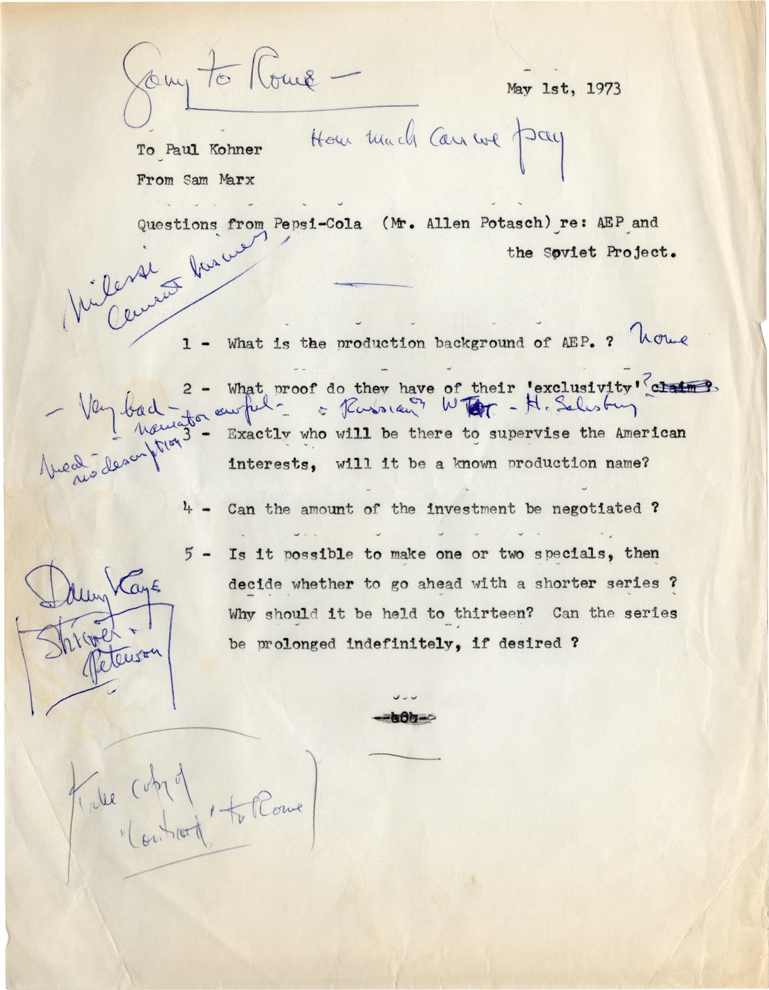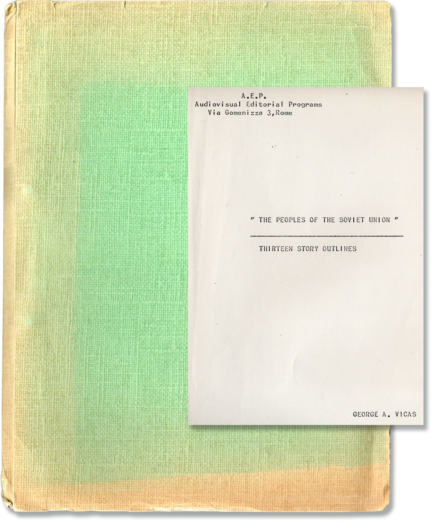 Rome: Audiovisual Editorial Programs, 1973. Treatment script for an unproduced thirteen-part documentary series. Laid in with the script is a prospective budget for the film in English, and an overview of the film in Italian, as well as a typed letter from producer Sam Marx to casting agent Paul Kohner, with manuscript ink annotations likely written by Kohner.