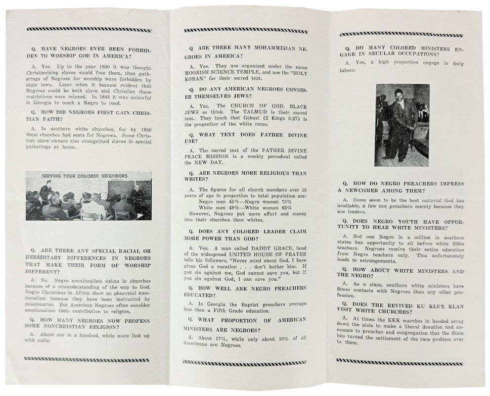 Brochure issued by the Atlanta branch of the Carver Bible Institute, "The faith Bible school for colored Christians in Southeastern States." The questions and answers are primarily concerned with the history of African-Americans and the Christian church, beginning with "Have Negroes ever been forbidden to worship God in America" (Answer: Yes). Another question asks, "How many Negroes now profess some nonchristian religion"?" (Answer: "About one in a hundred, while more link up with cults").